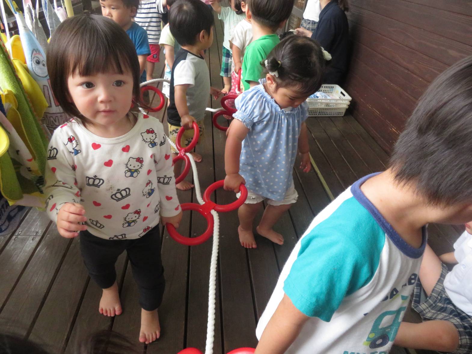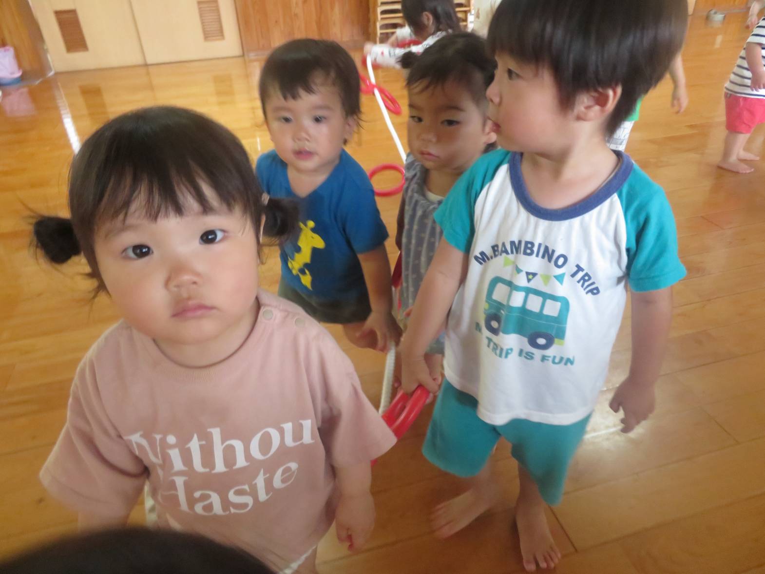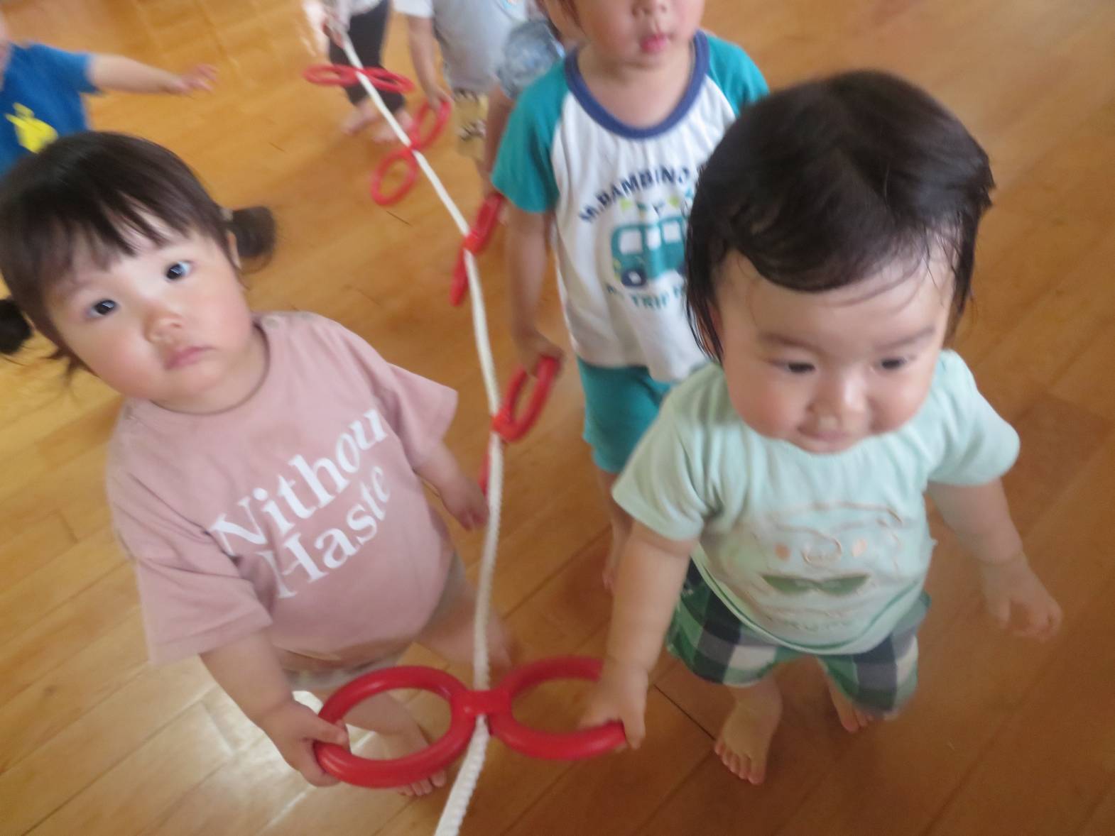みんなでお散歩ができるようになってきているこあら組さん! 輪っかを握ると保育者の誘導でしっかりと進むことができます。 テラスを歩き、大きい組さんのお部屋を見ると、「きりん!」と、きりんの絵を指差したり、「バイバーイ!」と、他のクラスの友だちに手を振ったりして楽しむ姿が見られました。 散歩をした後は、ニコニコ笑顔で溢れる子どもたちでした!