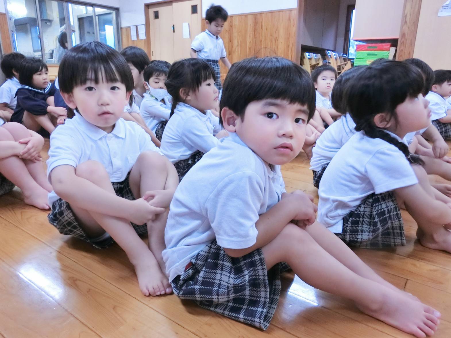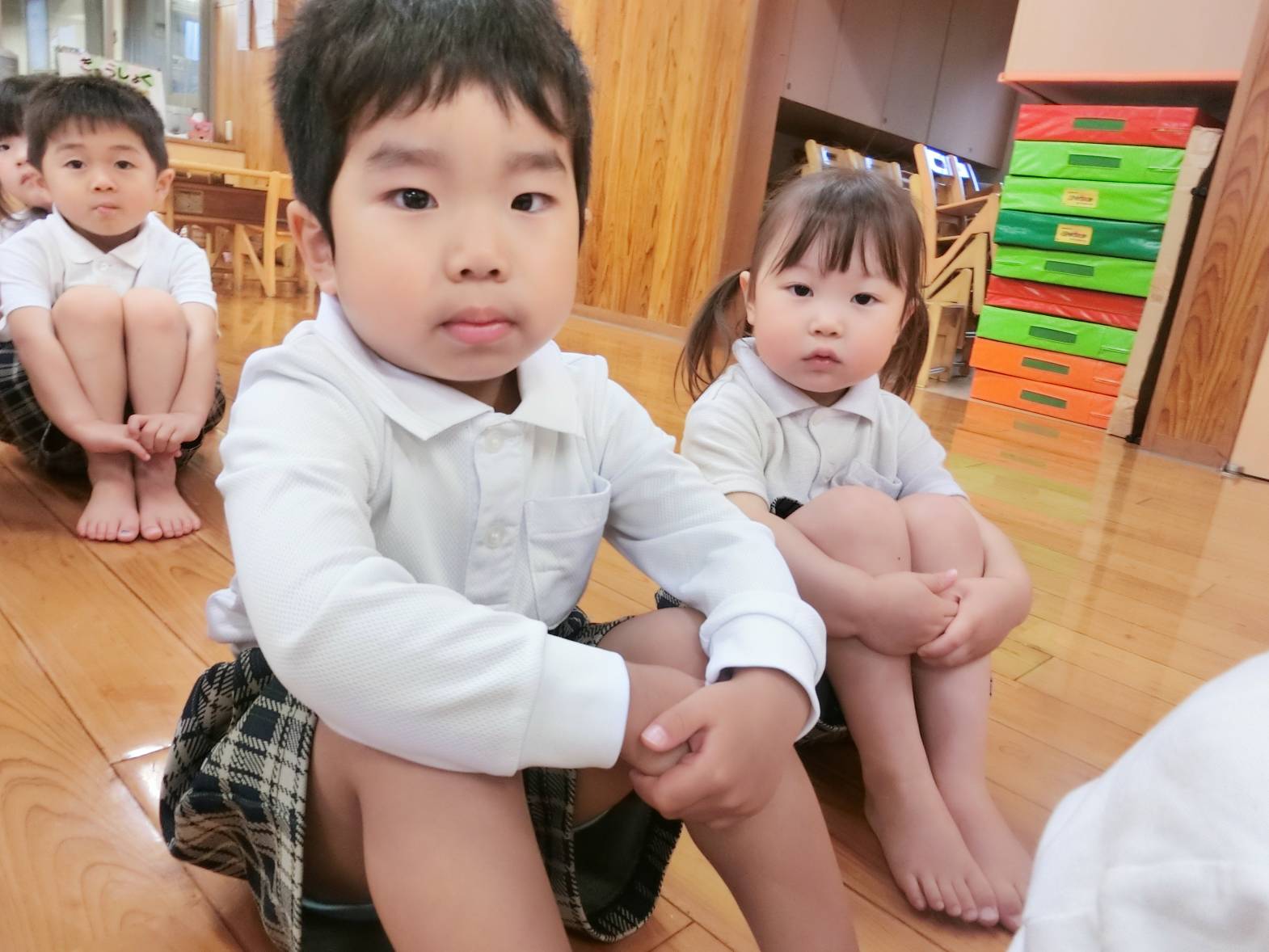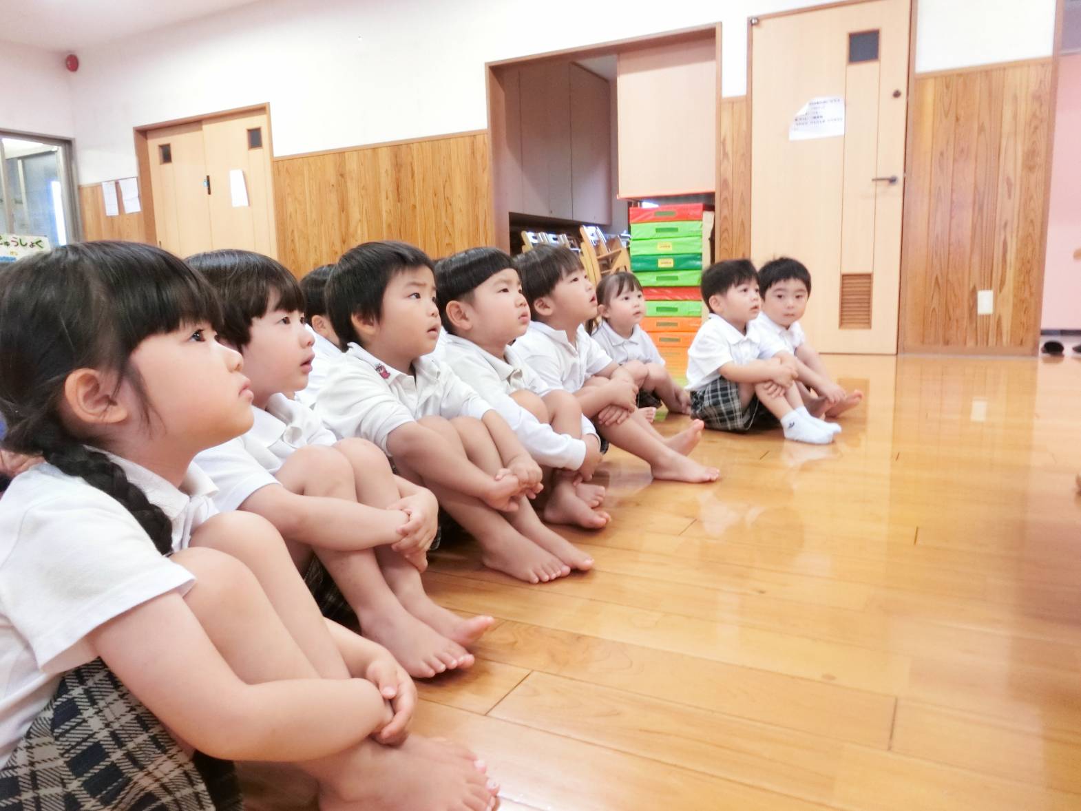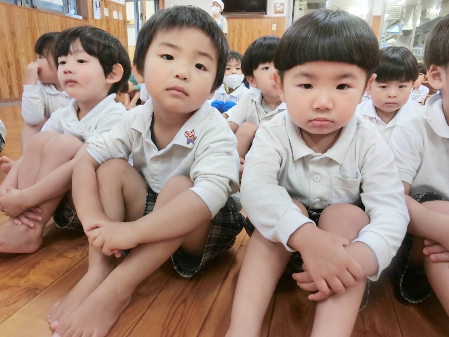 りす組になりお話会に参加しています。 今回は、“バムとケロの日曜日”、“ドングリほいくえん”、“おばけびょうきになる”のお話を見ました。 お話会を通して少しずつ、集中力が養われているりす組さん。体操座りで、静かに絵本を見ます。 お話会後に振り返りを行うと、「病院に行ったら、泣かないでできるよ。」、「お店屋さん楽しそうだったね。」、「おばけの絵本だったよね。」と内容についても理解している様子が見られました!