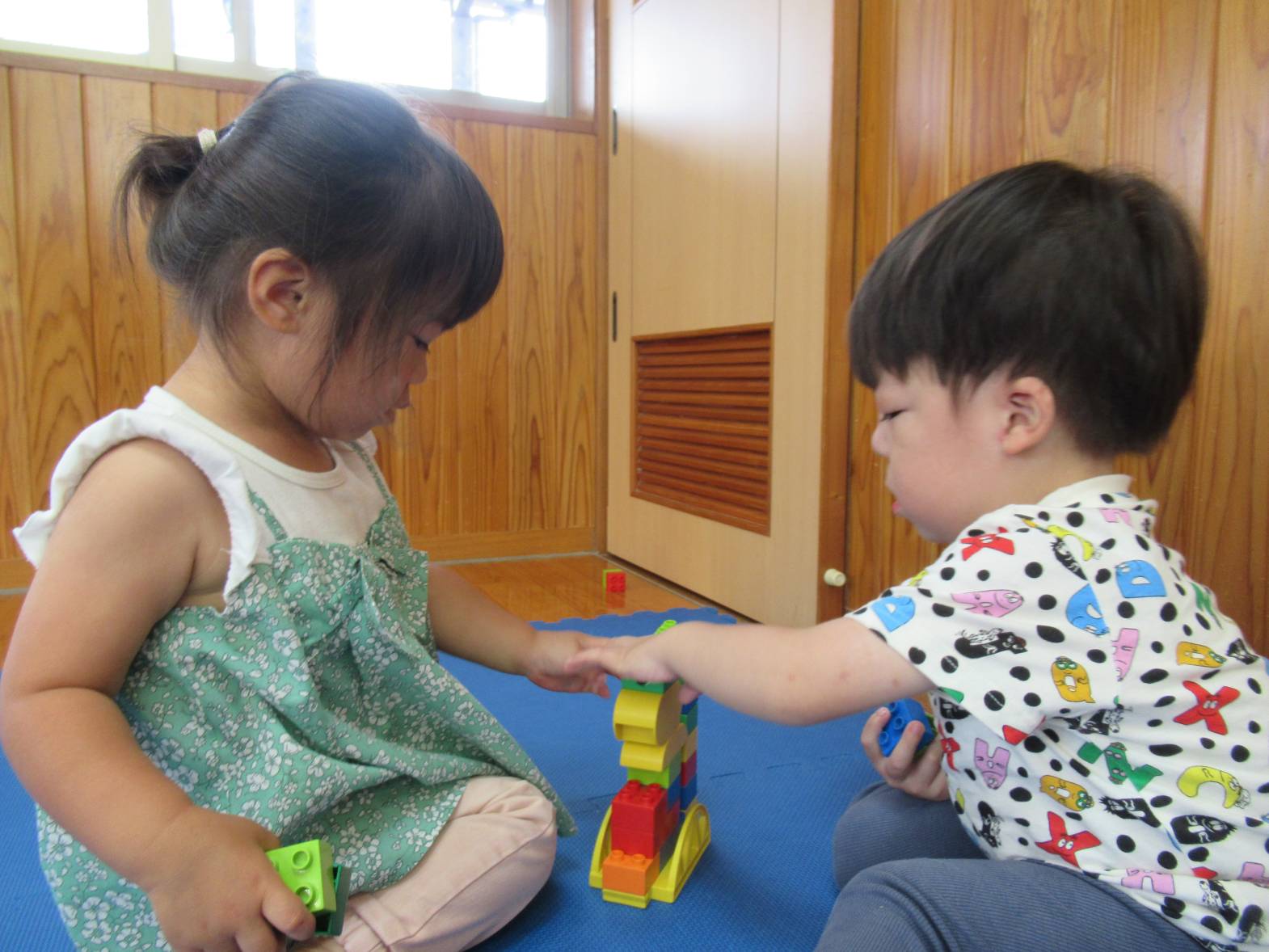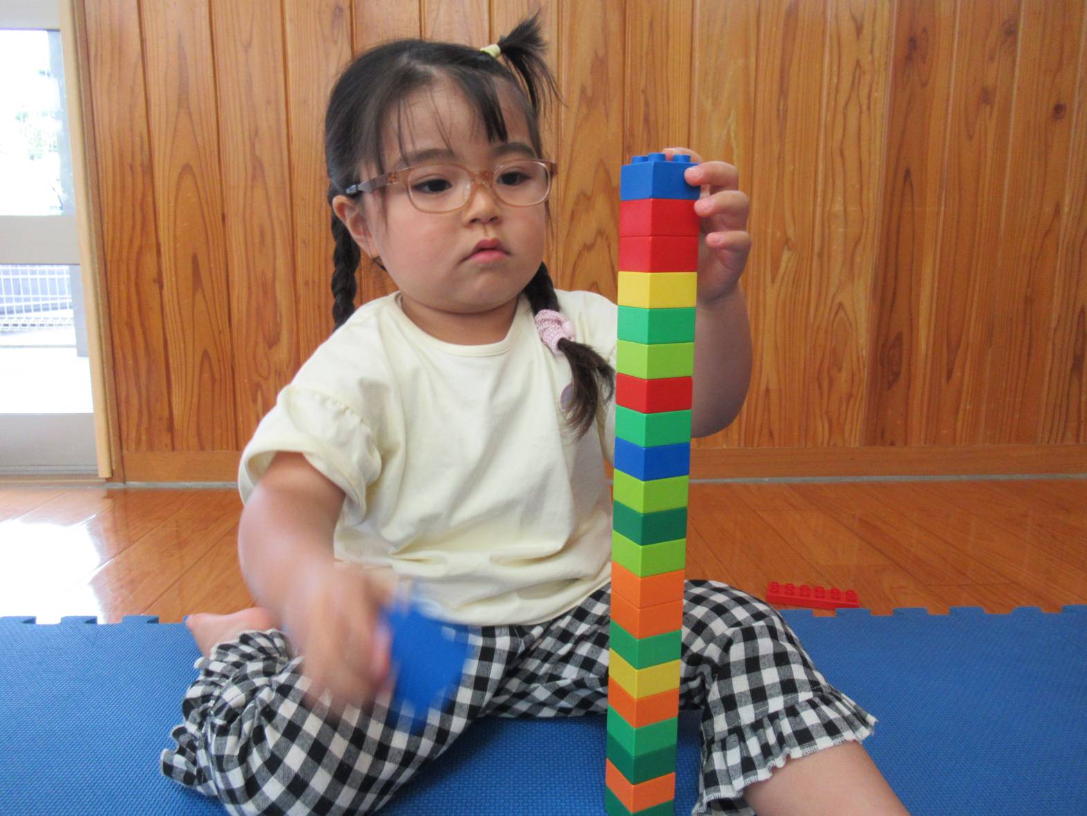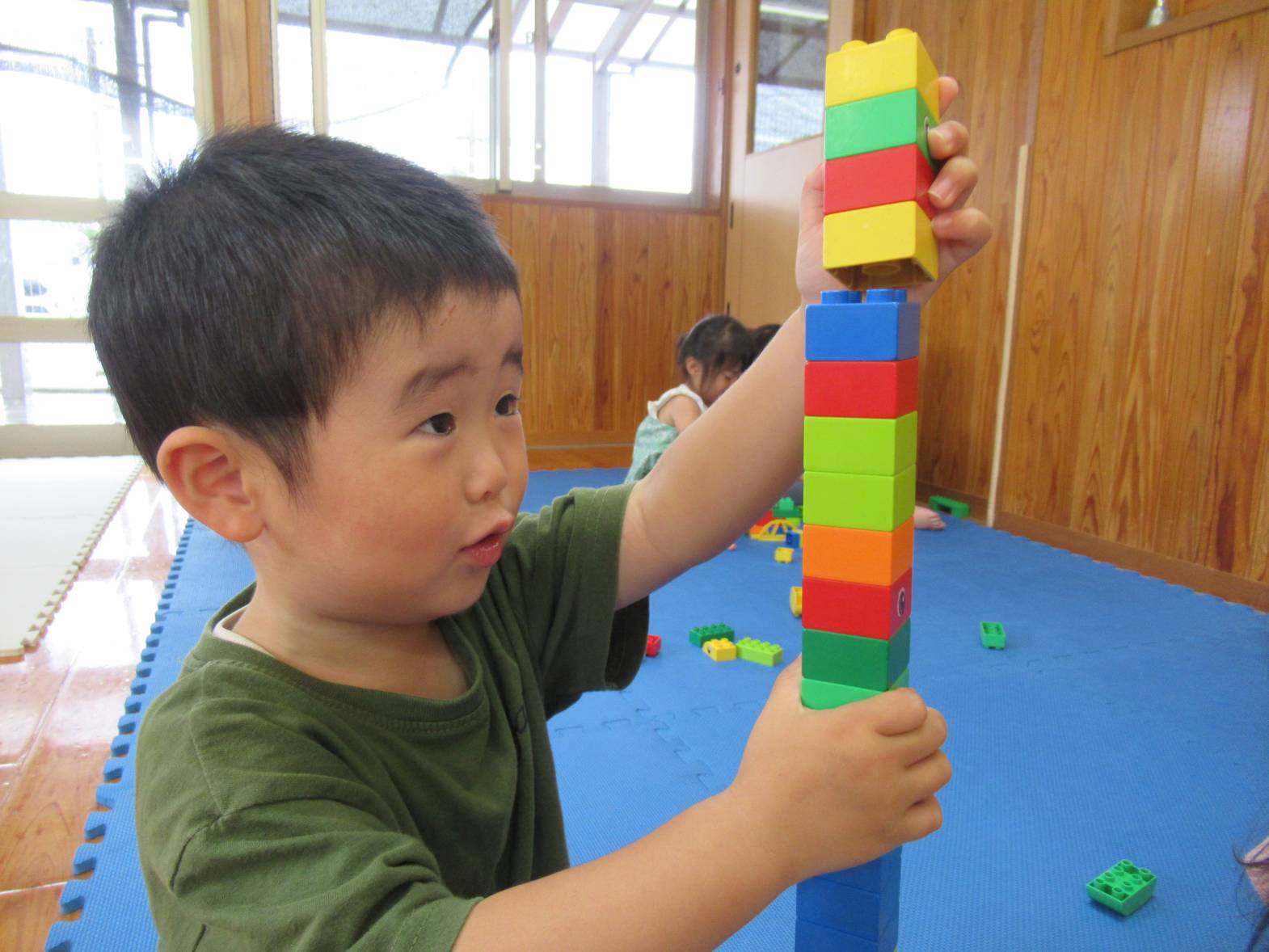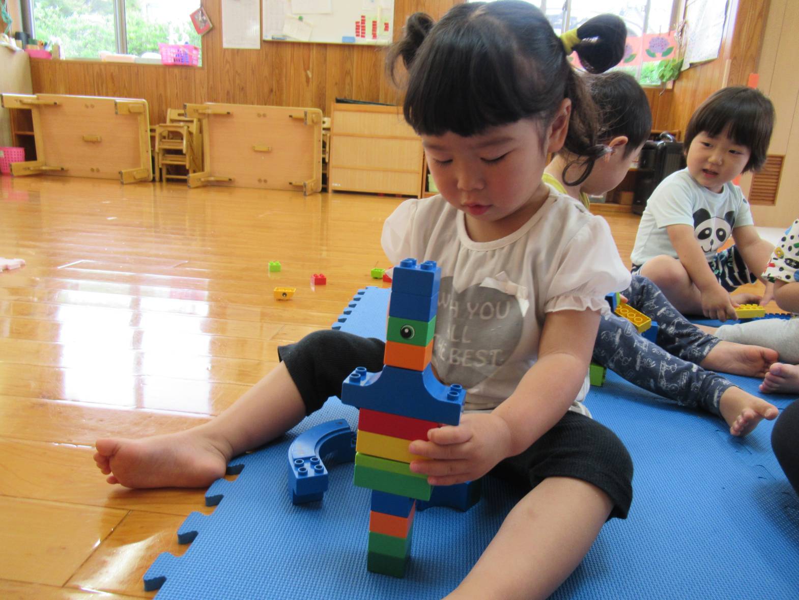雨の日が続き、室内で過ごすことが多くなっています。 室内遊びでは、様々な形のレゴブロックを組み合わて遊ぶ子どもたち。 「高くなったよ!」と高く積み重ねてみたり、「一緒に遊ぼう!」と友だちを誘って遊んだりする姿が見られます。 創造性も豊かになり、様々な形に組み合わせることを楽しんでいるぱんだ組さんです。