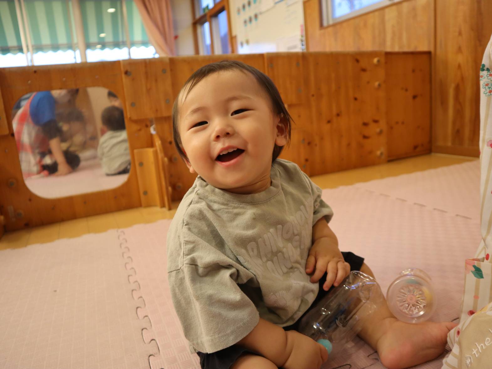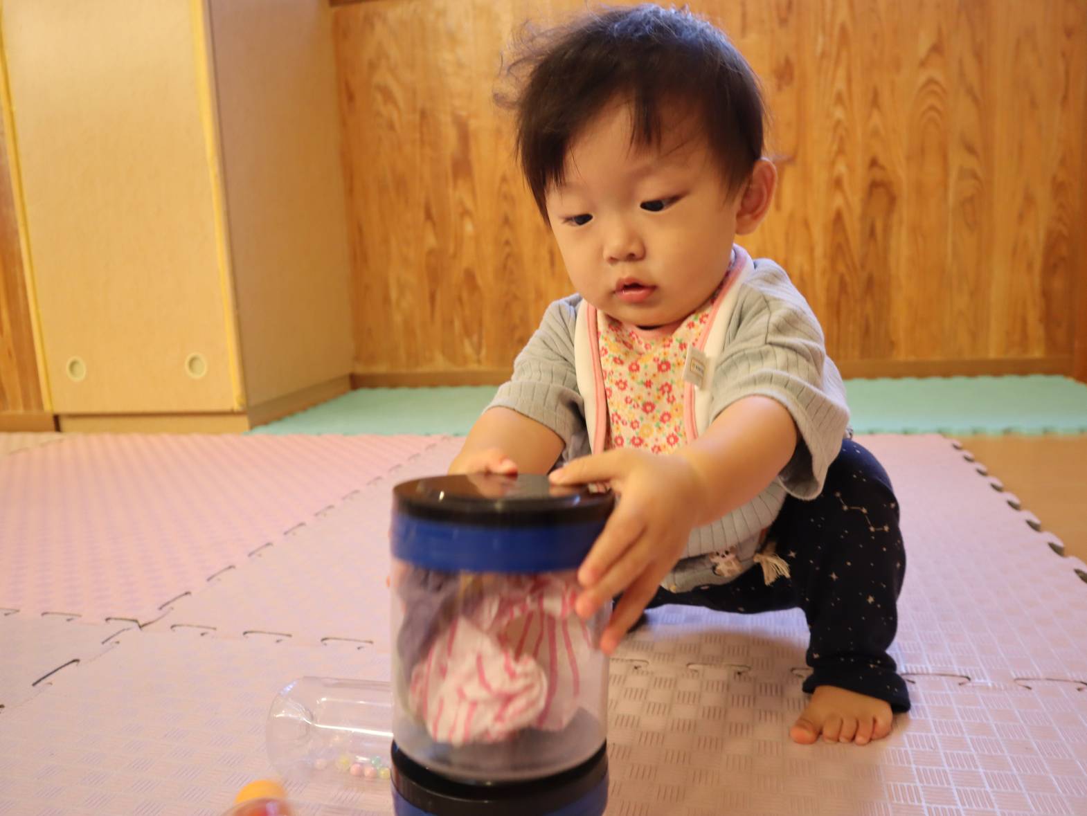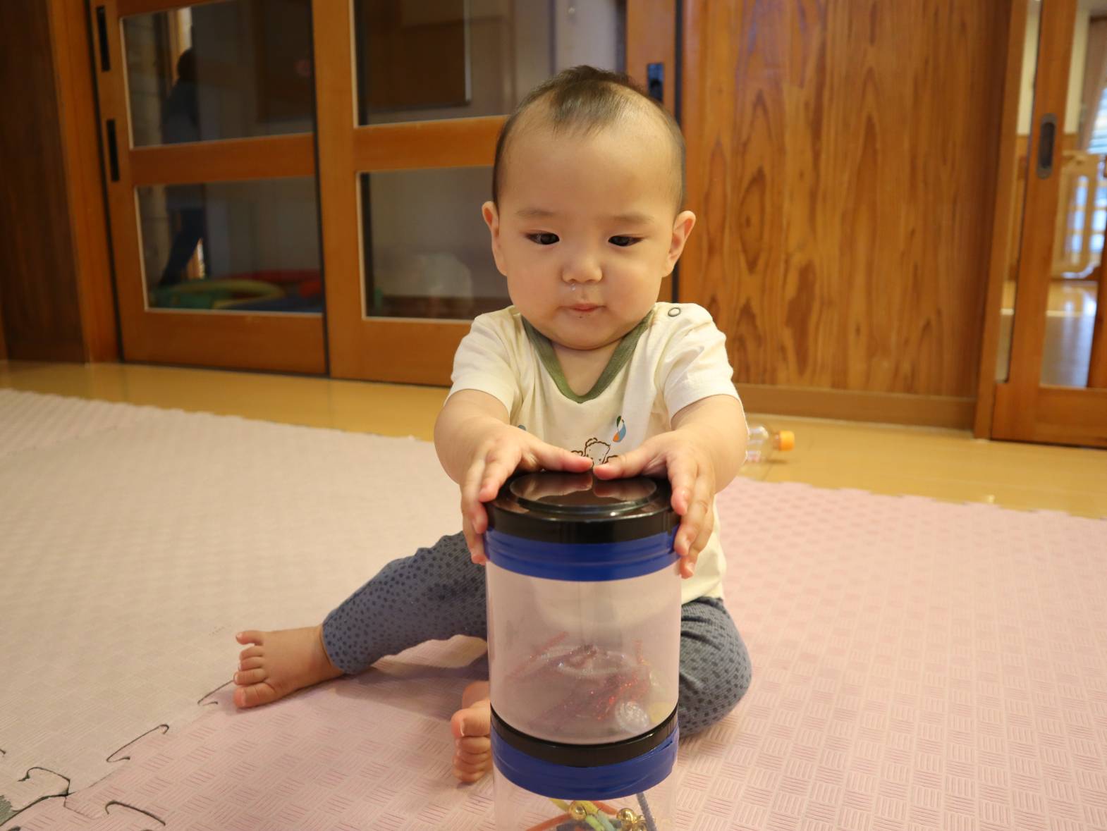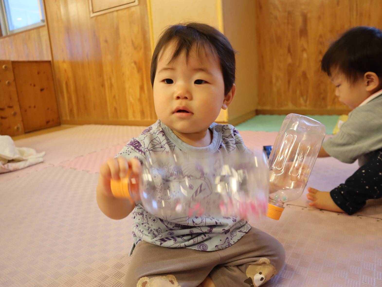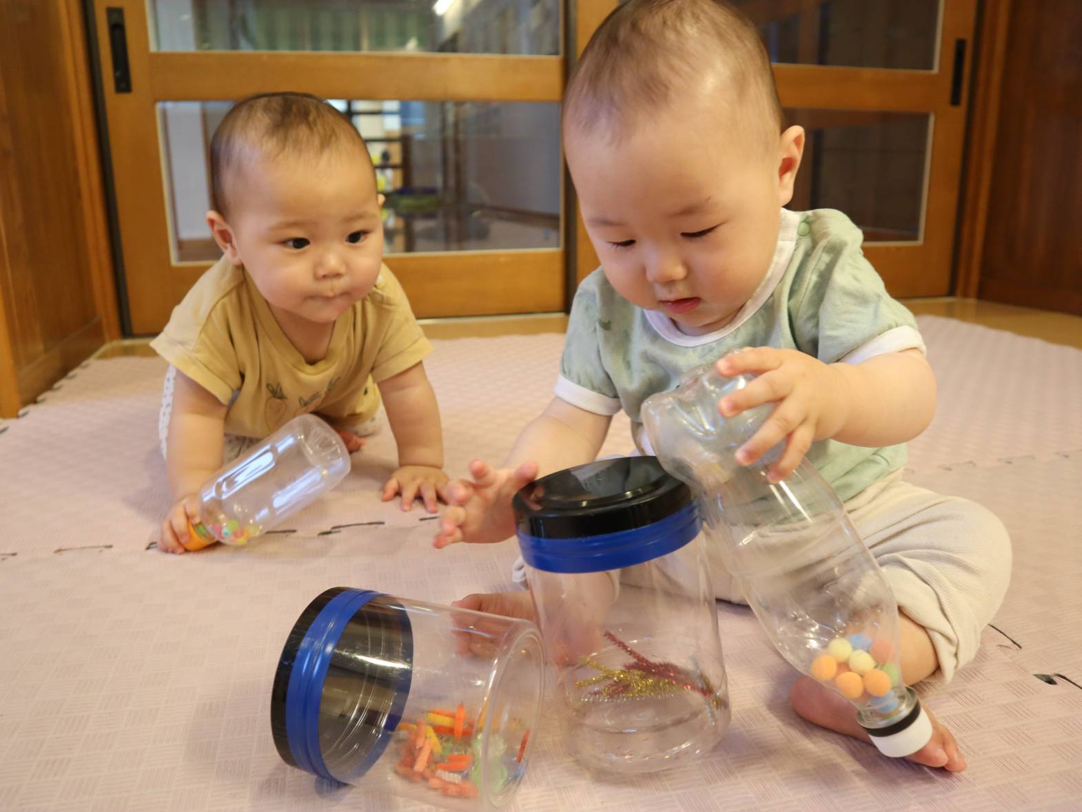 ひよこ組では、ペットボトルや海苔の容器に、ビーズや鈴等の様々な素材を入れている玩具が大人気! 容器を積み木のように積み上げたり、両手に持ってシャカシャカ振ったりする姿が見られます。 中に入っている素材で音が違うことに気付くと、「あ!」と喜んで交互に振ったり、1つずつ音を確かめたりする子どもたち。 見た目でも音でも楽しめるよう、色んな素材を入れてみたいと思います!
