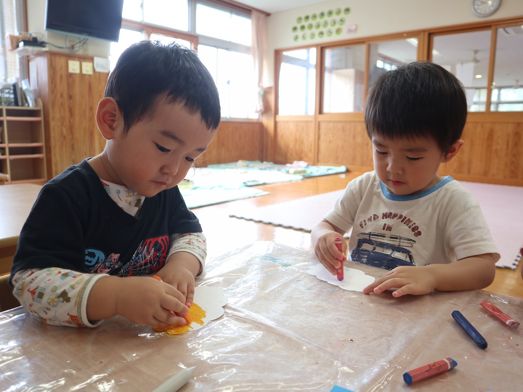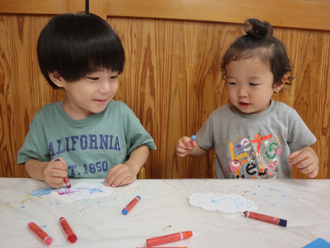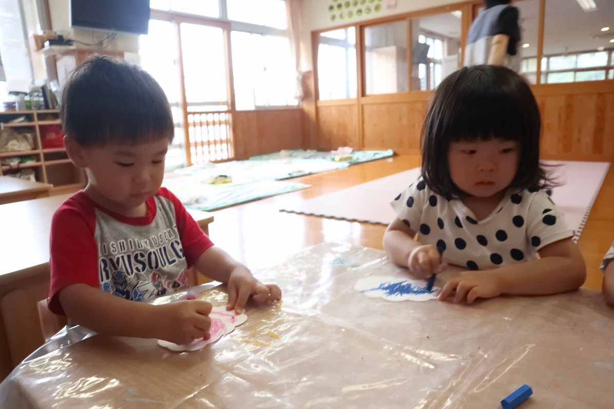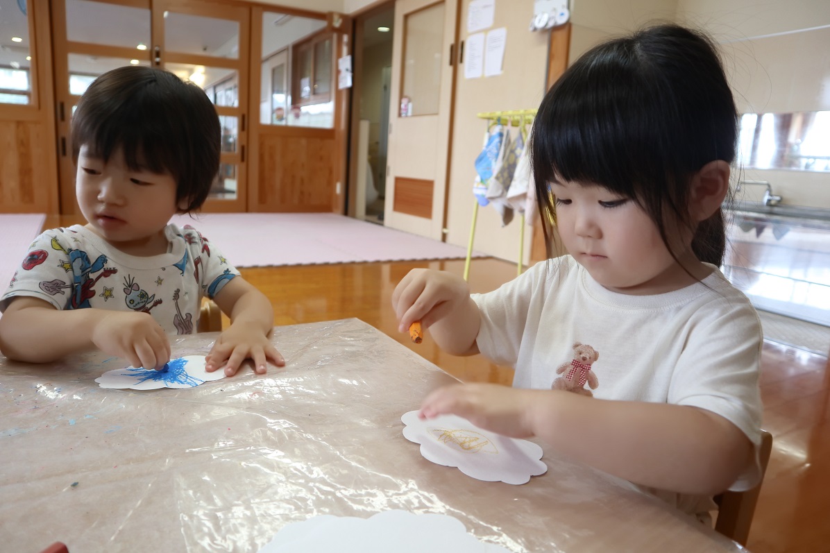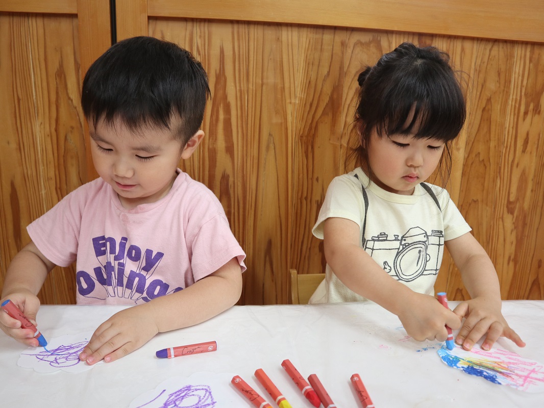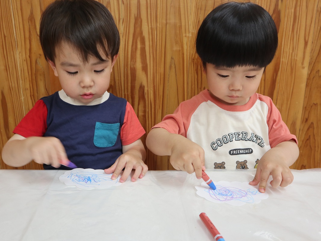 梅雨に入り、森の広場や街中では色とりどりのあじさいがきれいに花を咲かせています。 今回は、あじさいの製作を行いました。 あじさいの形に切った画用紙をもらうと、「雲みたいな形してるね!」「色塗っていいの?」と興味津々です。 それぞれ、「僕は青にする!」「いろんな色で塗ろう。」と想像力を膨らませながらクレヨンで描いていく子どもたち。 じっくり丁寧に塗っていき、色鮮やかでかわいいあじさいが完成しました! 園庭に行った際は、この時期の草花や生き物探しを子どもたちと楽しみたいと思います。