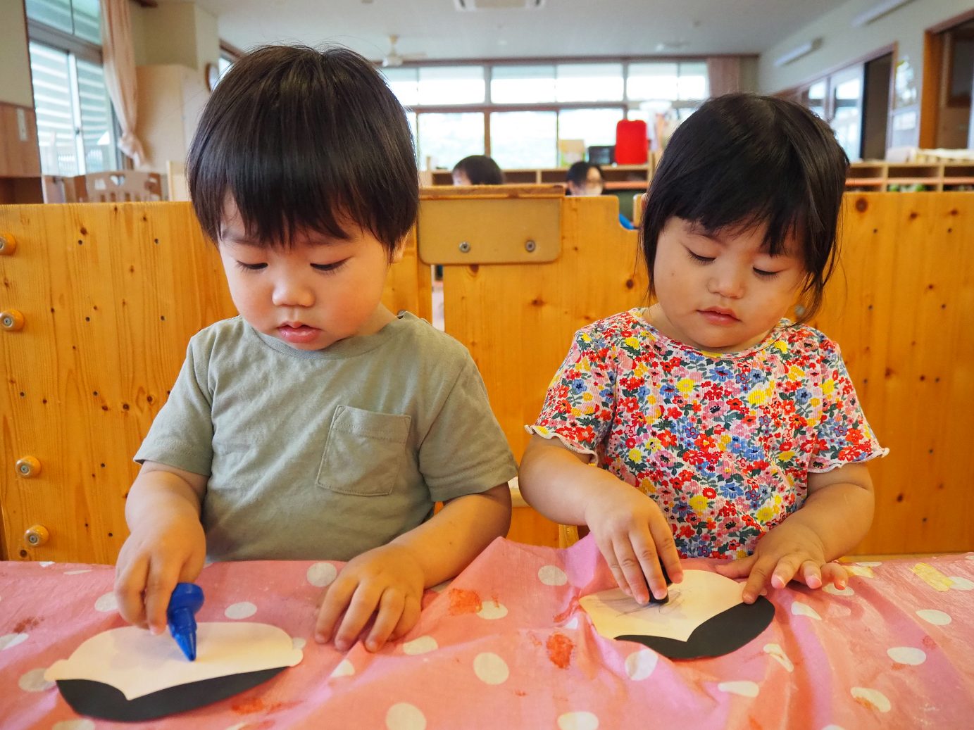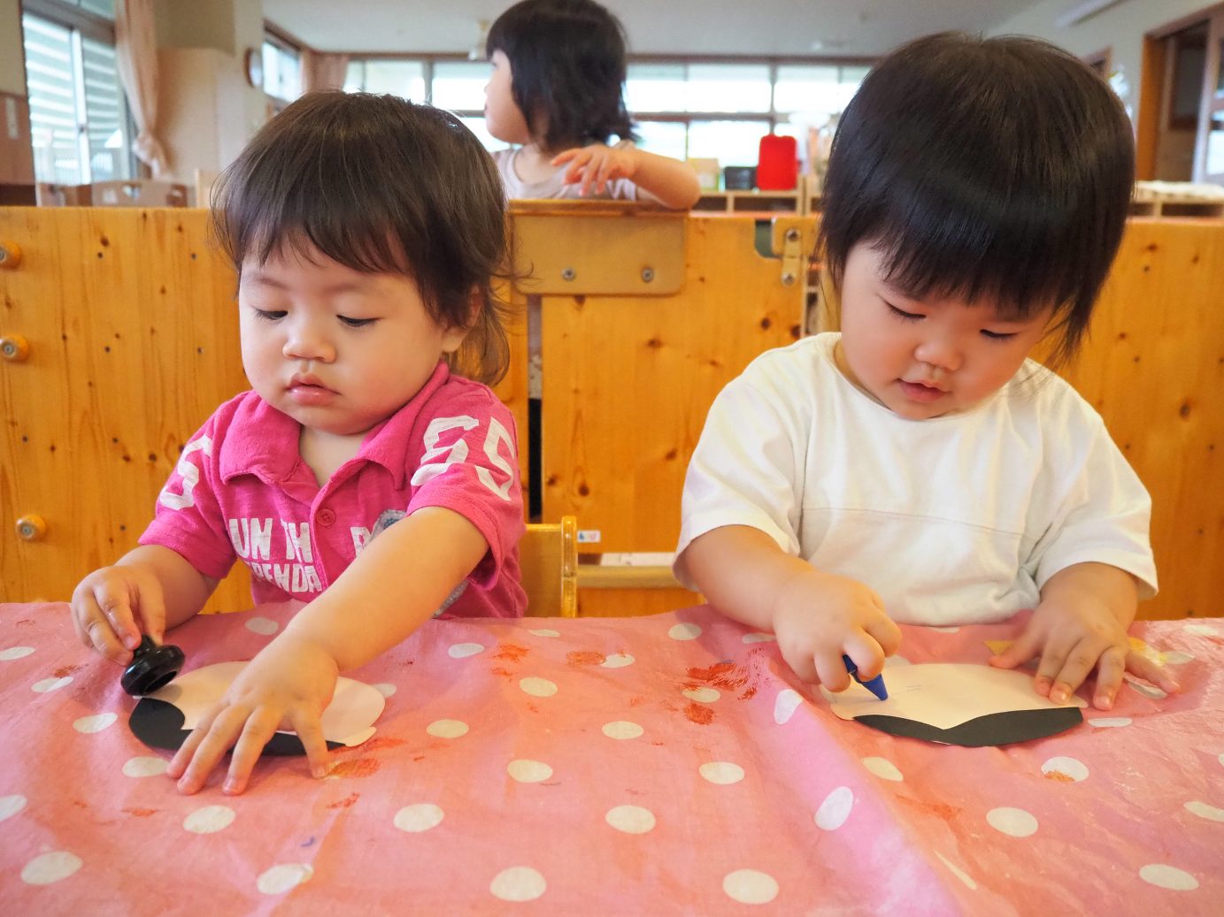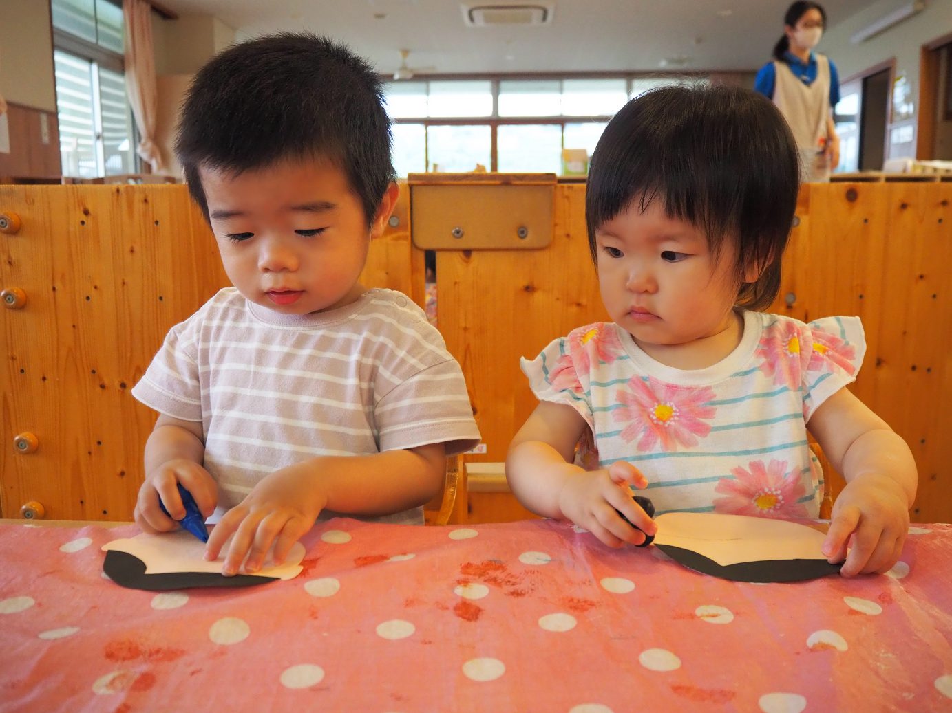 こあら組さんでは、父の日製作を行いました。見本を見せると、「パパ!」と目をキラキラさせながら興味を持つ子どもたち。 「お顔描いてみる?」と聞いてみると、みんな「はーい!」とクレヨンの色を選んで描き始める姿が見られました。 上手にクレヨンを持つと、「かきかき~。」、「まる~。」と声に出しながら画用紙いっぱいに描くことができました。また、友だち同士で見せ合いながら楽しく取り組む姿が見られました。 完成したお父さんの顔を「うふふ。」、「できた!パパだー!」と喜ぶ可愛らしい子どもたちでした♪