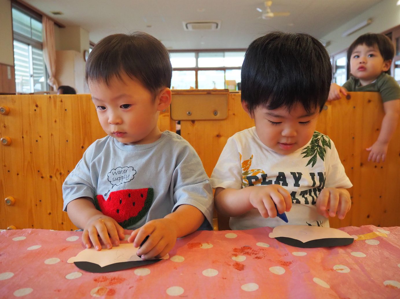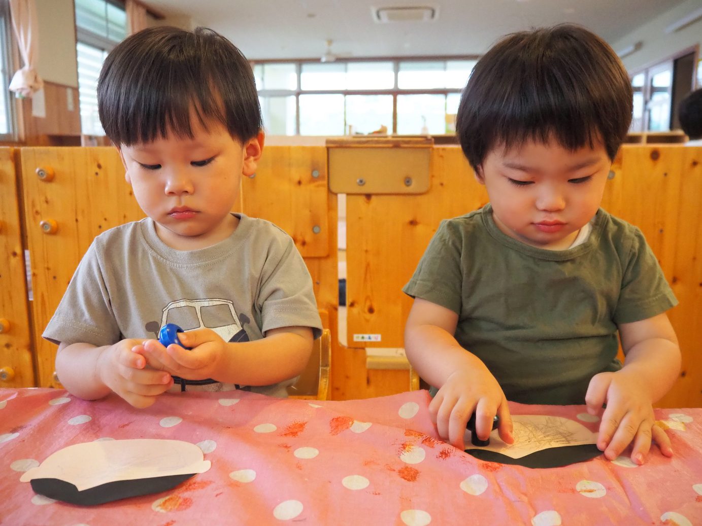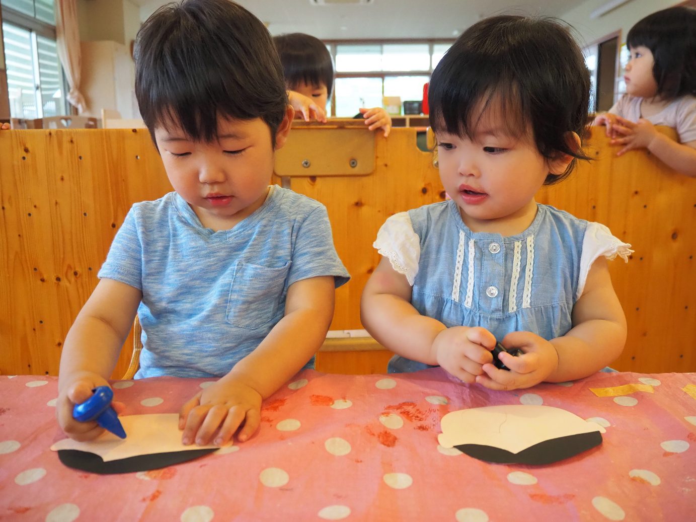 こあら組さんでは、父の日製作を行いました。見本を見せると、「パパ!」と目をキラキラさせながら興味を持つ子どもたち。 「お顔描いてみる?」と聞いてみると、みんな「はーい!」とクレヨンの色を選んで描き始める姿が見られました。 上手にクレヨンを持つと、「かきかき~。」、「まる~。」と声に出しながら画用紙いっぱいに描くことができました。また、友だち同士で見せ合いながら楽しく取り組む姿が見られました。 完成したお父さんの顔を「うふふ。」、「できた!パパだー!」と喜ぶ可愛らしい子どもたちでした♪
