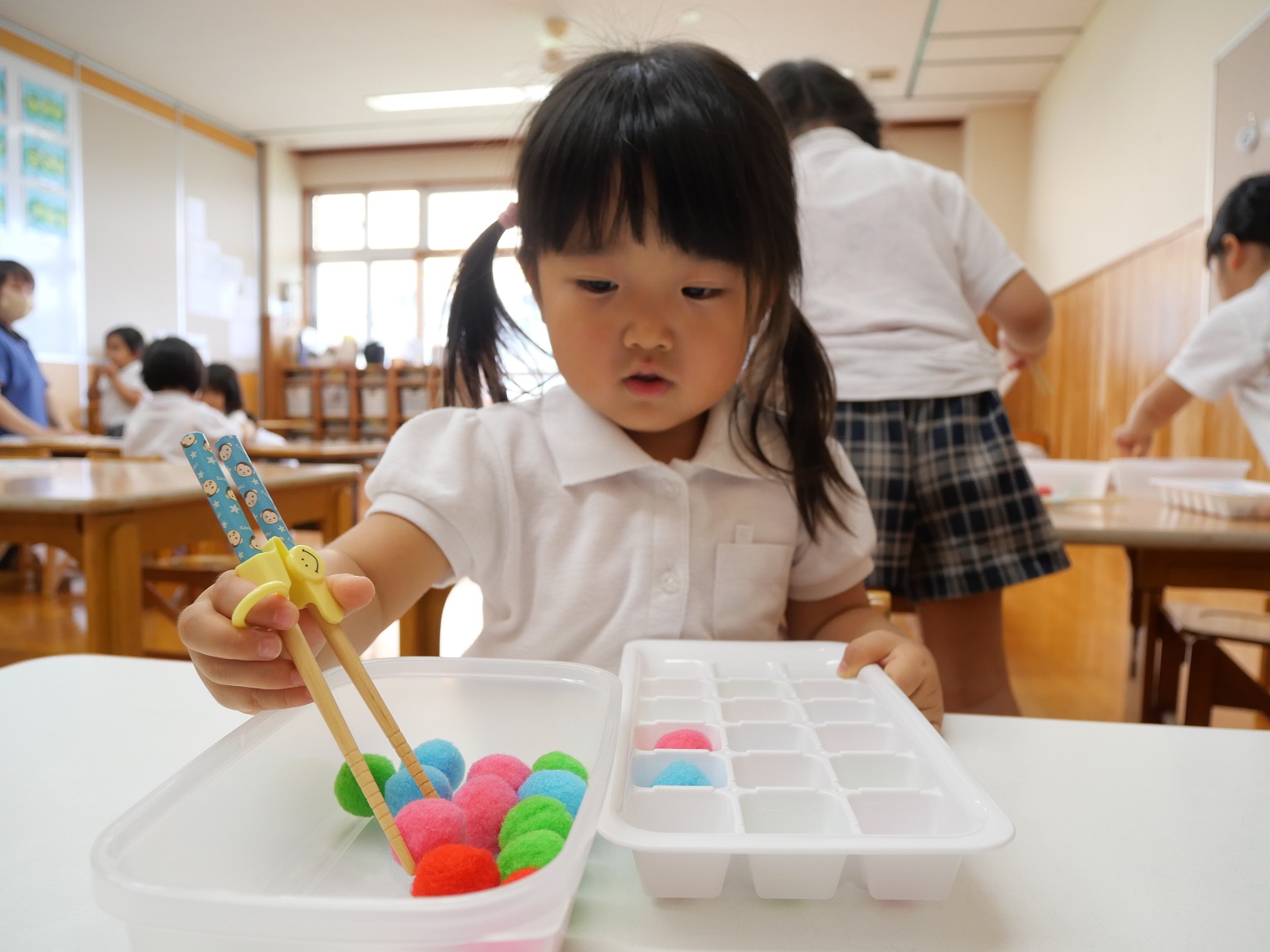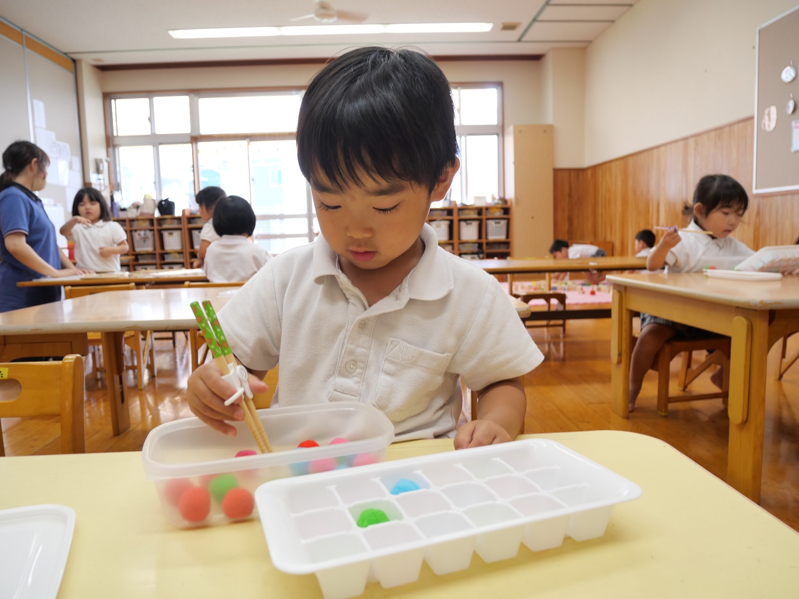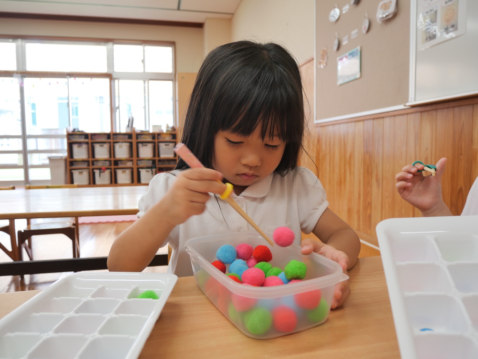 遊びの中で、箸を使用した活動を行っているりす組さん。 ボンボンを箸で掴み、同じ色の場所に入れていきます。 「これはここだね。」「赤はどこかな?」と、色をよく見ながら慎重に進めていく姿が見られました。 途中でボンボンが落ちそうになっても、「おっとっと。」「ゆっくりだよね!」ともう1度ボンボンを掴み直し、繰り返し挑戦していきます。 全部入れることができると「先生、見て!」「全部できたよ。」と、満足気な表情の子どもたちです。