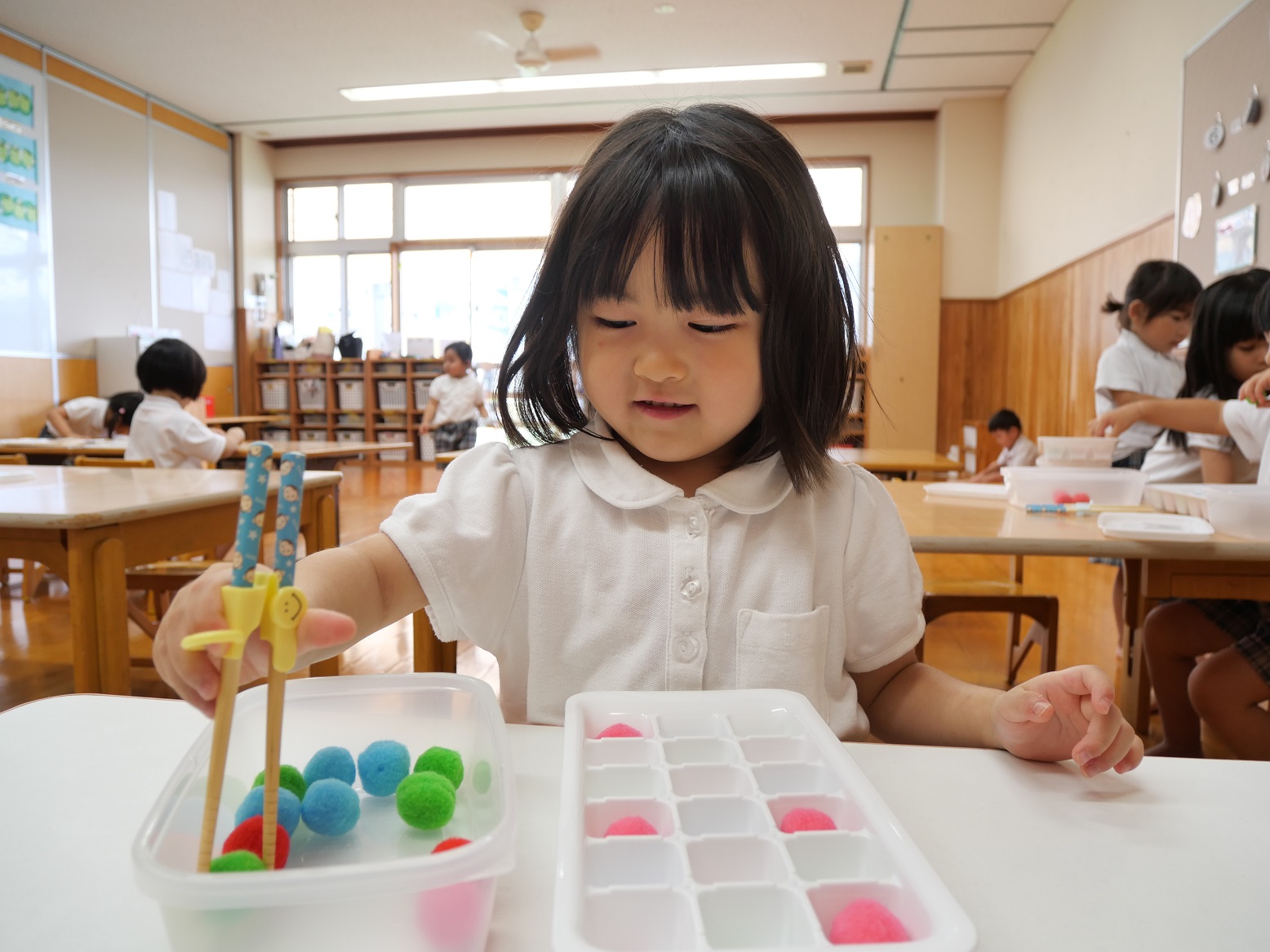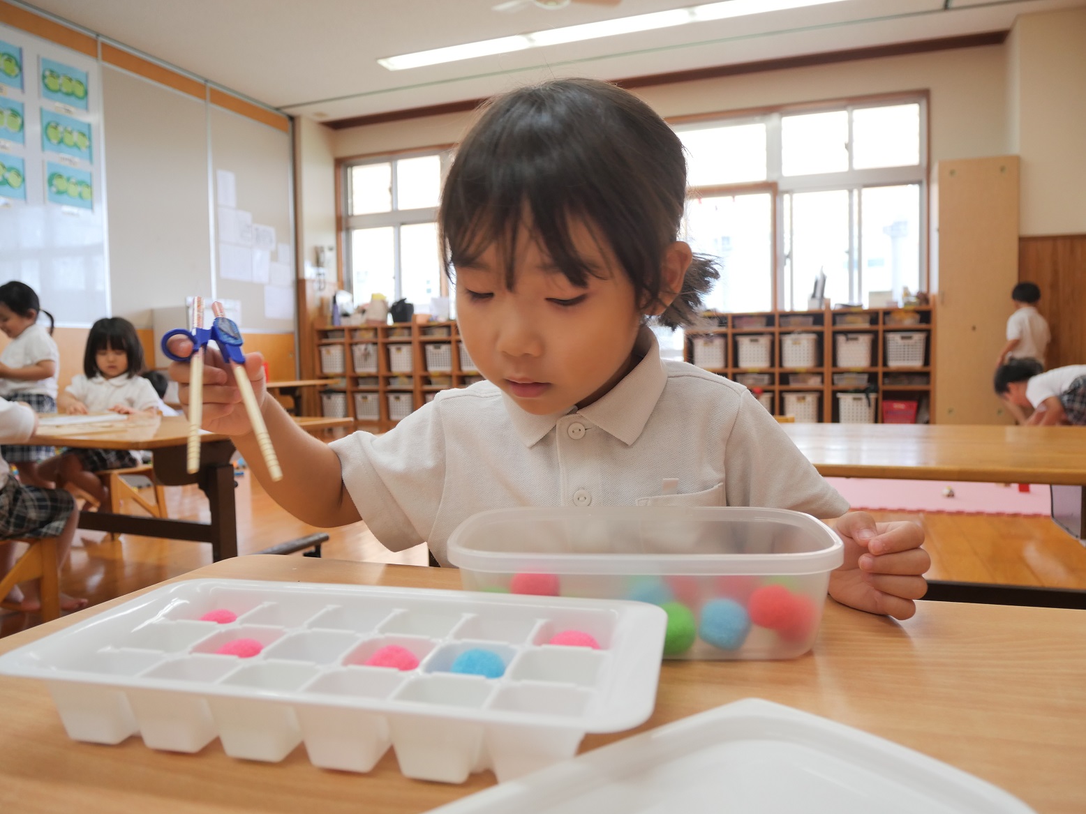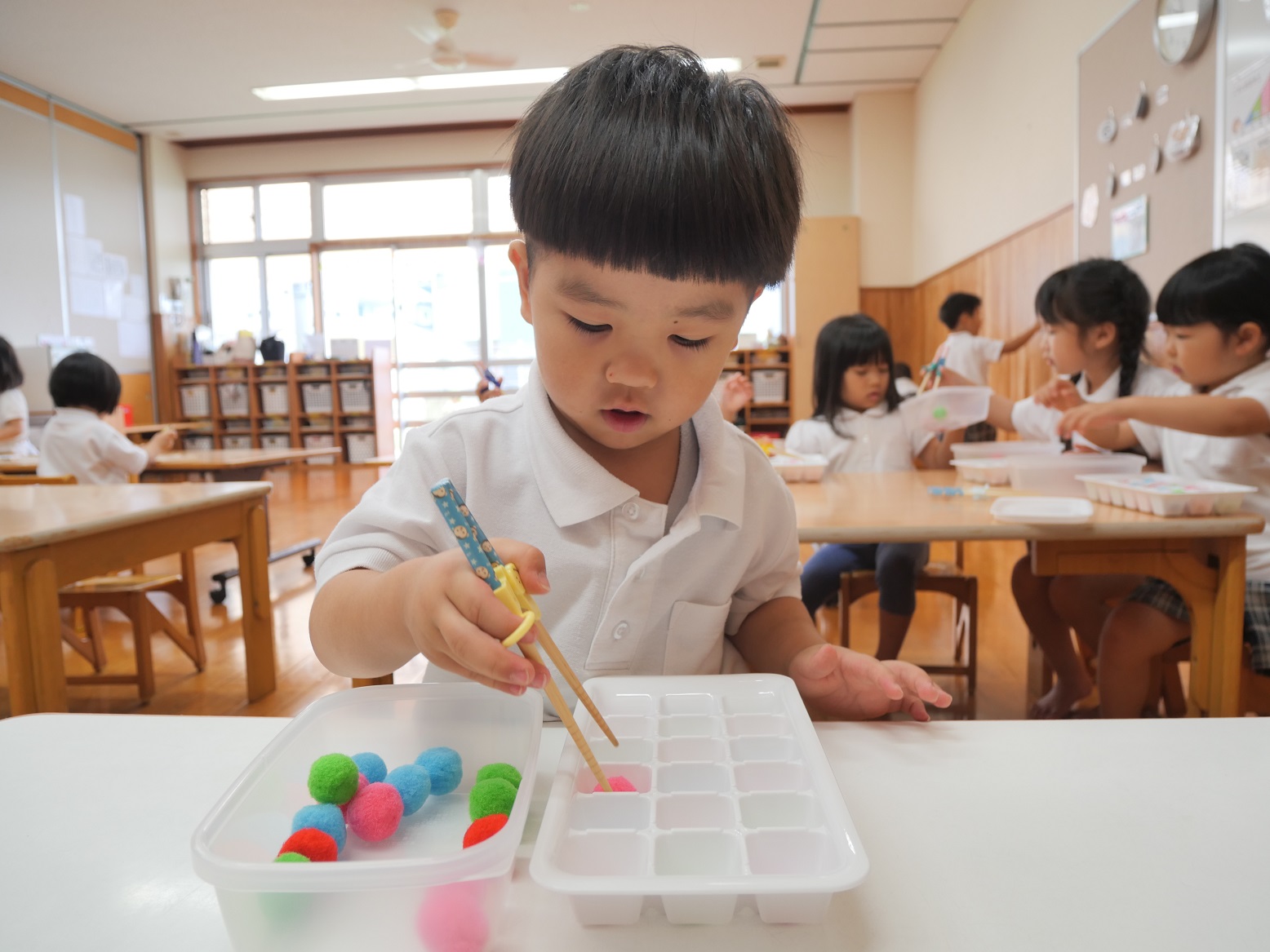 遊びの中で、箸を使用した活動を行っているりす組さん。 ボンボンを箸で掴み、同じ色の場所に入れていきます。 「これはここだね。」「赤はどこかな?」と、色をよく見ながら慎重に進めていく姿が見られました。 途中でボンボンが落ちそうになっても、「おっとっと。」「ゆっくりだよね!」ともう1度ボンボンを掴み直し、繰り返し挑戦していきます。 全部入れることができると「先生、見て!」「全部できたよ。」と、満足気な表情の子どもたちです。