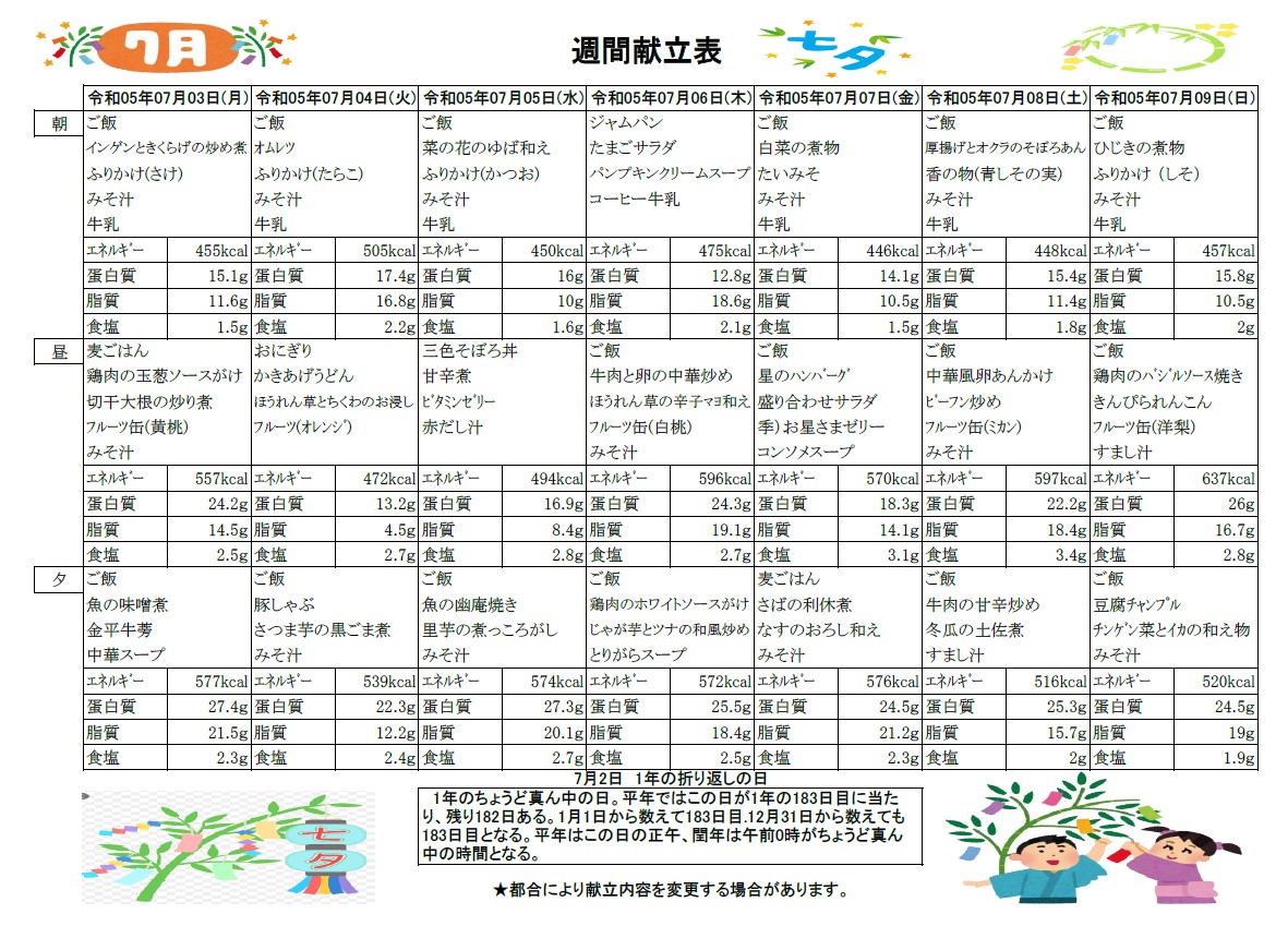 7月3日(月)~7月9日(日)の献立表になります。是非ご覧ください。