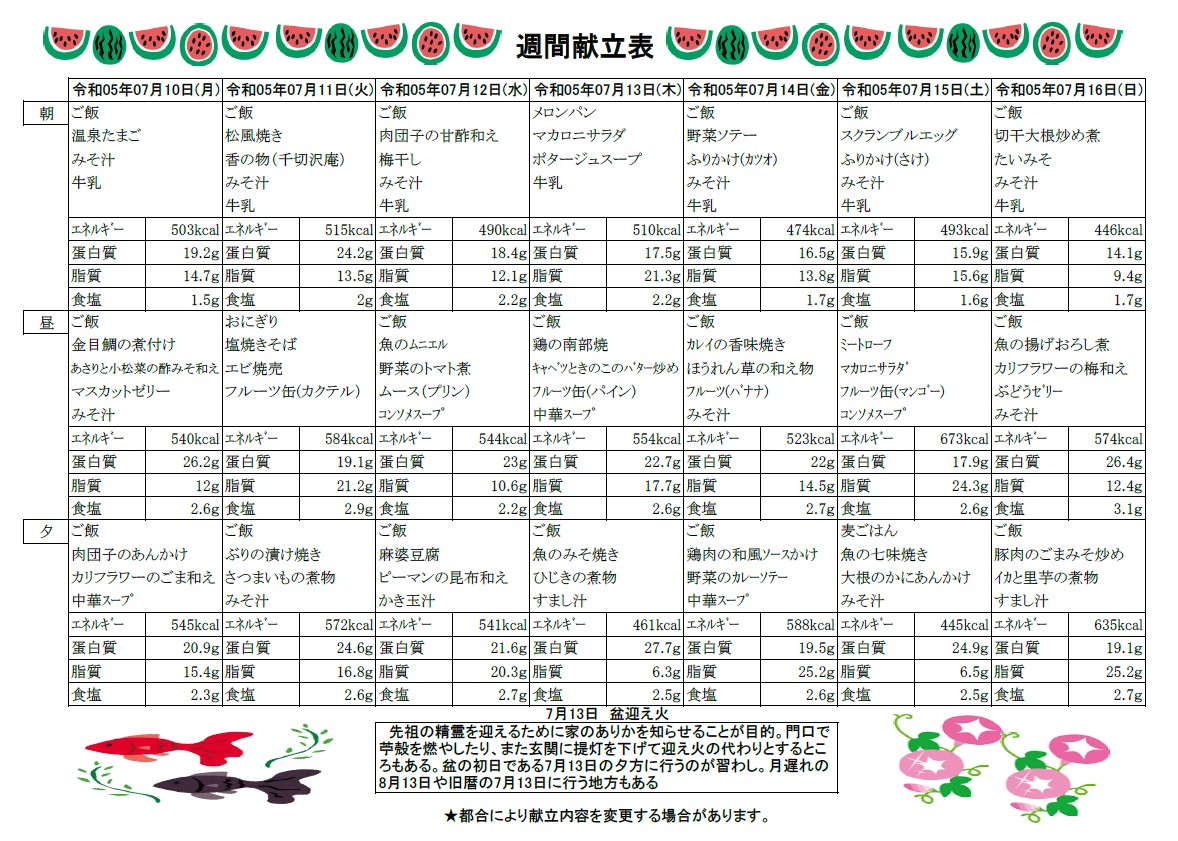 7月10日(月)~7月16日(日)の献立表になります。是非ご覧ください。
