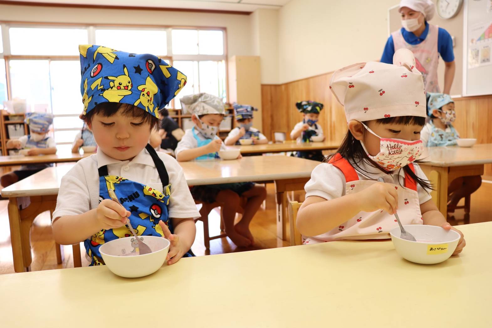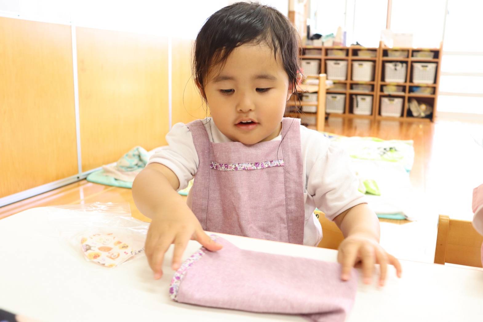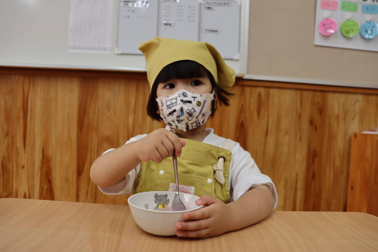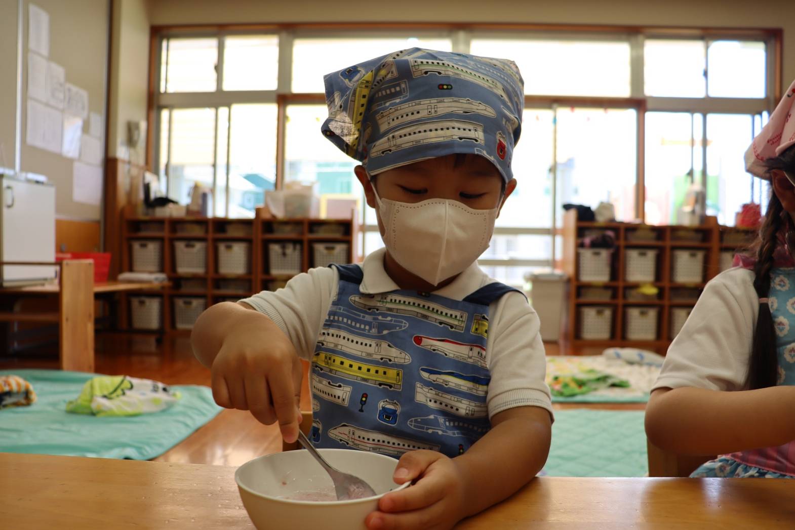 登園すると、「エプロン付けておやつ作るんだよね!」