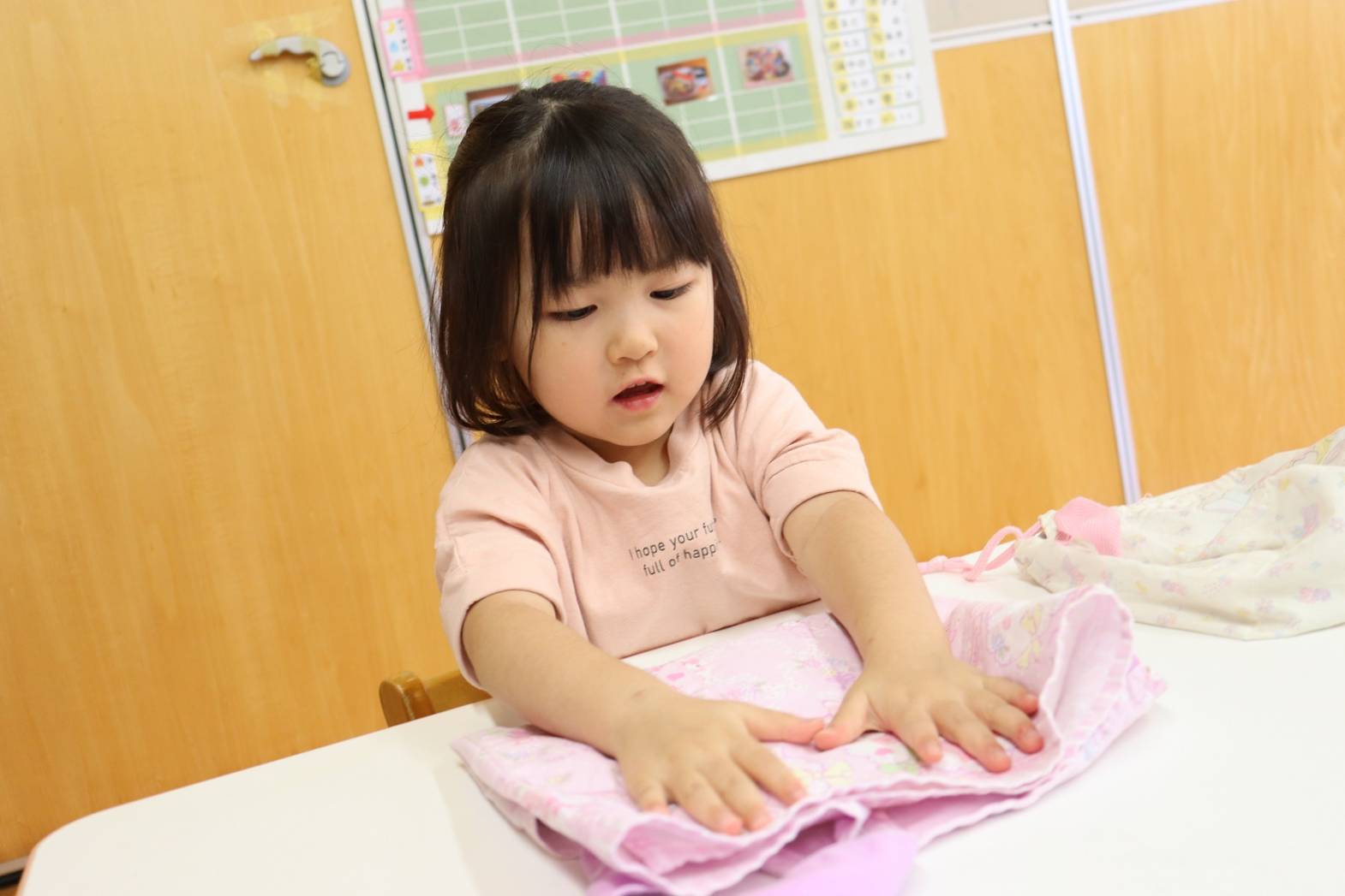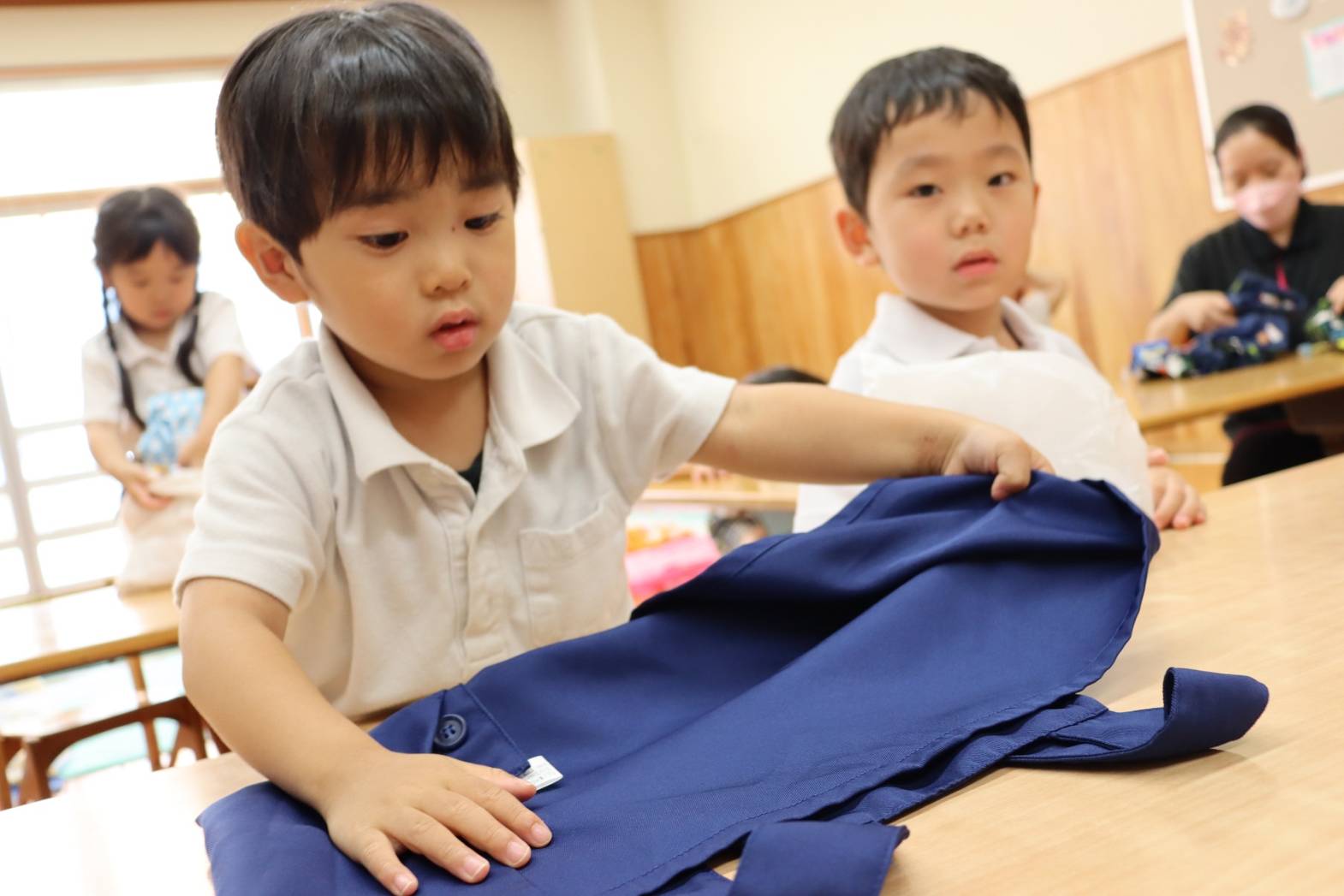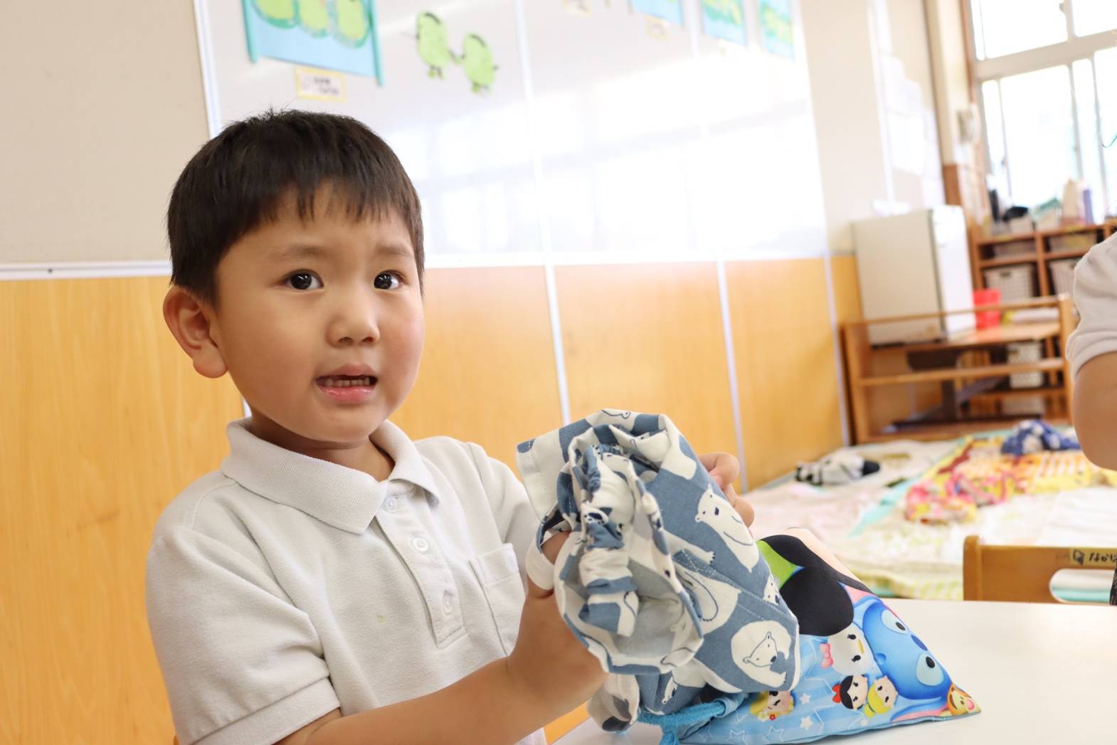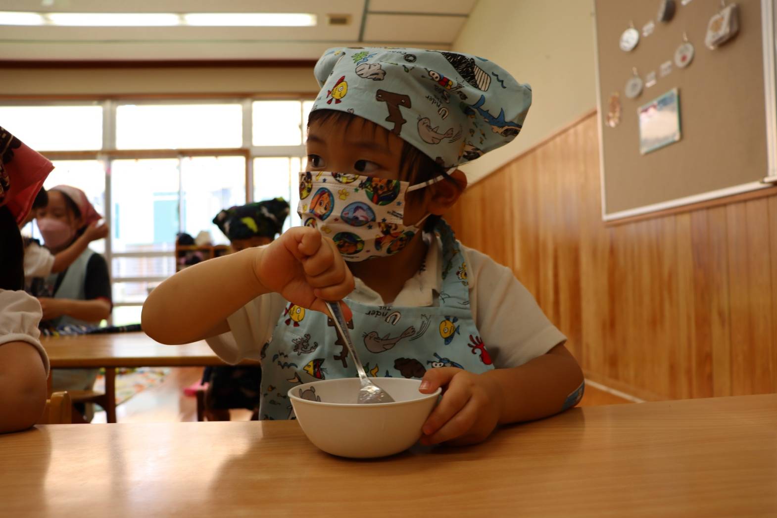 登園すると、「エプロン付けておやつ作るんだよね!」