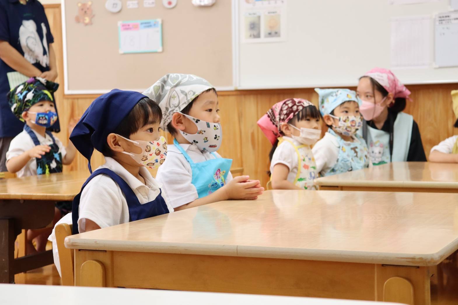 エプロン、マスク、三角巾を付け、準備万端で約束事や作り方について話を聞きます。