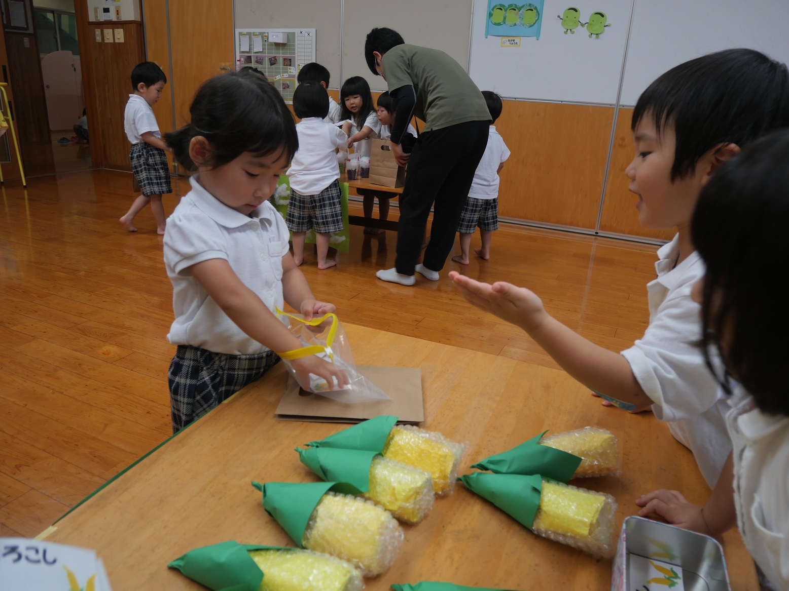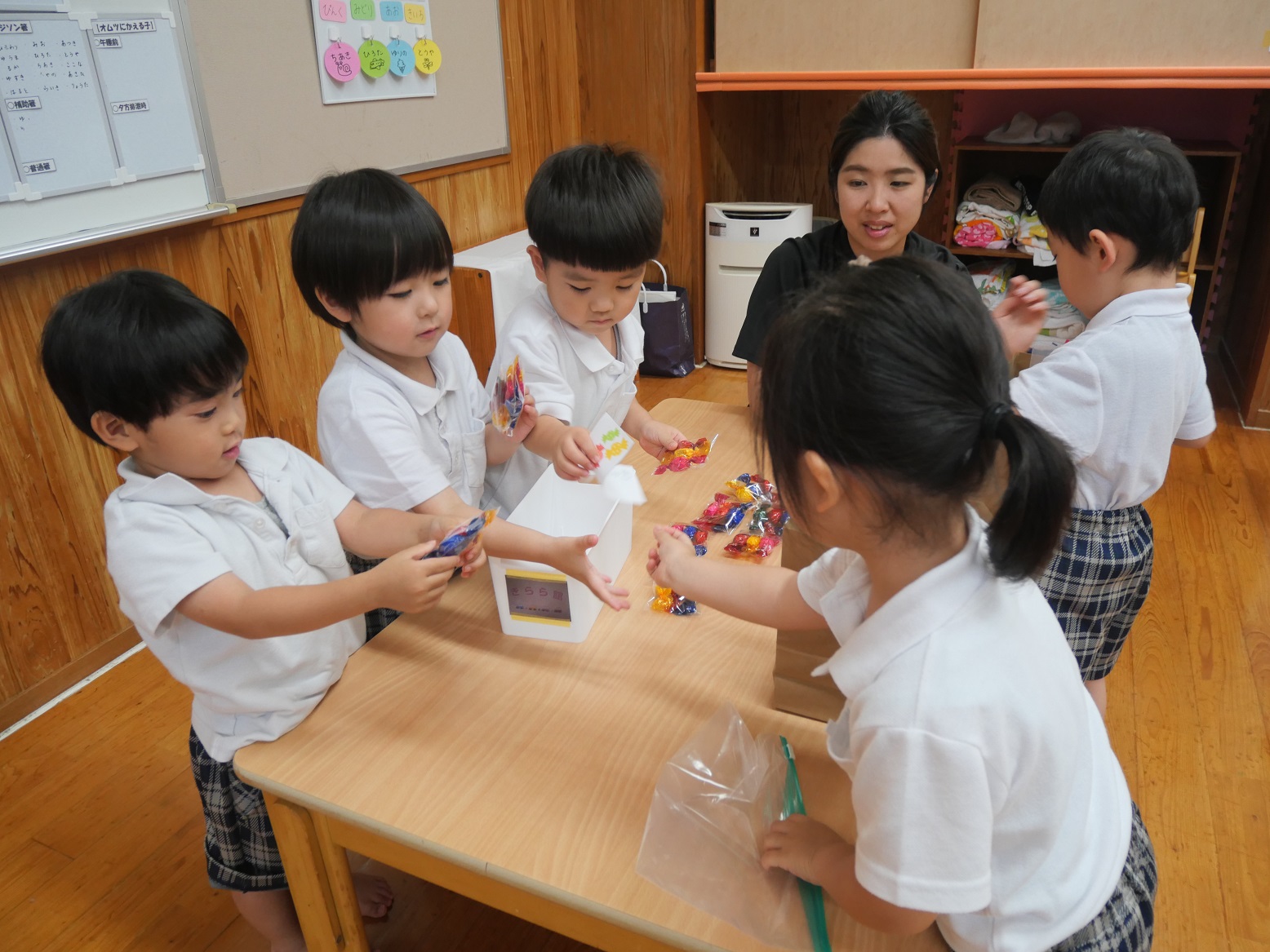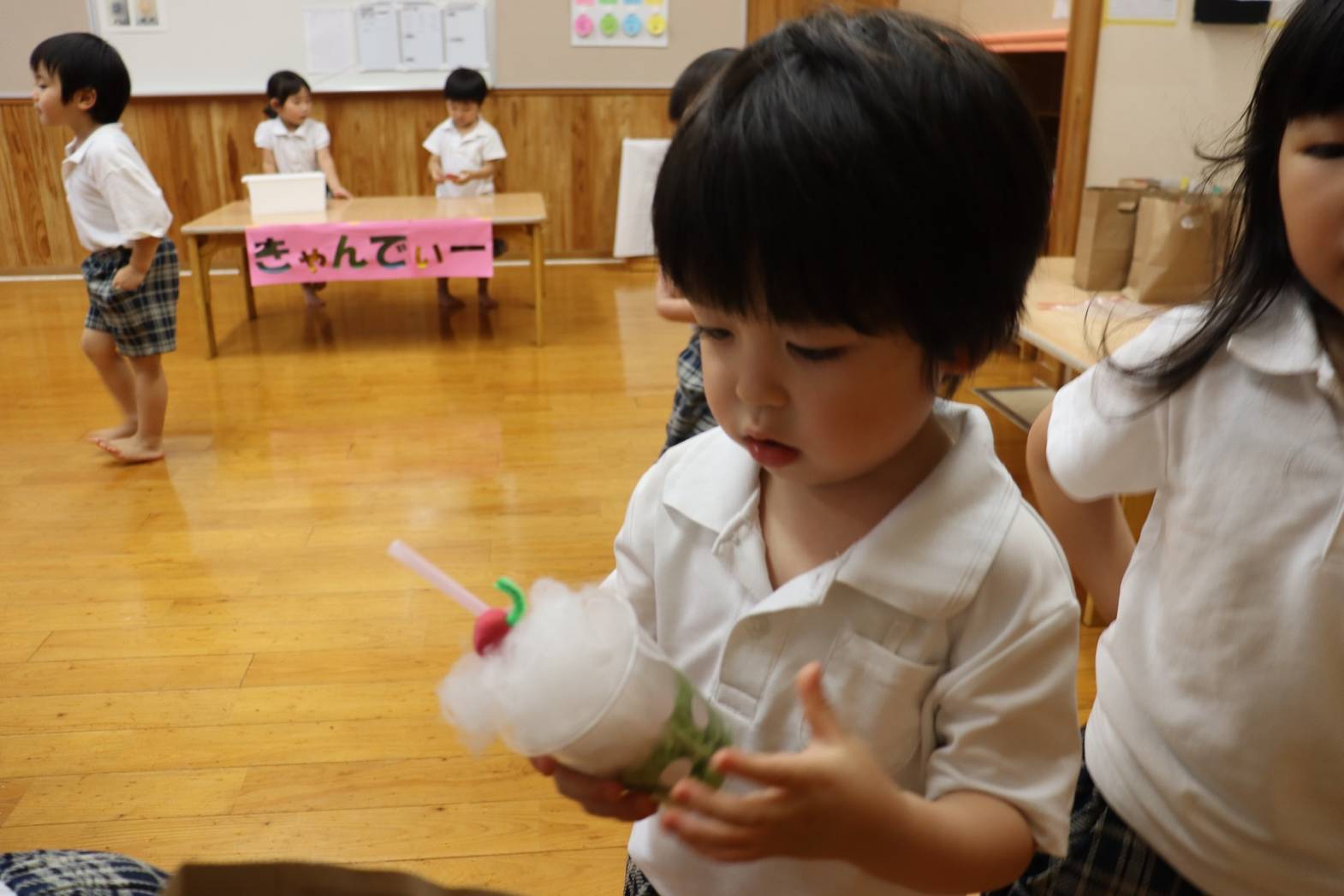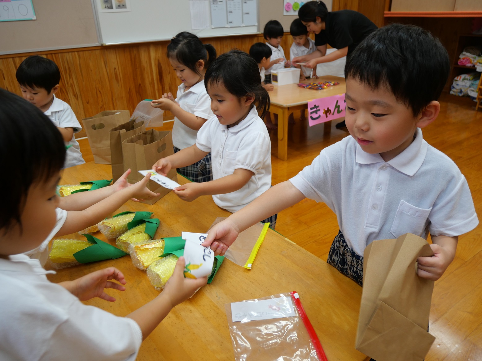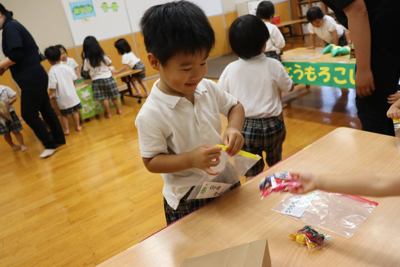 お客さん役になると「これ下さい!」「ありがとう。」とたくさんの商品を買うことができ、嬉しそうな表情のりす組さん。