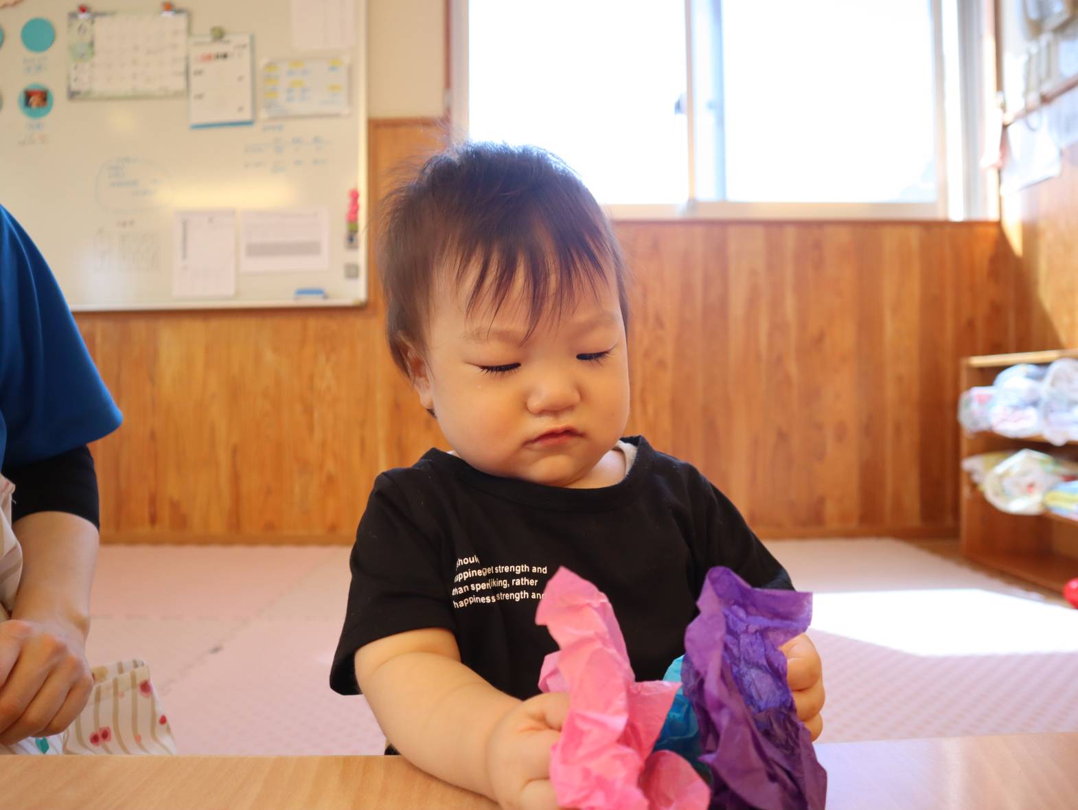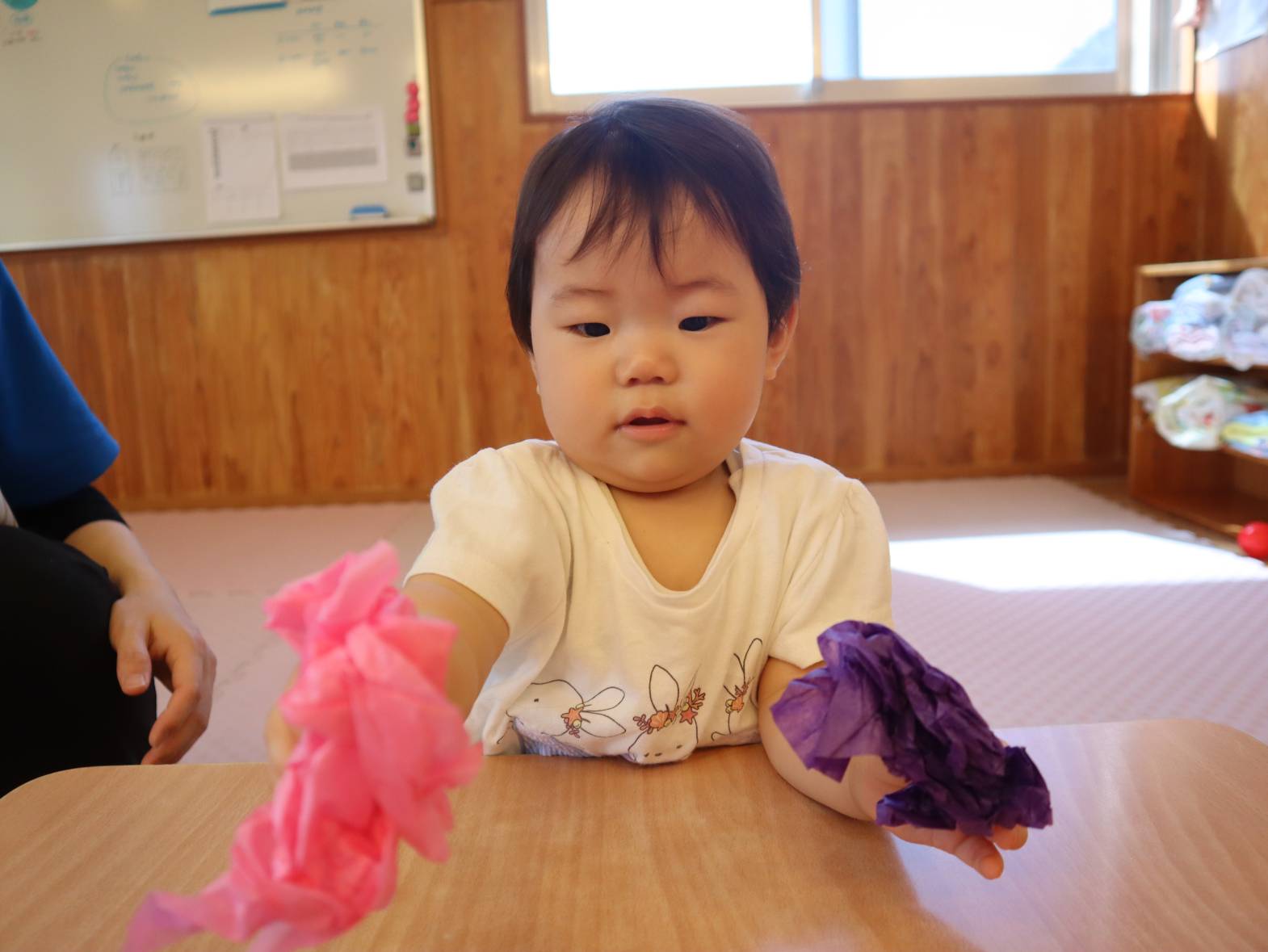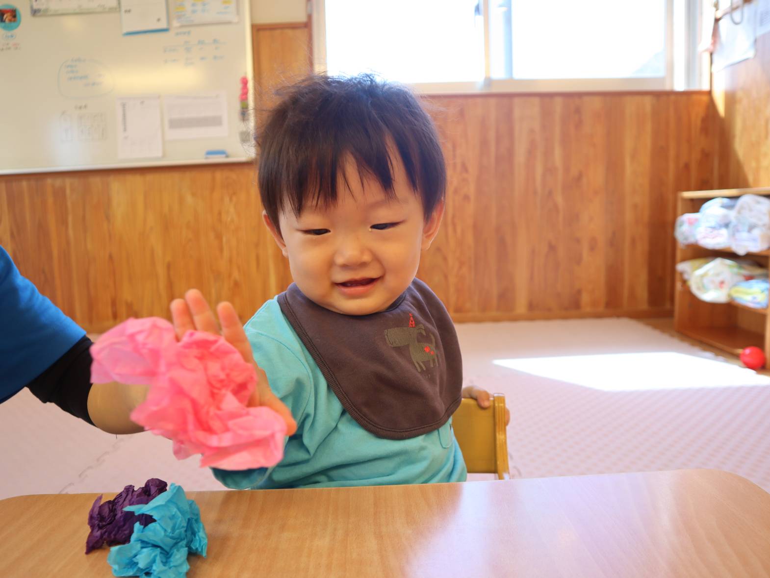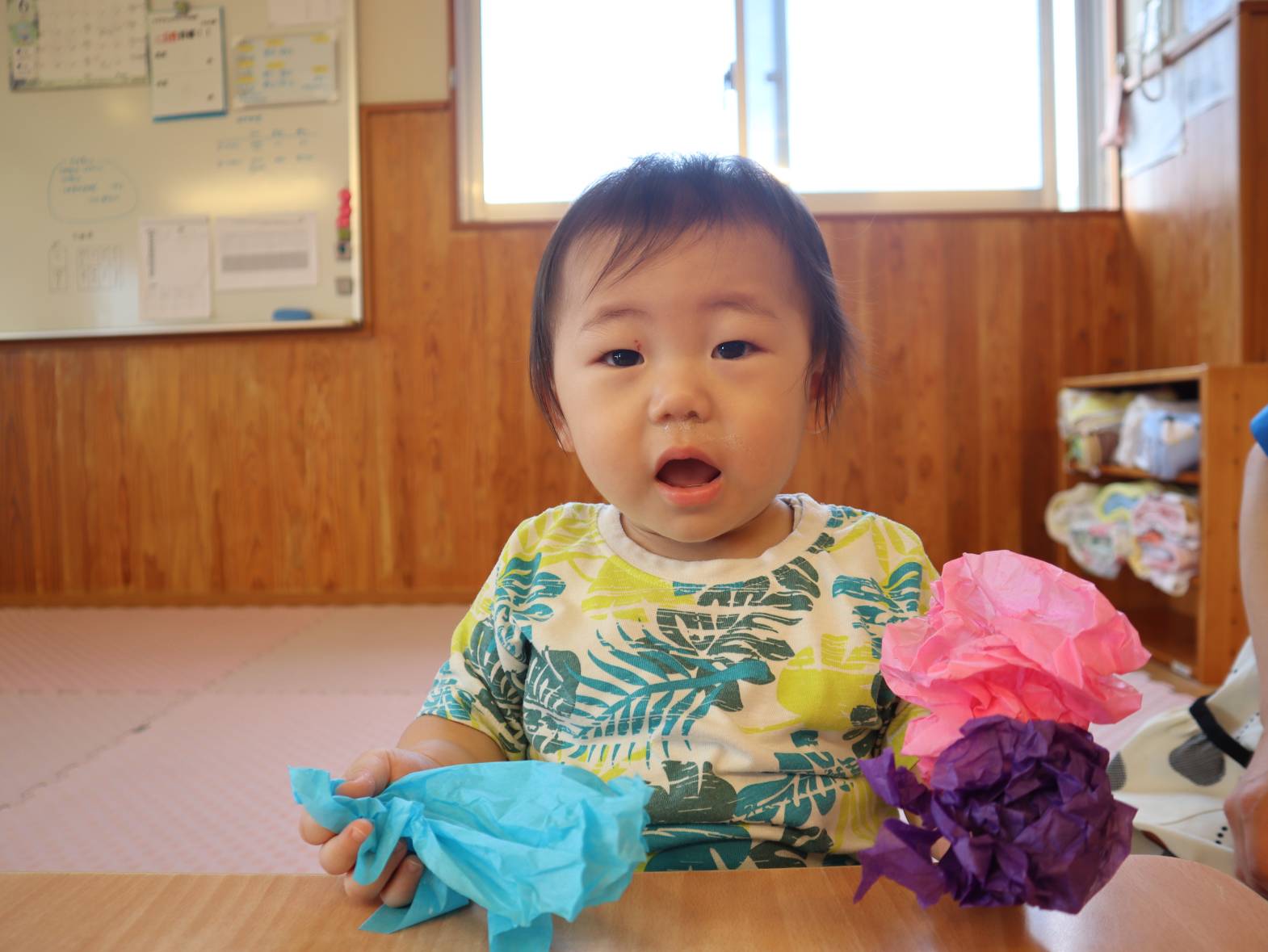 6月は紫陽花の製作を行いました。 花紙をくしゅくしゅっと手で丸めていくと、初めての感触に「あ!」と声を上げる子どもたち。 感触が苦手だったり、力加減が分からず破けてしまったりする姿も見られましたが、一緒に手を添えると笑顔のひよこ組さんです。 梅雨の季節感を味わい、また1つ経験が増えて嬉しそうな笑顔が見られました!