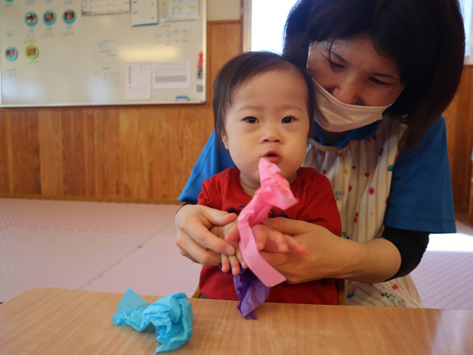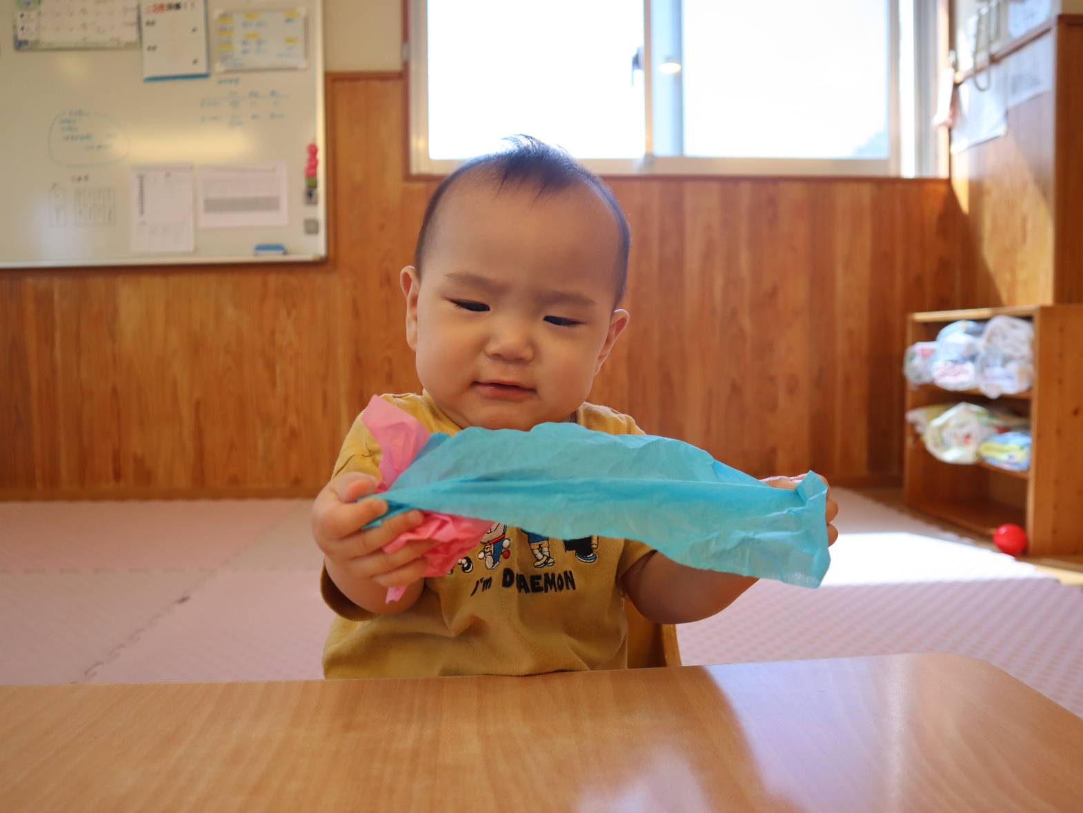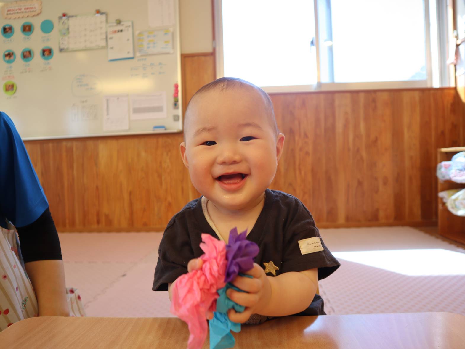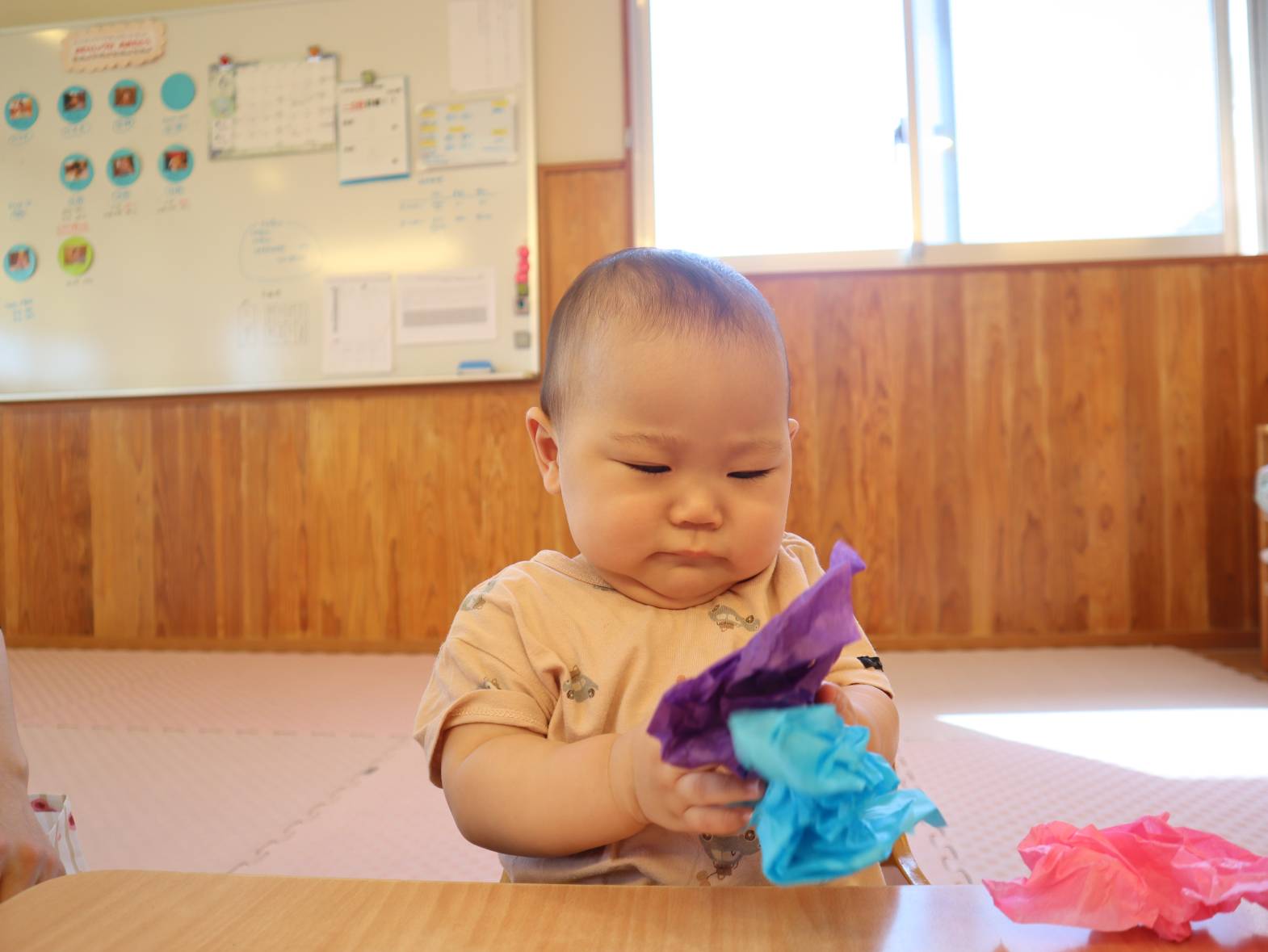 6月は紫陽花の製作を行いました。 花紙をくしゅくしゅっと手で丸めていくと、初めての感触に「あ!」と声を上げる子どもたち。 感触が苦手だったり、力加減が分からず破けてしまったりする姿も見られましたが、一緒に手を添えると笑顔のひよこ組さんです。 梅雨の季節感を味わい、また1つ経験が増えて嬉しそうな笑顔が見られました!