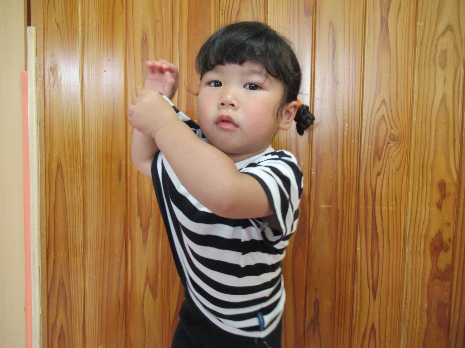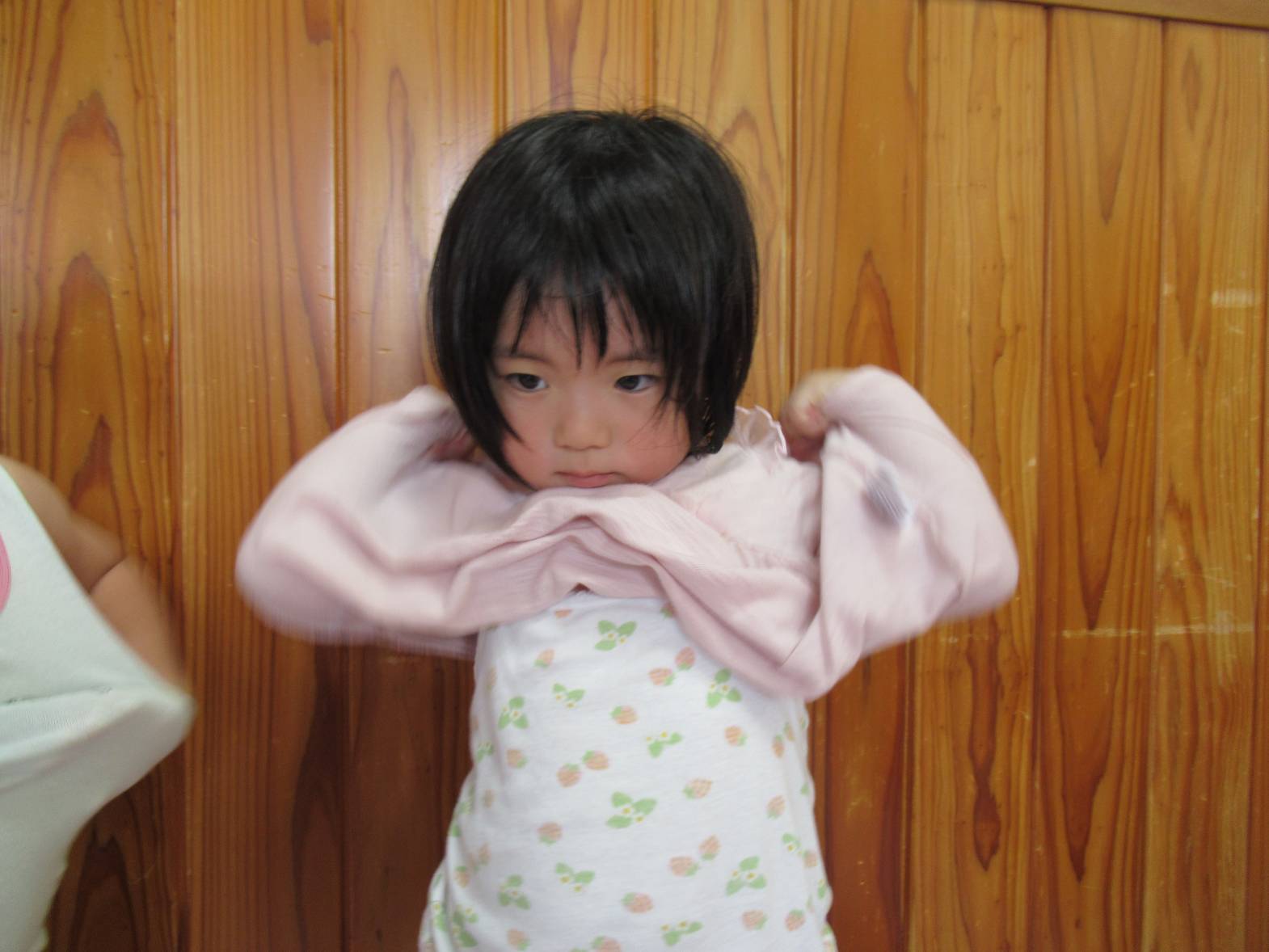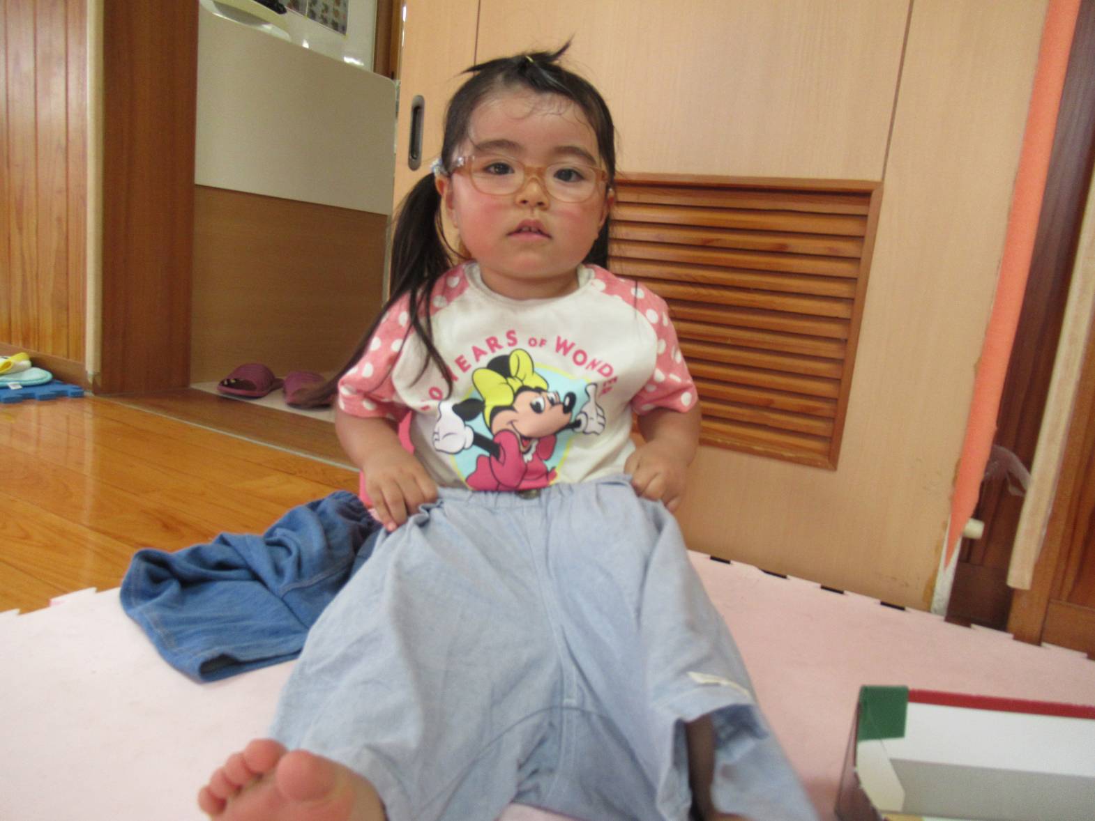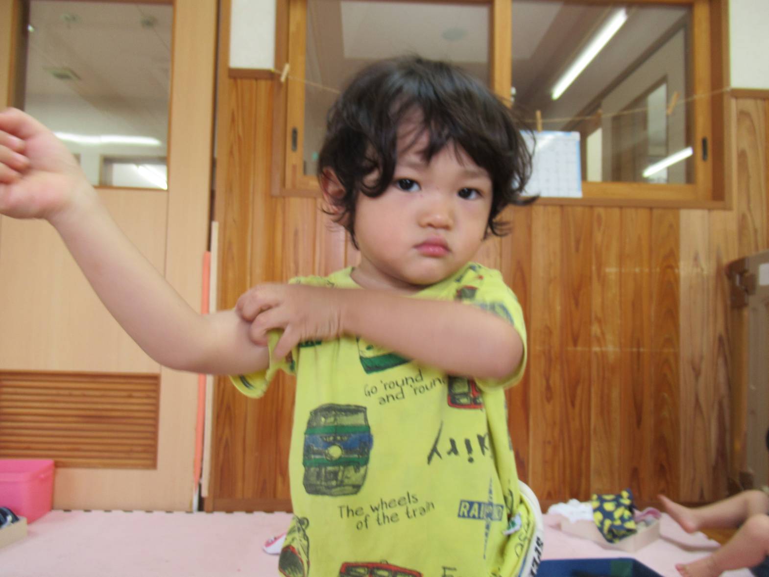 午前中の活動が終わると着替えの時間! 自分の棚から着替え袋を持ってきて、着替えていきます。排泄が終わると新しいズボンを履いていく子どもたち。 「合ってる?」、「上までできたよ!」と確認したり、できた喜びを共有したりする姿が見られます。 Tシャツの着脱は少し苦戦する様子も見られますが、難しい場合には保育者に手伝ってもらいながら取り組んでいます。 最後に洋服を畳んでおしまいです。できることが少しずつ増え、やる気いっぱいのぱんだ組さんです。