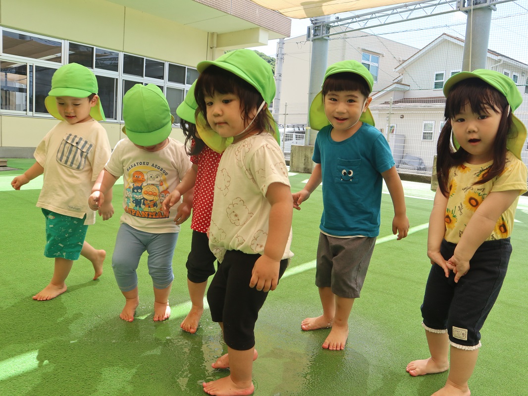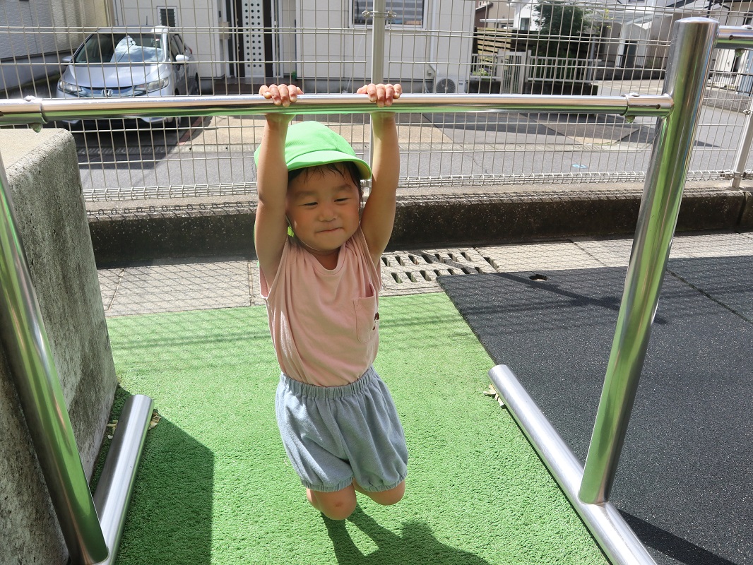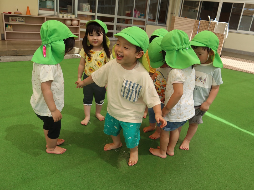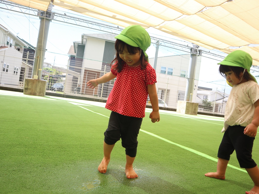 晴れている日は園庭に行き、鉄棒や滑り台でたくさん体を動かして遊ぶ子どもたち。 最近では、葉っぱや砂を集めて「ご飯できたよ~!」と、友だち同士でごっこ遊びを楽しむ様子も見られます。 保育者が園庭に水を撒くと、水が溜まったところに一斉に駆け寄り、ジャンプしたり足踏みしたりして水の冷たさやピチャピチャする音を楽しむ姿も見られました。 「もう1回やって!」というリクエストの声も多く、7月からの水遊びが待ち遠しいぱんだ組さんです。