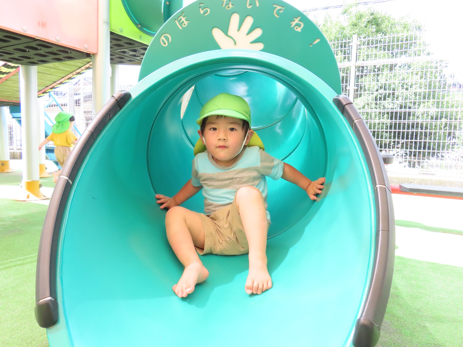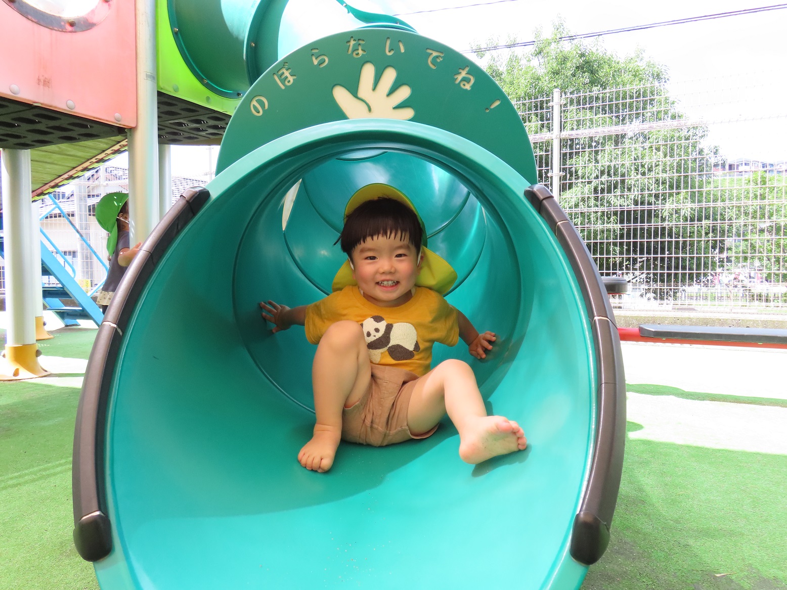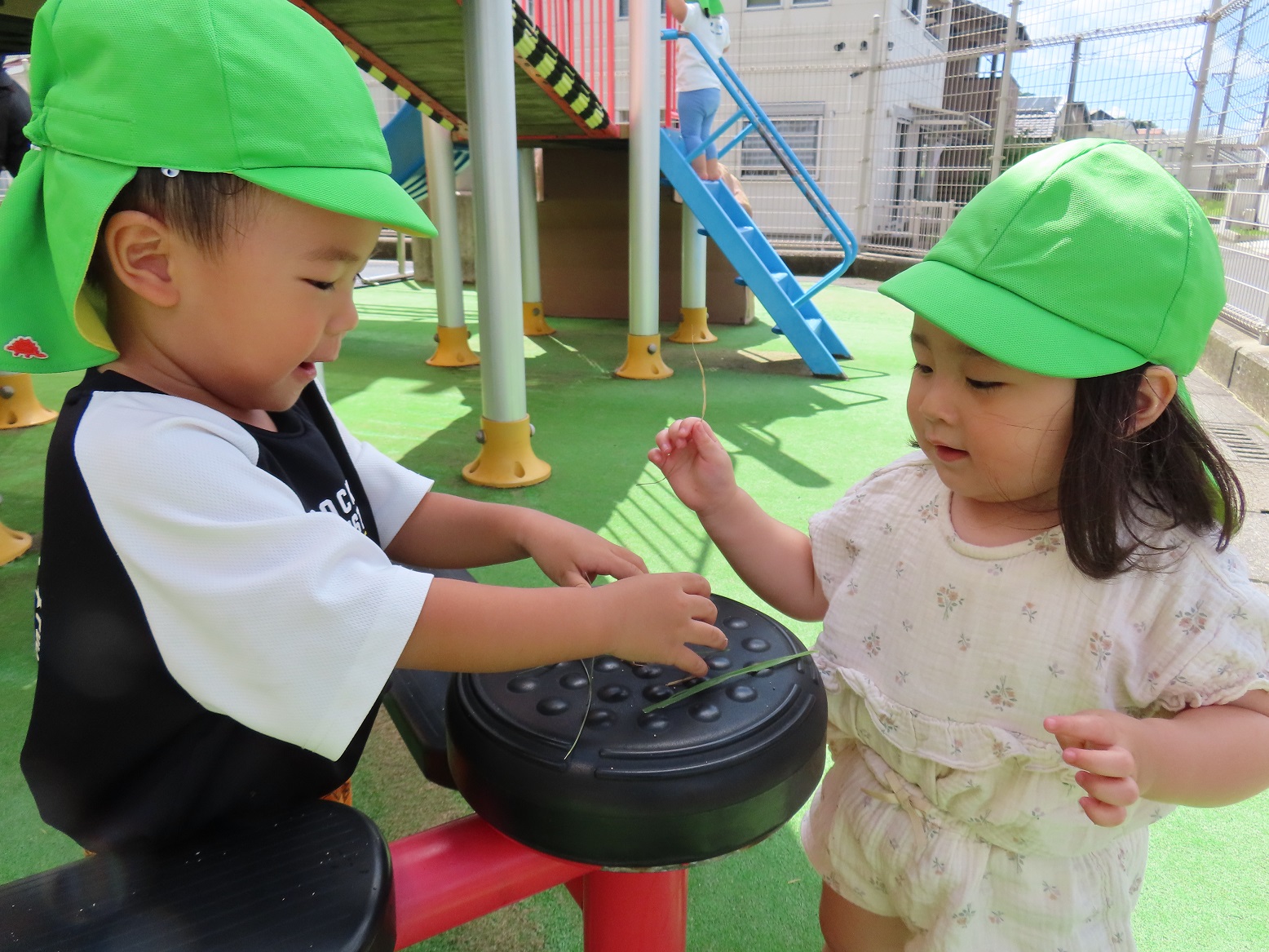 晴れている日は園庭に行き、鉄棒や滑り台でたくさん体を動かして遊ぶ子どもたち。 最近では、葉っぱや砂を集めて「ご飯できたよ~!」と、友だち同士でごっこ遊びを楽しむ様子も見られます。 保育者が園庭に水を撒くと、水が溜まったところに一斉に駆け寄り、ジャンプしたり足踏みしたりして水の冷たさやピチャピチャする音を楽しむ姿も見られました。 「もう1回やって!」というリクエストの声も多く、7月からの水遊びが待ち遠しいぱんだ組さんです。
