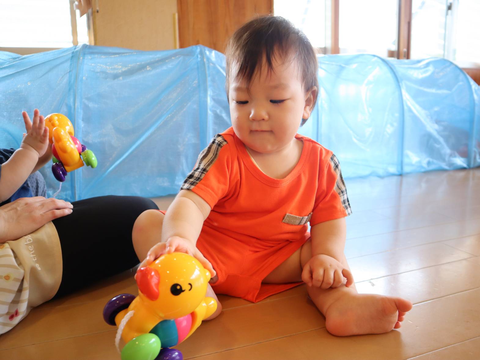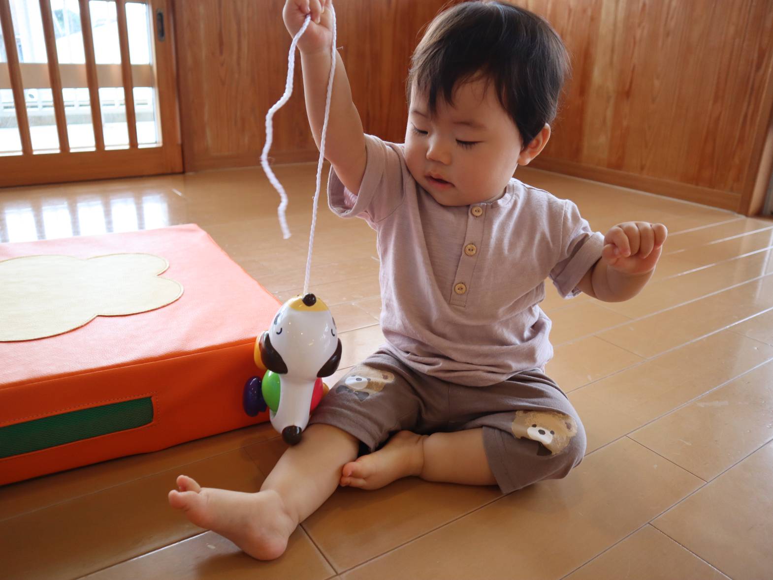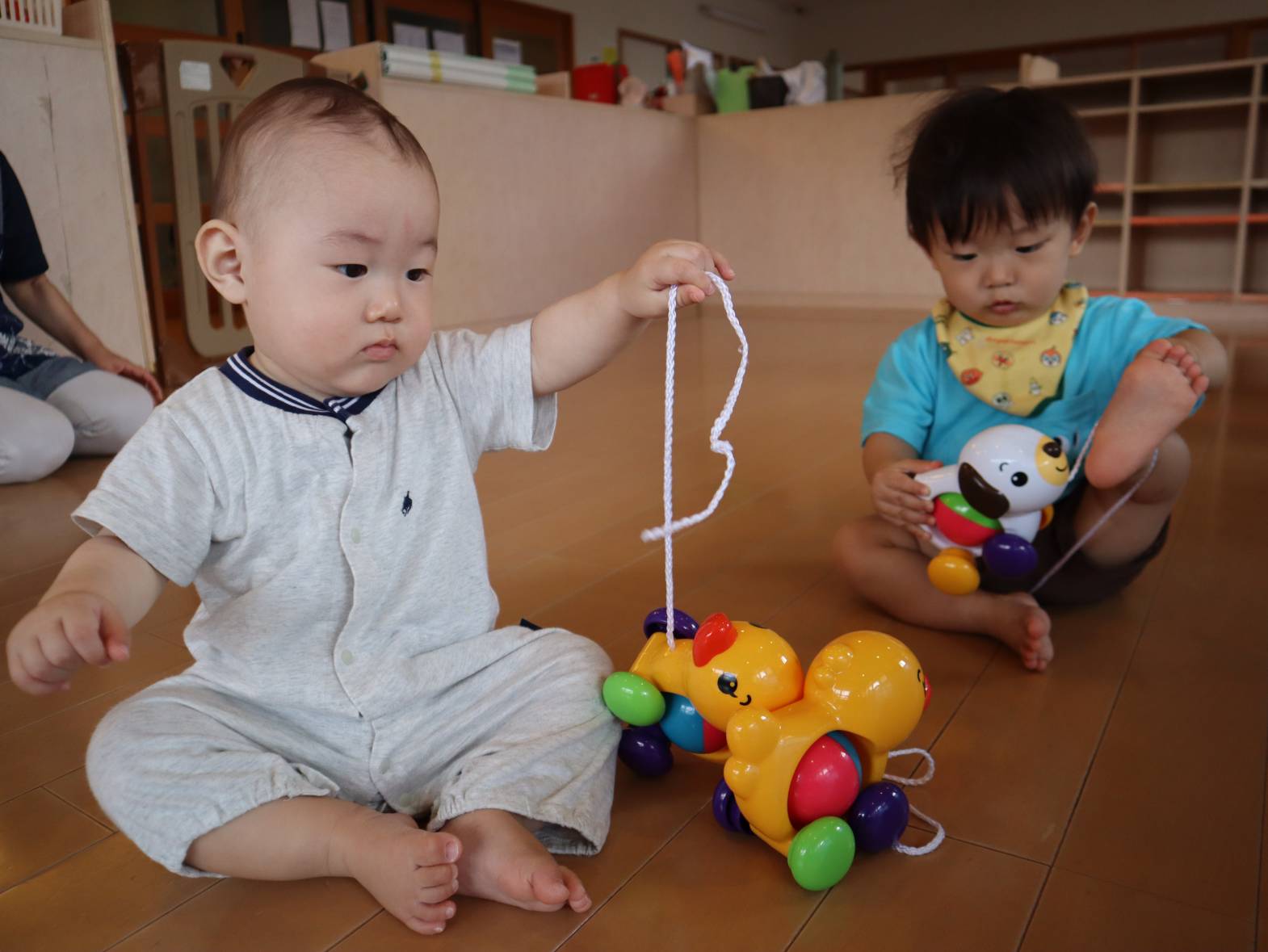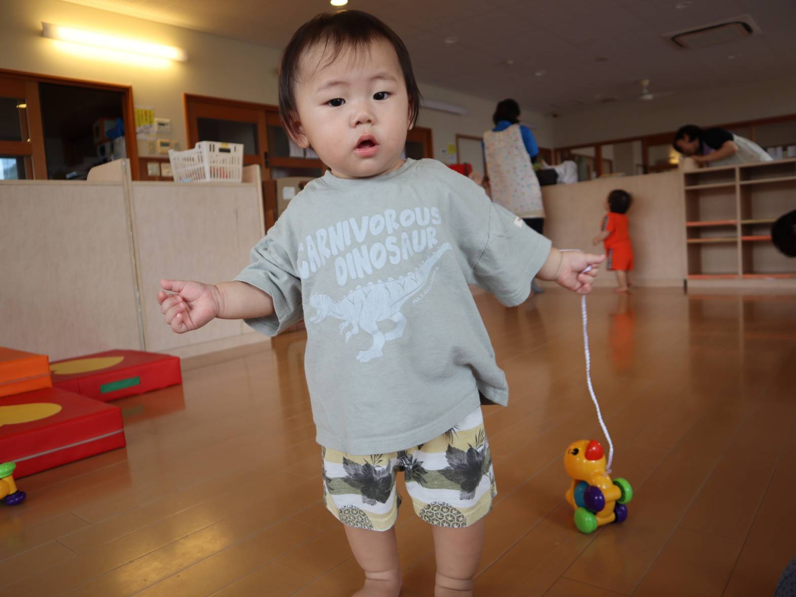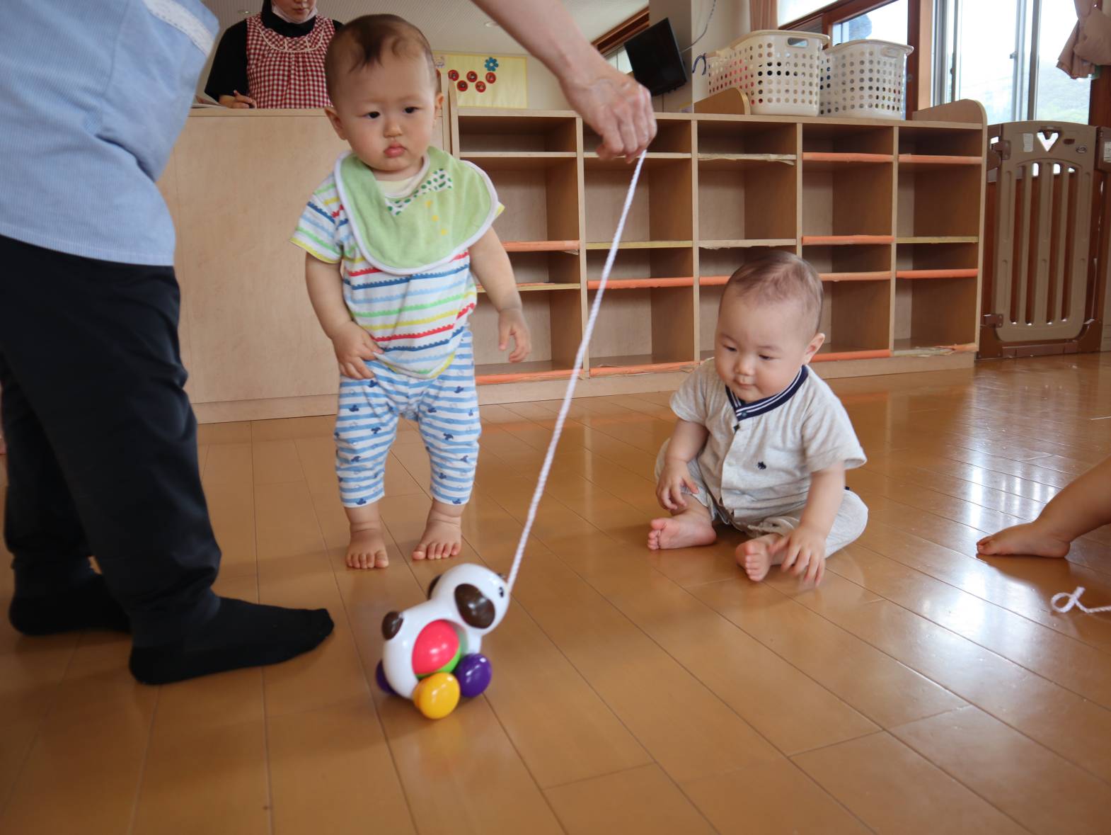 コロコロペットという歩行玩具を出すと、興味津々の子どもたち。 紐を引くとアヒルや犬が動いているような姿に、「わあー!」と大喜びです。 車のように走らせてみたり、座った状態で紐を引っ張って転がしてみたりする姿が見られました。 歩行ができる子どもは、紐を握って引っ張って歩くことに挑戦! たくさん引っ張って、みんなでお散歩できる日が楽しみです!