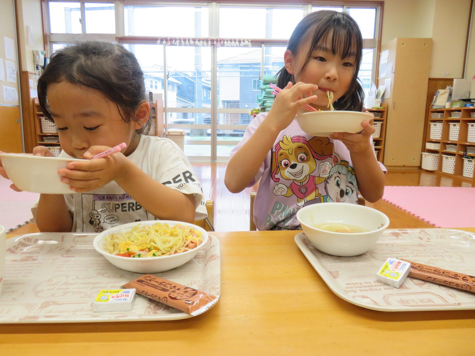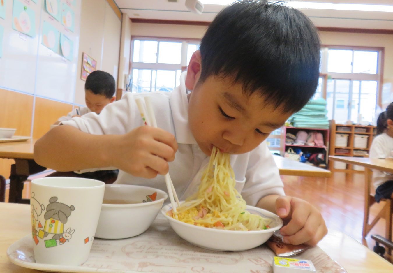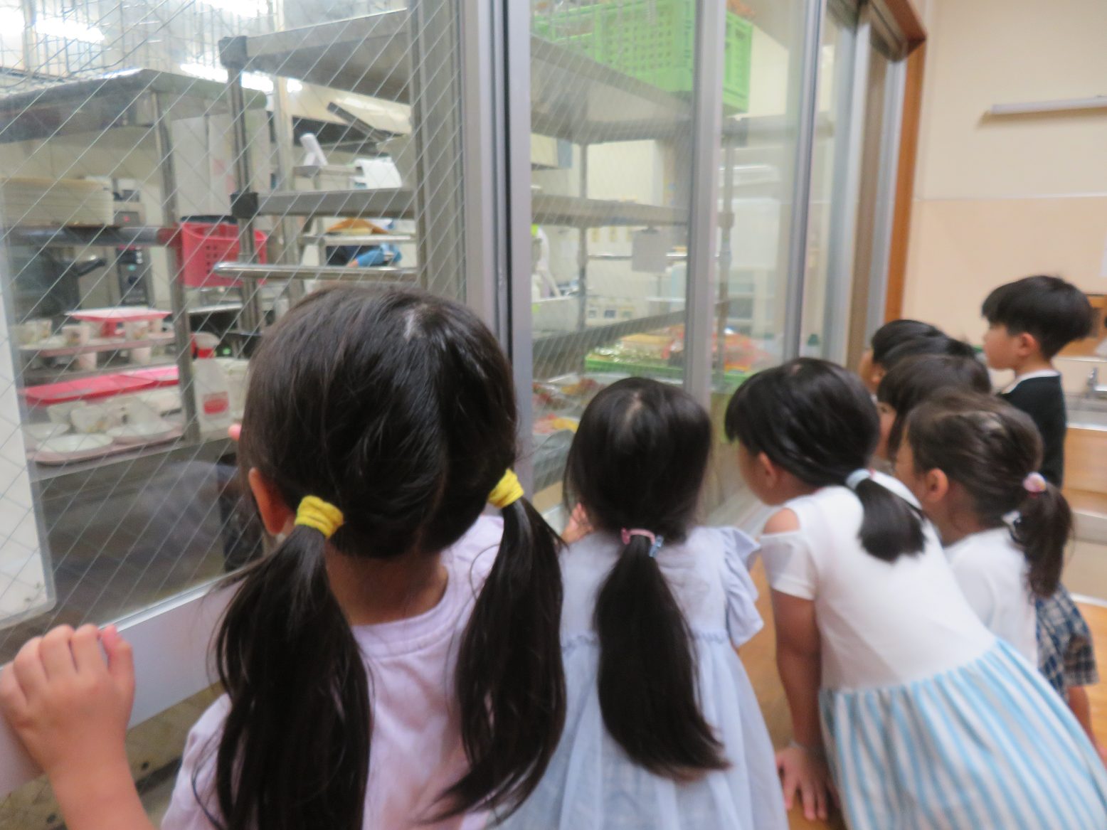 「今日の給食は何かな?」と、給食前の時間に給食室を覗きに行きました。 「見て見て!先生が向こうでお汁注いでるよ。」「あ!あそこにミニドーナッツ発見。」「先生が写真撮ってるね。」と、給食室を覗いてたくさんの発見を楽しむ子どもたち。 中には、美味しそうな給食を目にして「も―お腹空いた。早く食べたいよ。」といった声も聞かれました。 お待ちかねの給食を食べ進める中では、「冷やし中華美味しい!」と笑顔溢れるきりん組さんでした。 給食の先生、美味しい給食をありがとう!