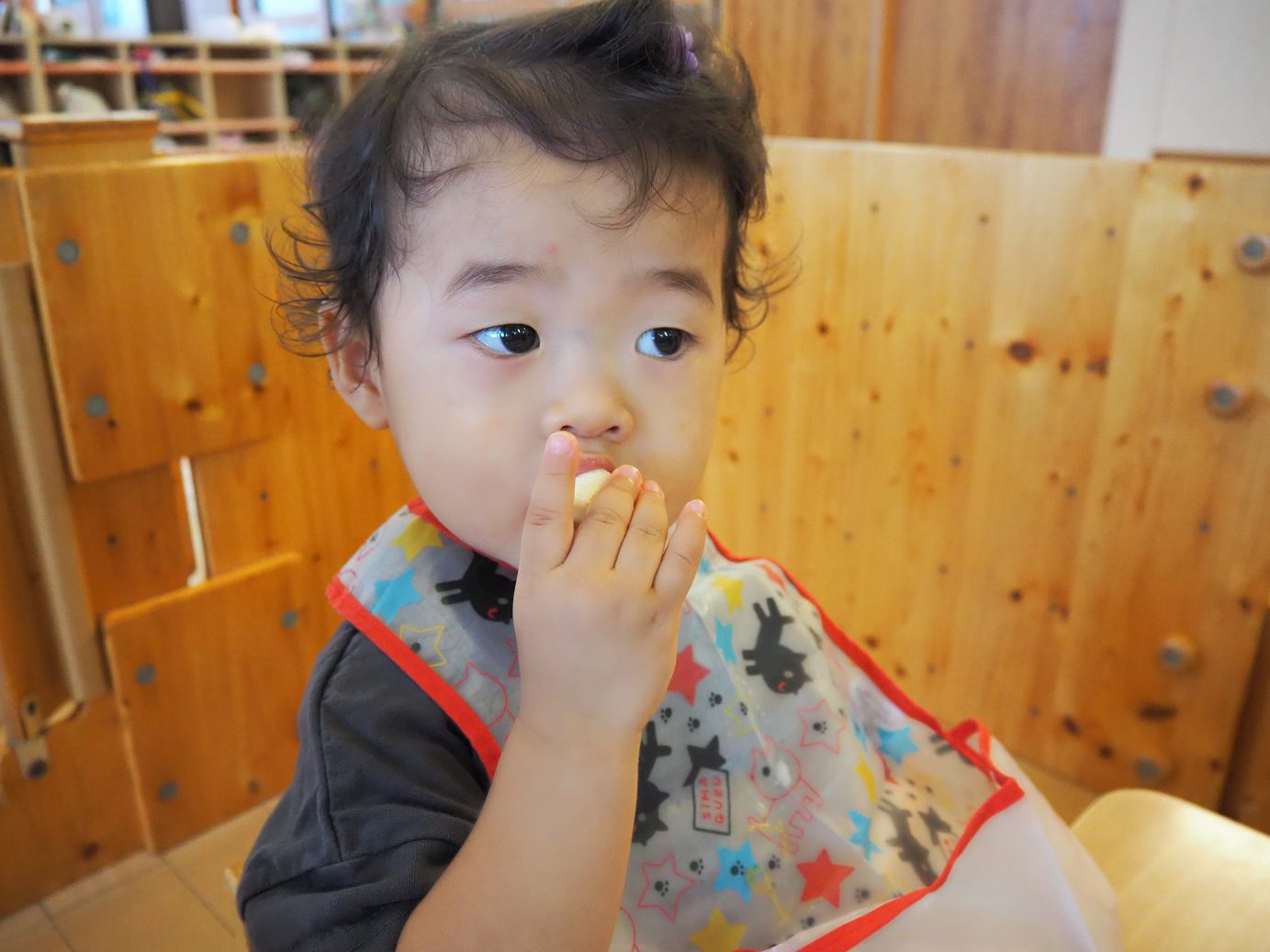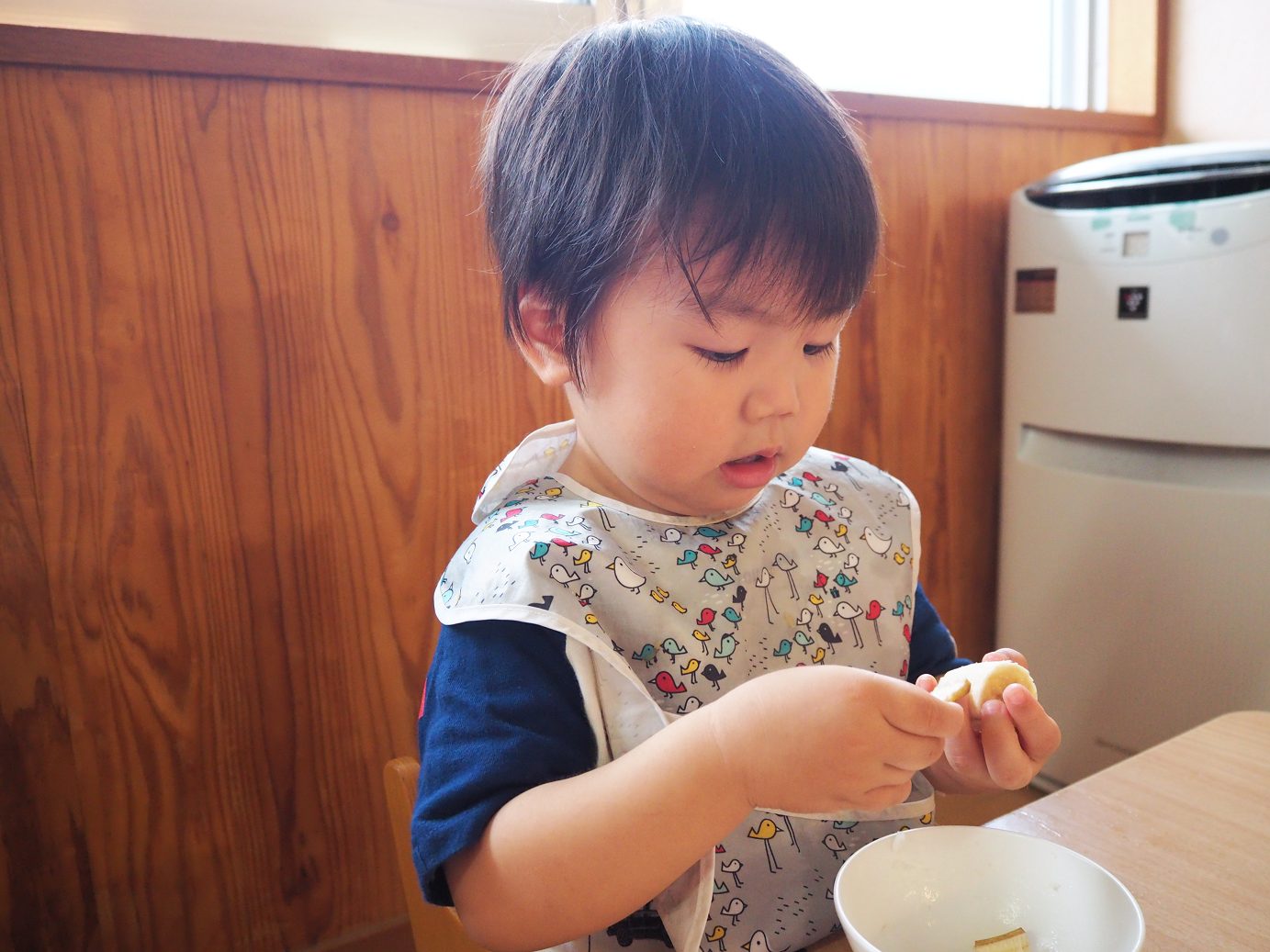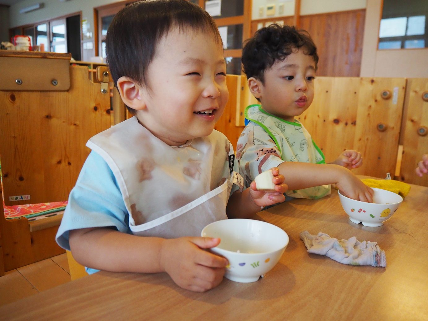 今日の給食のデザートでは、バナナが出ました。いつも絵本に出てくる絵を見るとすぐに「ばなな!」と答えるほど大好きなこあら組さん。 デザートにバナナがあることに気付くとパクパクと給食を食べ進め、完食するとバナナのある方向を指差し、待つ子どもたち。 デザートが出てくると、「ばなな!」、「わぁ、おいしそう~!」と目をキラキラさせたり、自分たちで皮を上手にむいて食べたりする姿が見られました。 食べることが大好きな子どもたち。毎日の給食やデザートを楽しみにしているこあら組さんでした♪