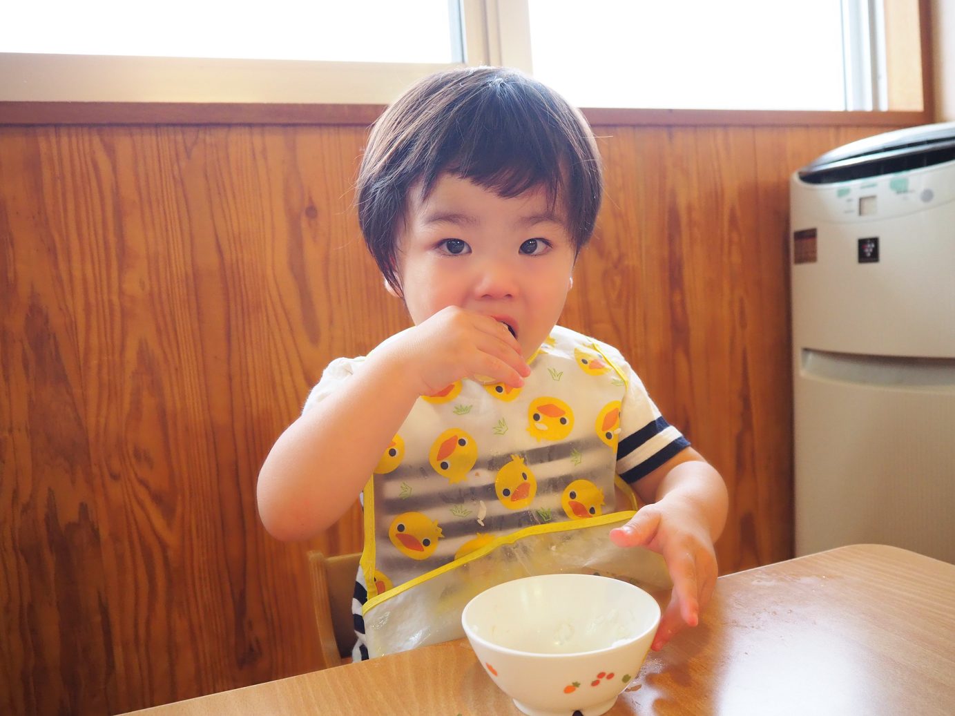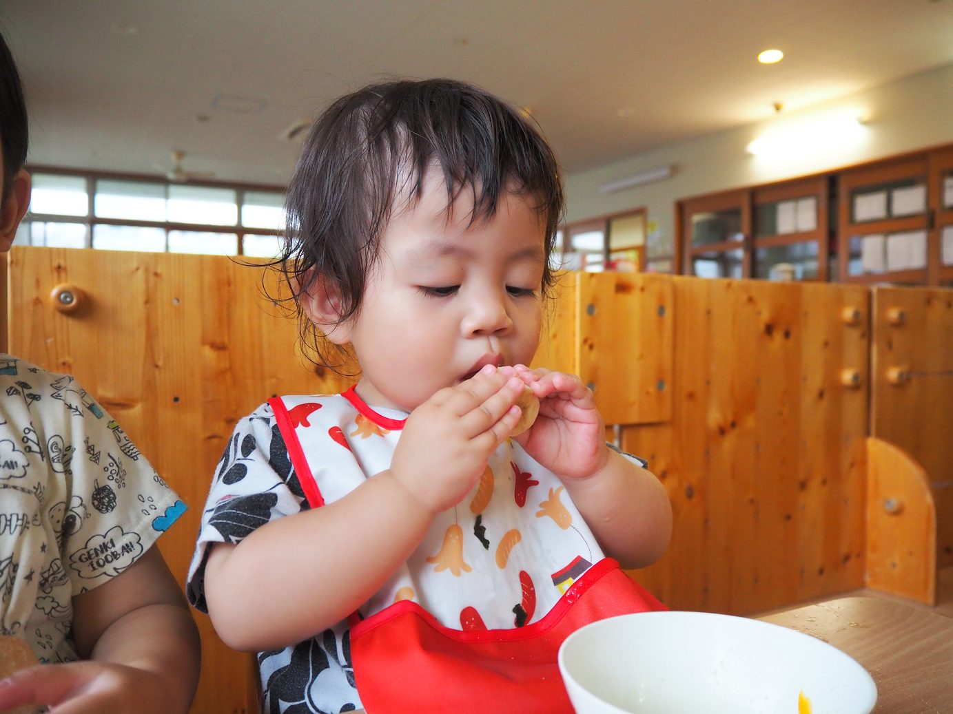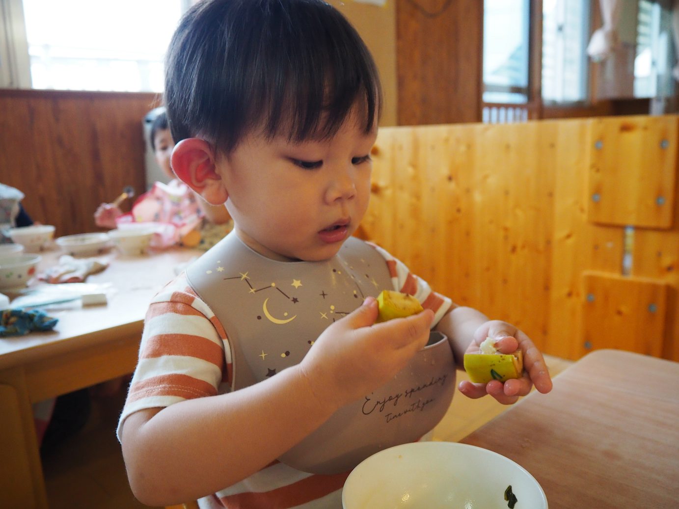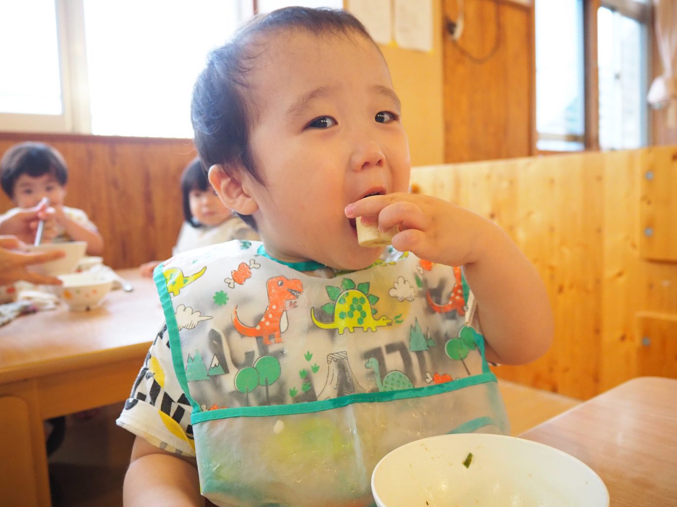 今日の給食のデザートでは、バナナが出ました。いつも絵本に出てくる絵を見るとすぐに「ばなな!」と答えるほど大好きなこあら組さん。 デザートにバナナがあることに気付くとパクパクと給食を食べ進め、完食するとバナナのある方向を指差し、待つ子どもたち。 デザートが出てくると、「ばなな!」、「わぁ、おいしそう~!」と目をキラキラさせたり、自分たちで皮を上手にむいて食べたりする姿が見られました。 食べることが大好きな子どもたち。毎日の給食やデザートを楽しみにしているこあら組さんでした♪