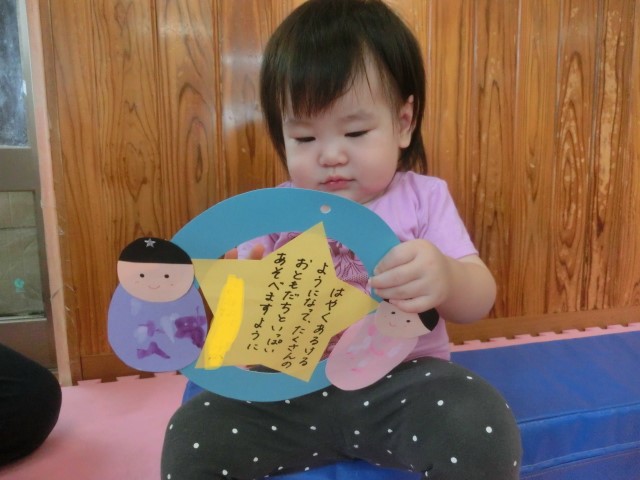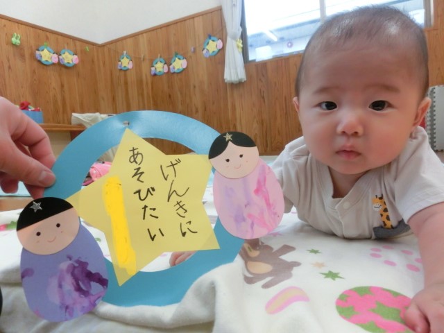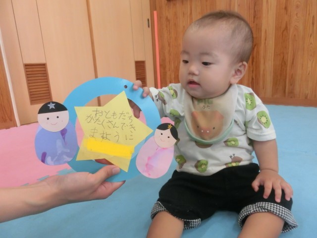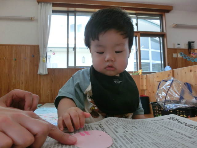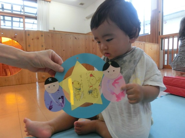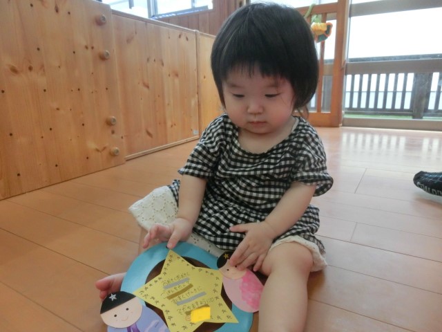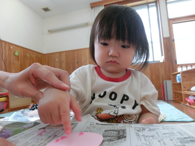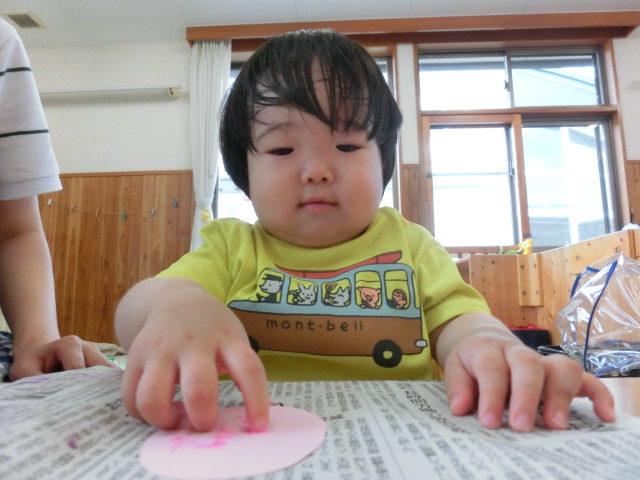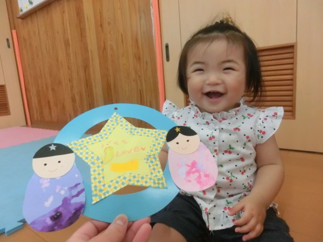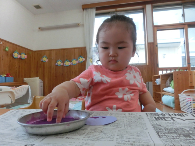 七夕に向けて製作活動を行ったひよこ組さん。今回は、指スタンプに挑戦です!! 絵の具を見て不思議そうな表情を浮かべたり、自ら指に付けスタンプしたり、個々によって姿は様々でした。 中には、楽しさから「おー。」、「あっ!」と声を出す子どもたち♪ みんなの可愛らしい指スタンプ模様と、素敵な願い事を貼り完成しました! 笹に飾った際は、ぜひご覧ください♪