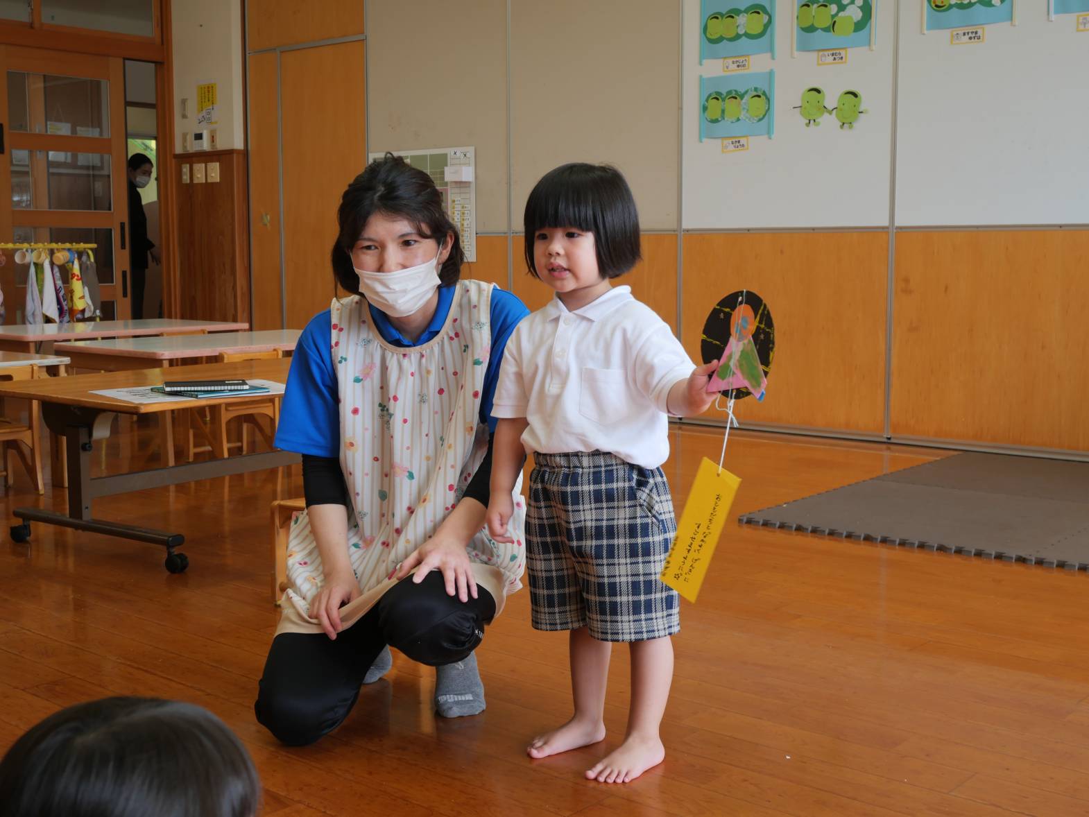 先生が「七夕ってどんな日か知ってる?」と質問すると「お願い事をする日!」「おり姫さまとひこ星さまの日!」と元気いっぱい答えくれました。