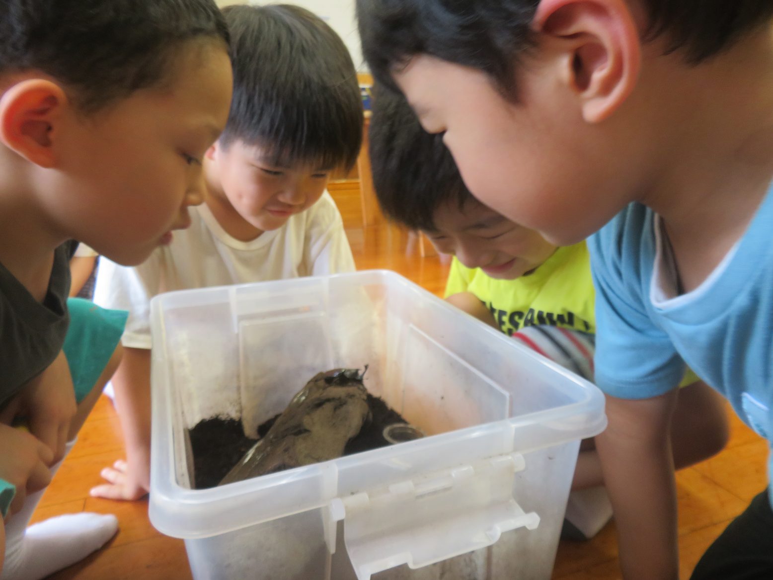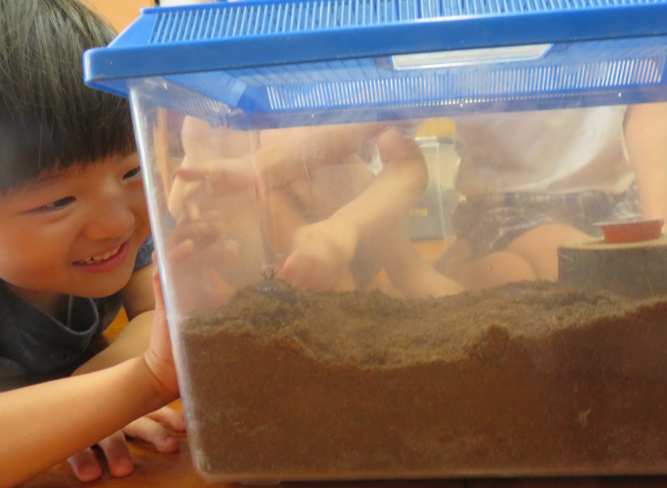 大きな虫かごに入ったカブトムシ。はじめに姿を見せたのは1匹だけで「あれ1匹なのかな?」「あとのみんなはどこかな?」と興味津々な様子の子どもたち。