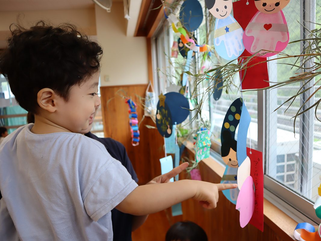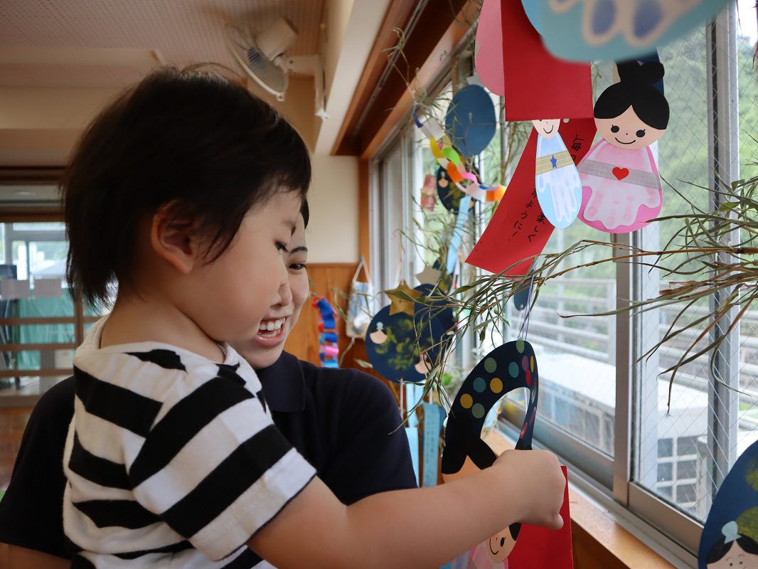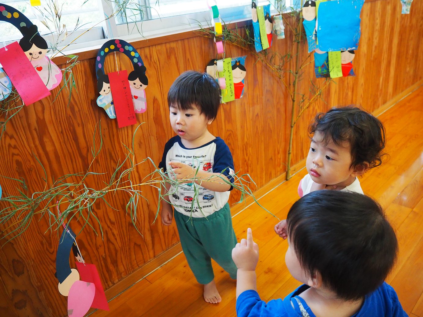 完成した七夕の笹を嬉しそうに眺める子どもたち。