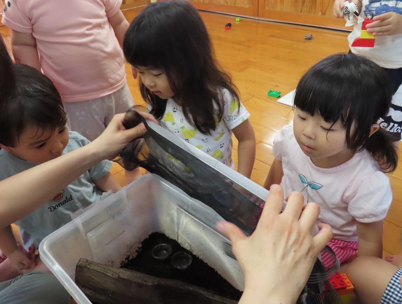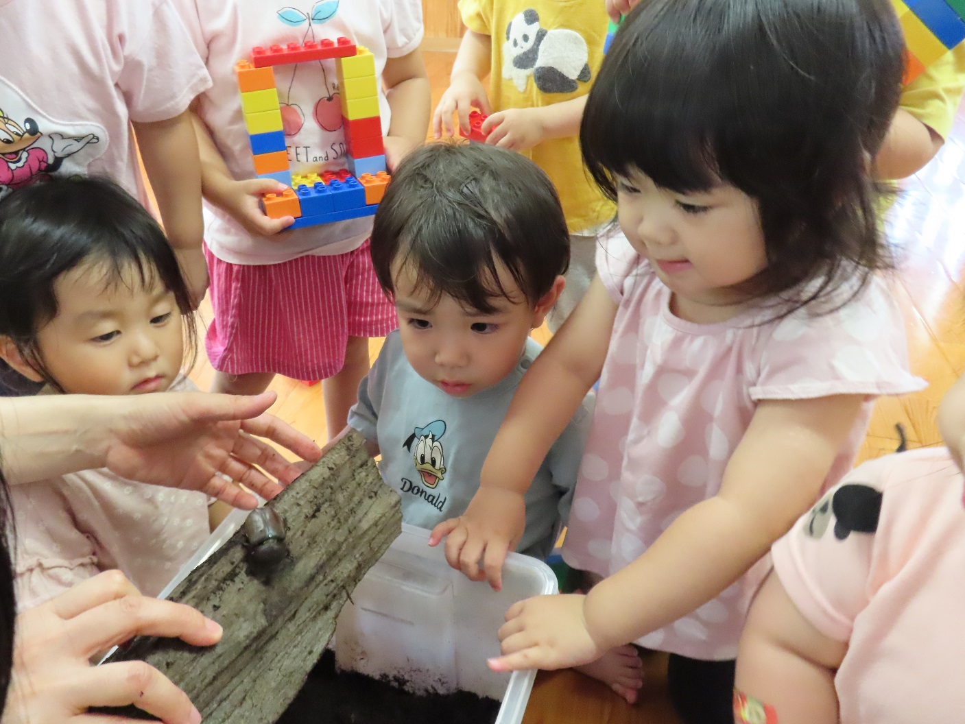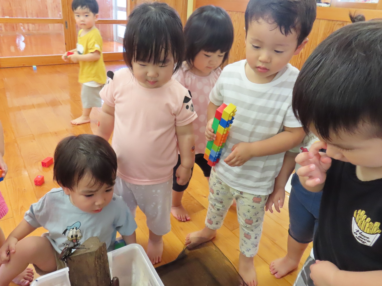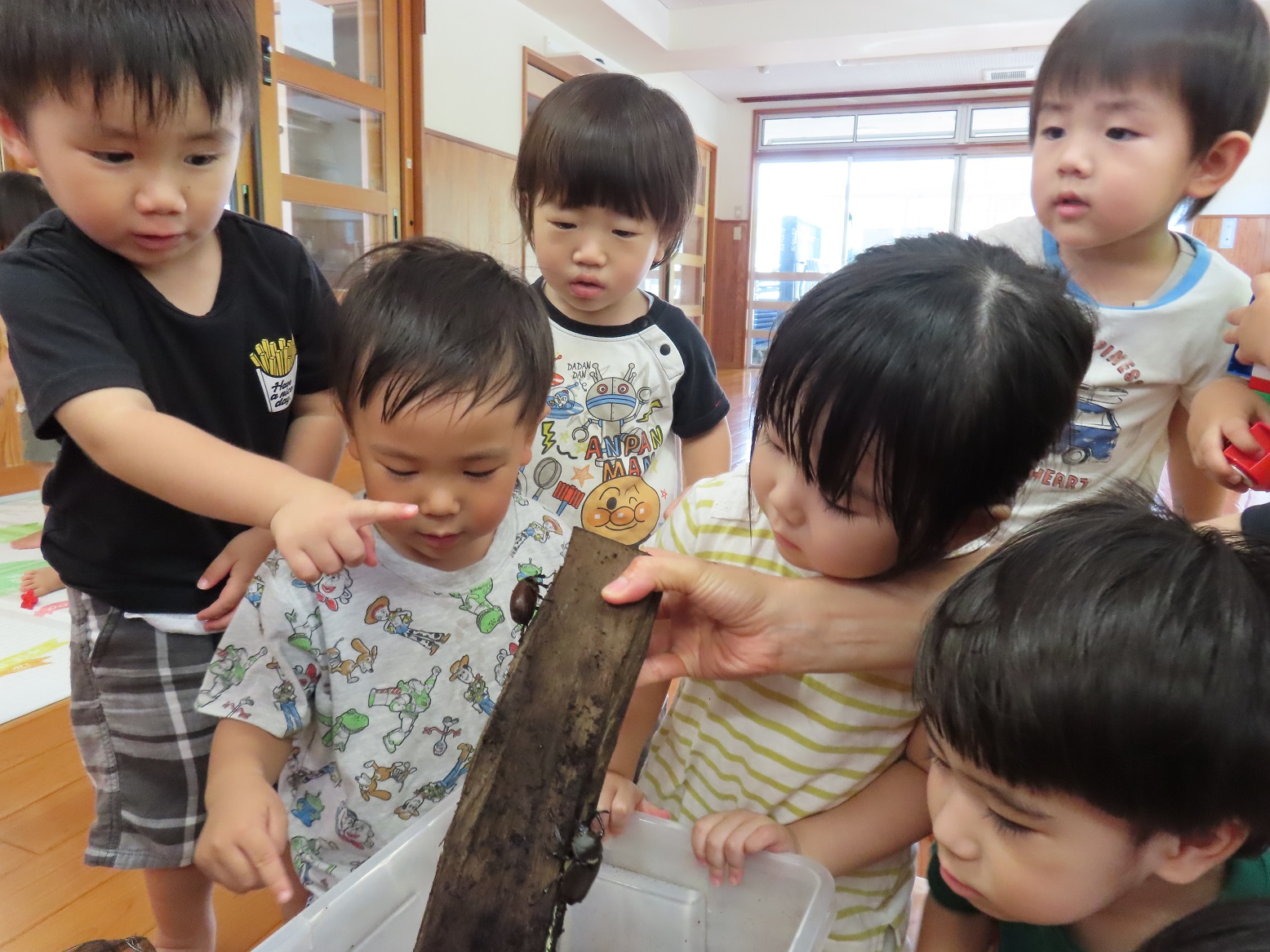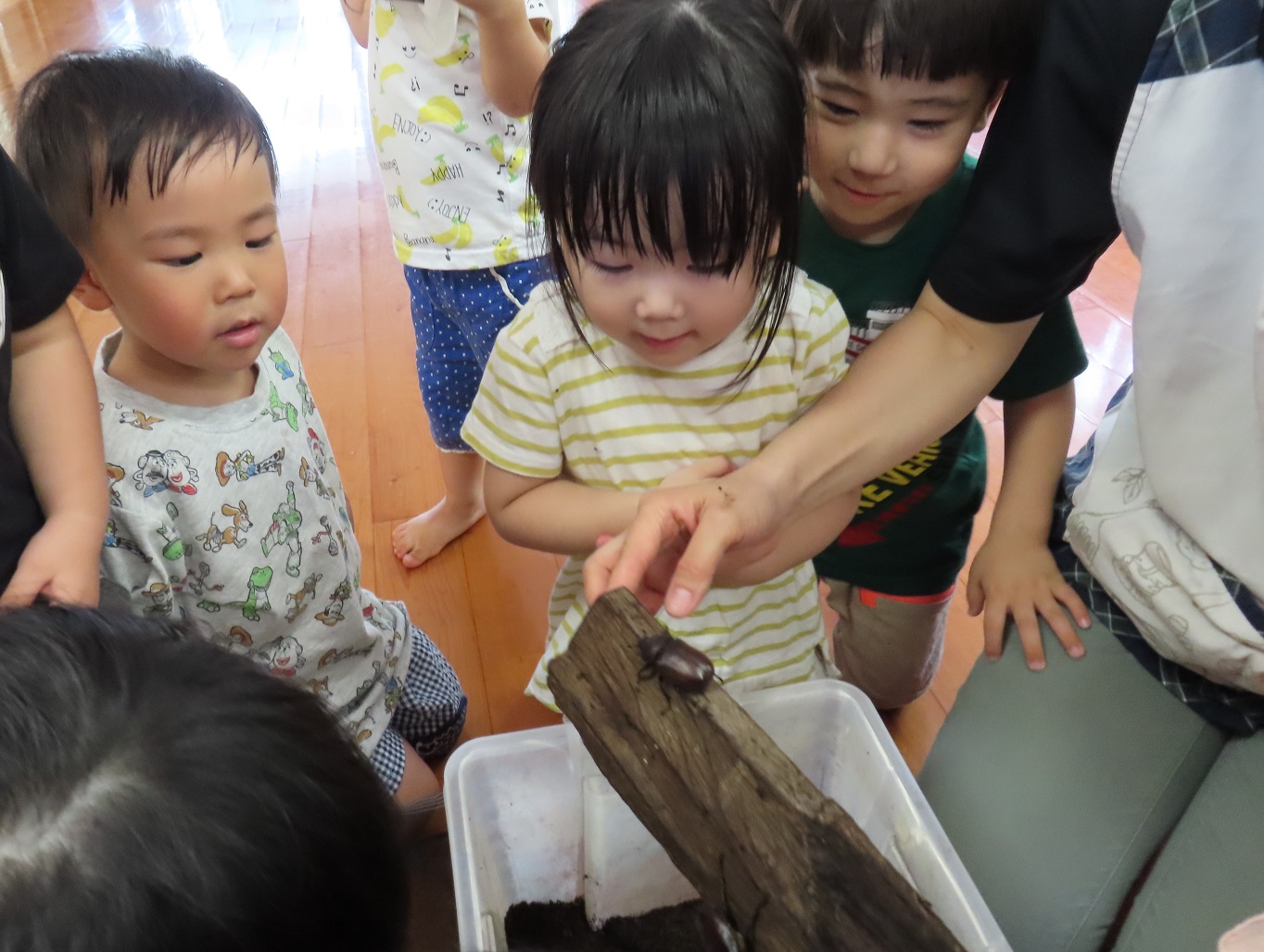 きりん組さんで飼育しているカブトムシをぱんだ組さんにも少しの間連れてきました。 蓋を開けると、何がいるのかのぞき込む子どもたち。 カブトムシの姿を見つけると、とても嬉しそうです。 「わあ~動いてるね。」「木に登ってる!」とカゴに顔を近づけてじっと観察したり、「なんかちょっとこわいなぁ。」と少し離れて見たり。 それでも皆カブトムシが気になって仕方がない様子です。 中には、カブトムシを触ってみようと手を伸ばす子どもの姿も見られました。 園庭でも様々な虫を探して、じっくり観察してみたいと思います!