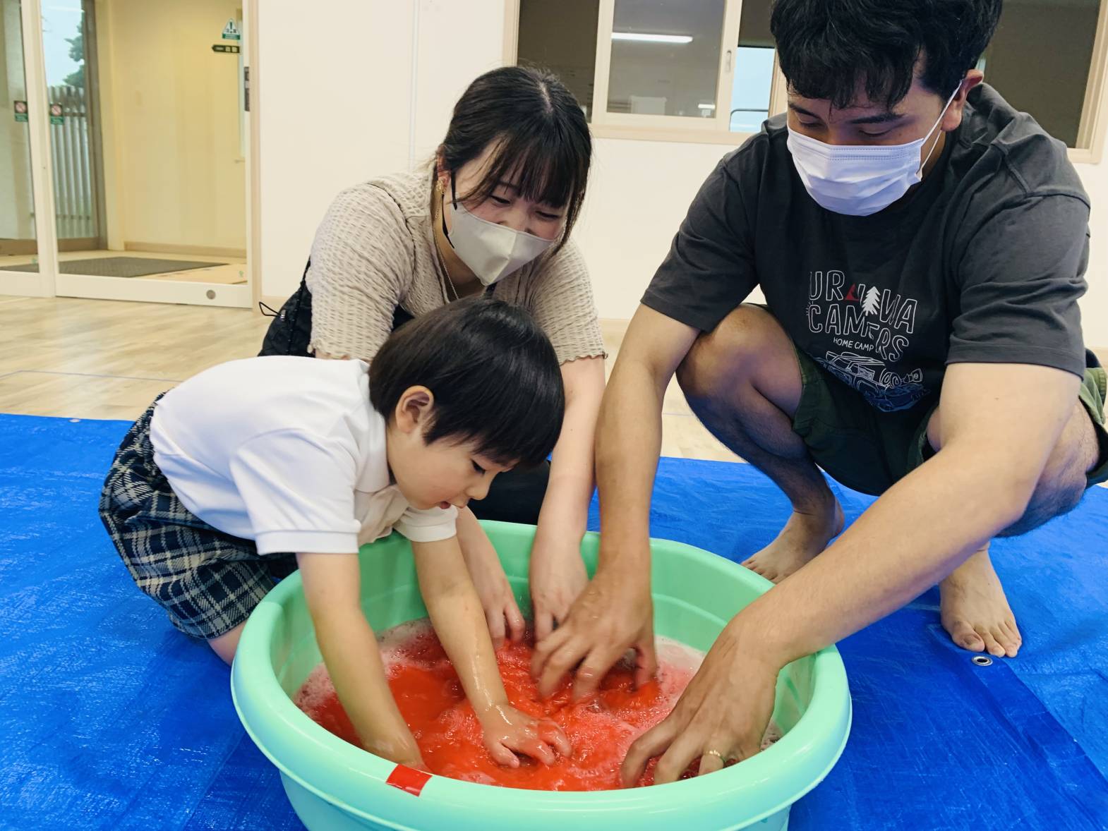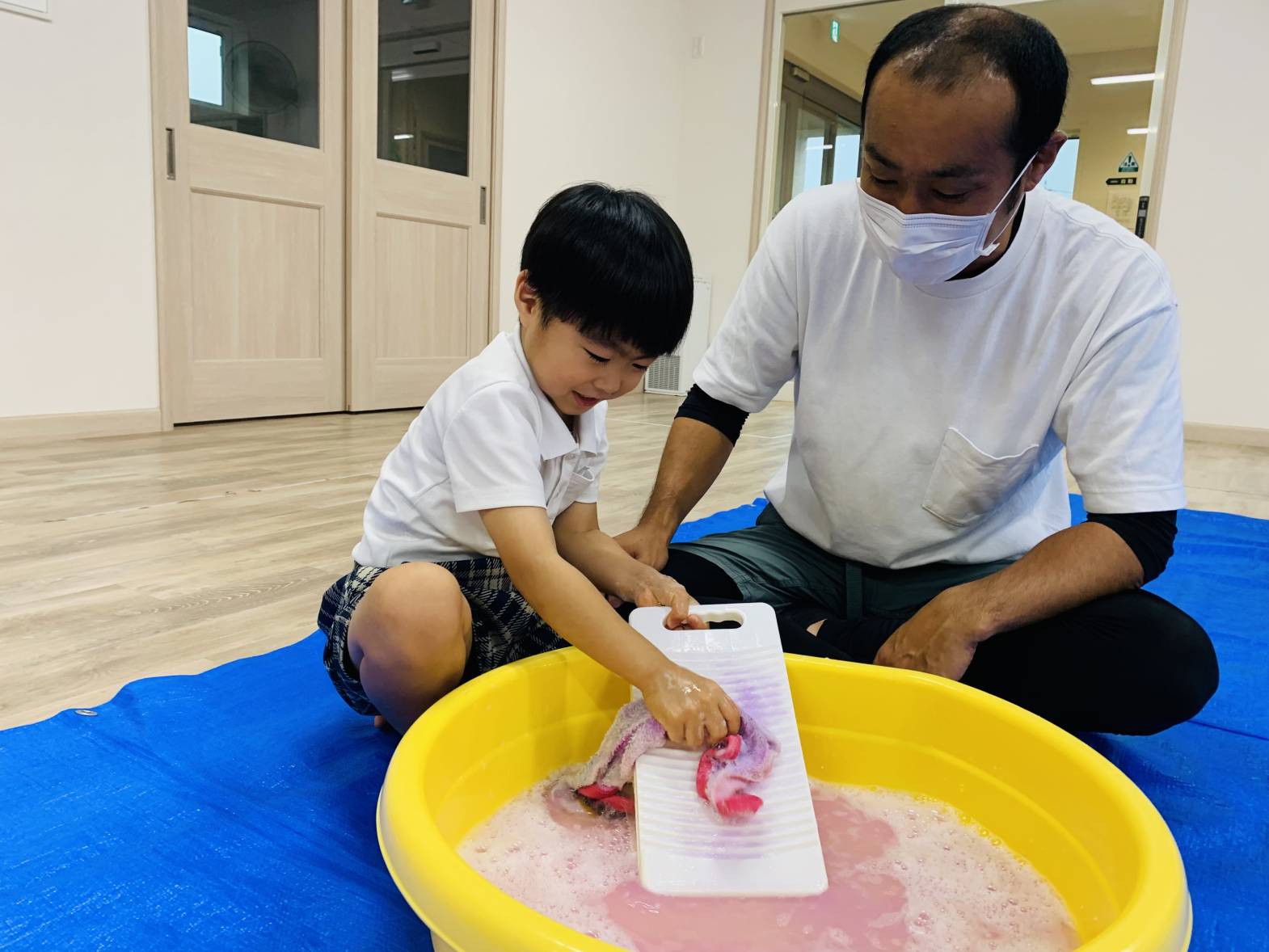 汚れに見立てて絵の具をつけたタオルをこすり合わせたり、洗濯板を使用したりして保護者の方にコツを教えてもらいながら、一生懸命洗う子どもたち!