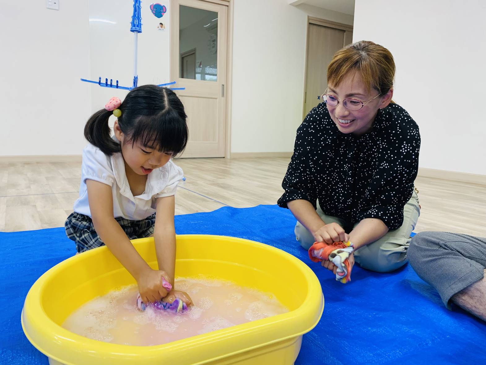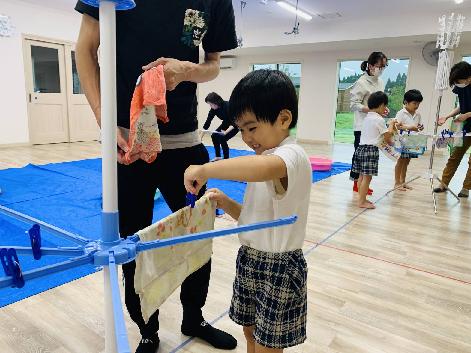 雑巾絞りの練習も行い、綺麗になったタオルを見て、「綺麗になった~♪」と喜ぶ声が聞かれました♪