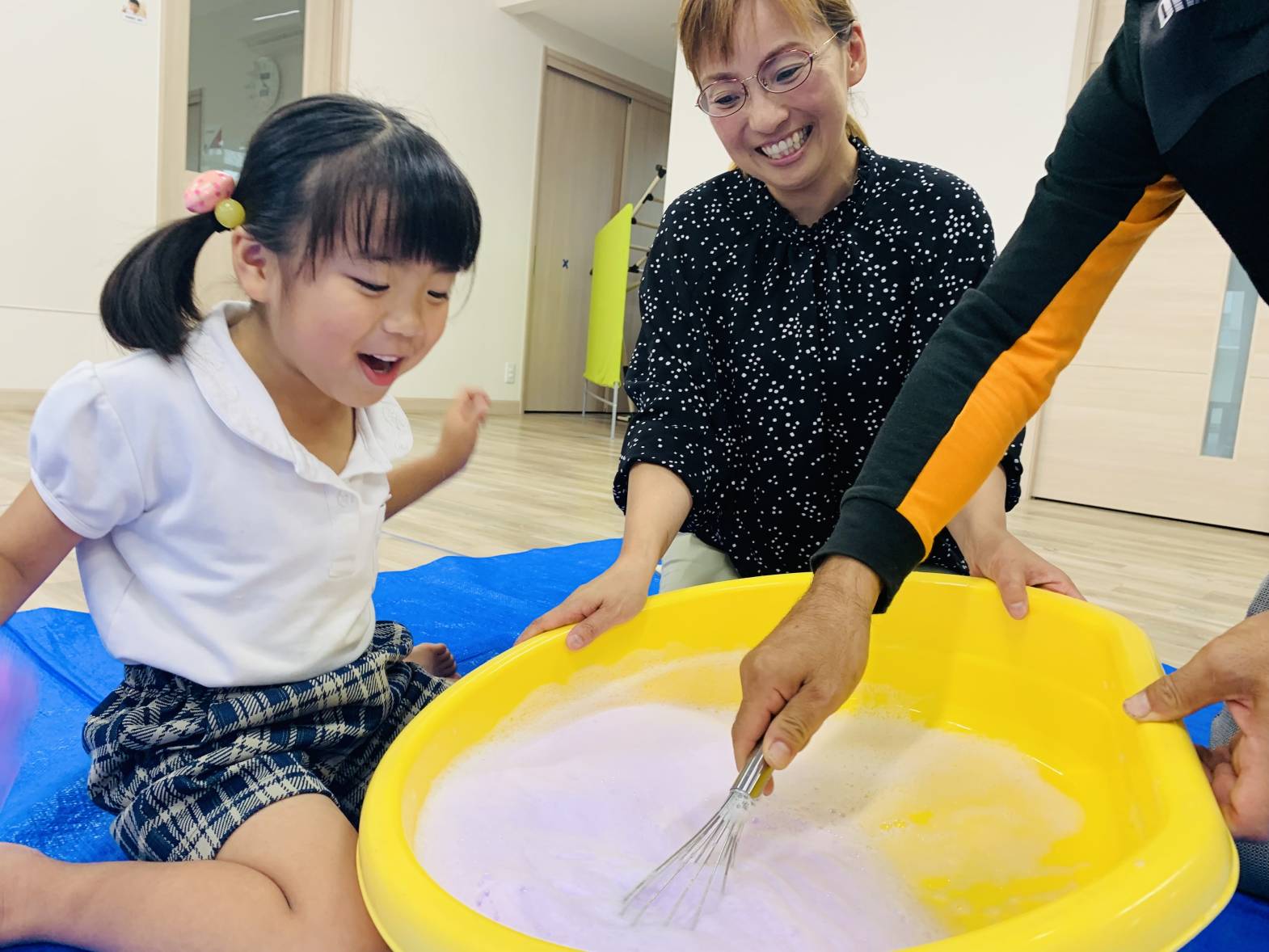 泡立て器や泡立てネットを使用し、更に泡を立て、泡の感触やプチプチはじく音を楽しむ姿が見られました!