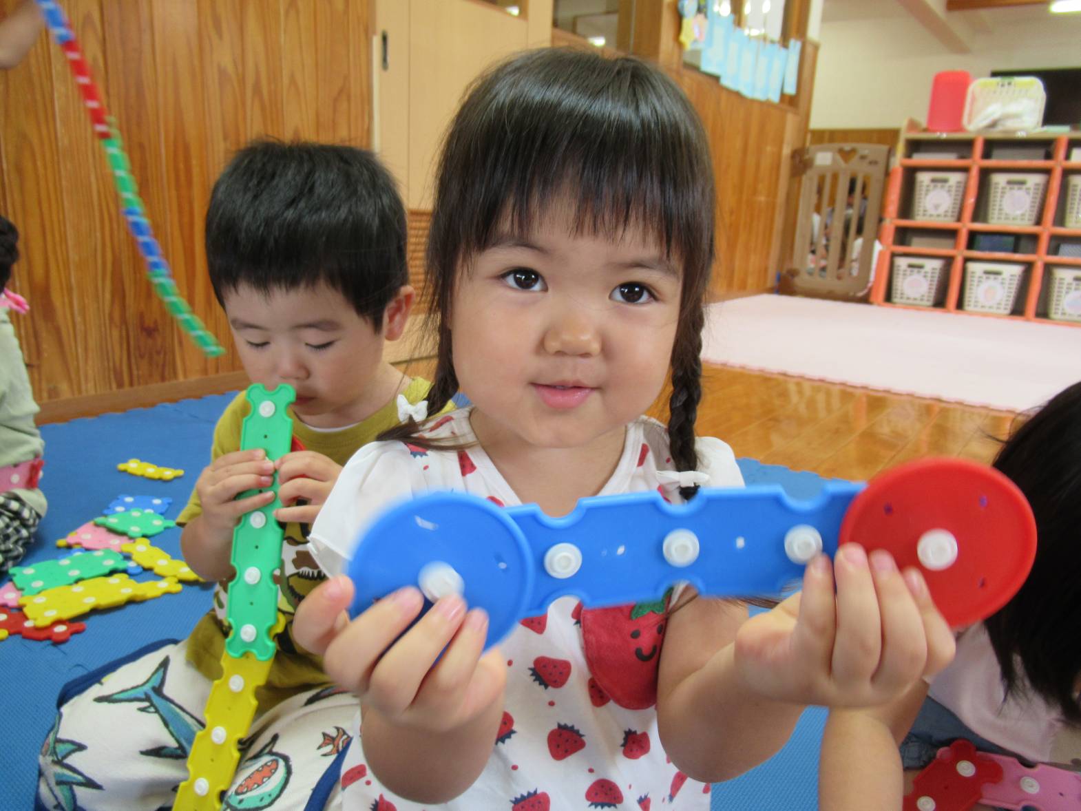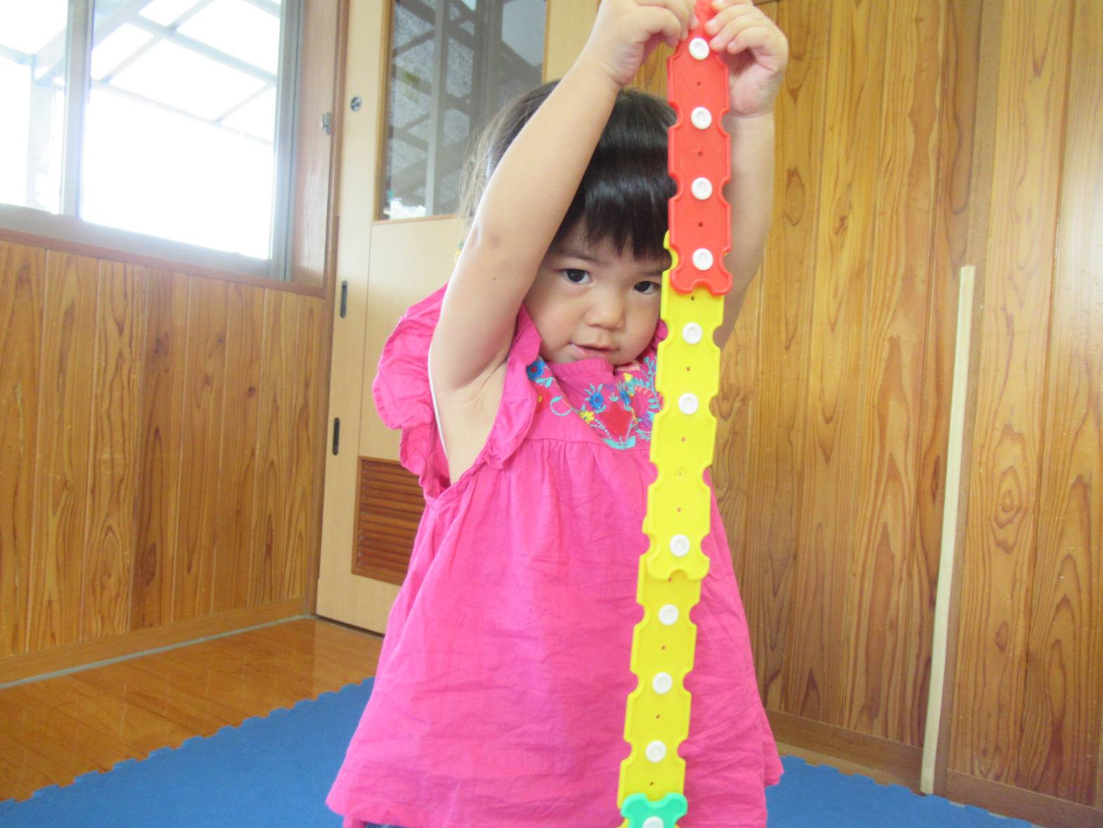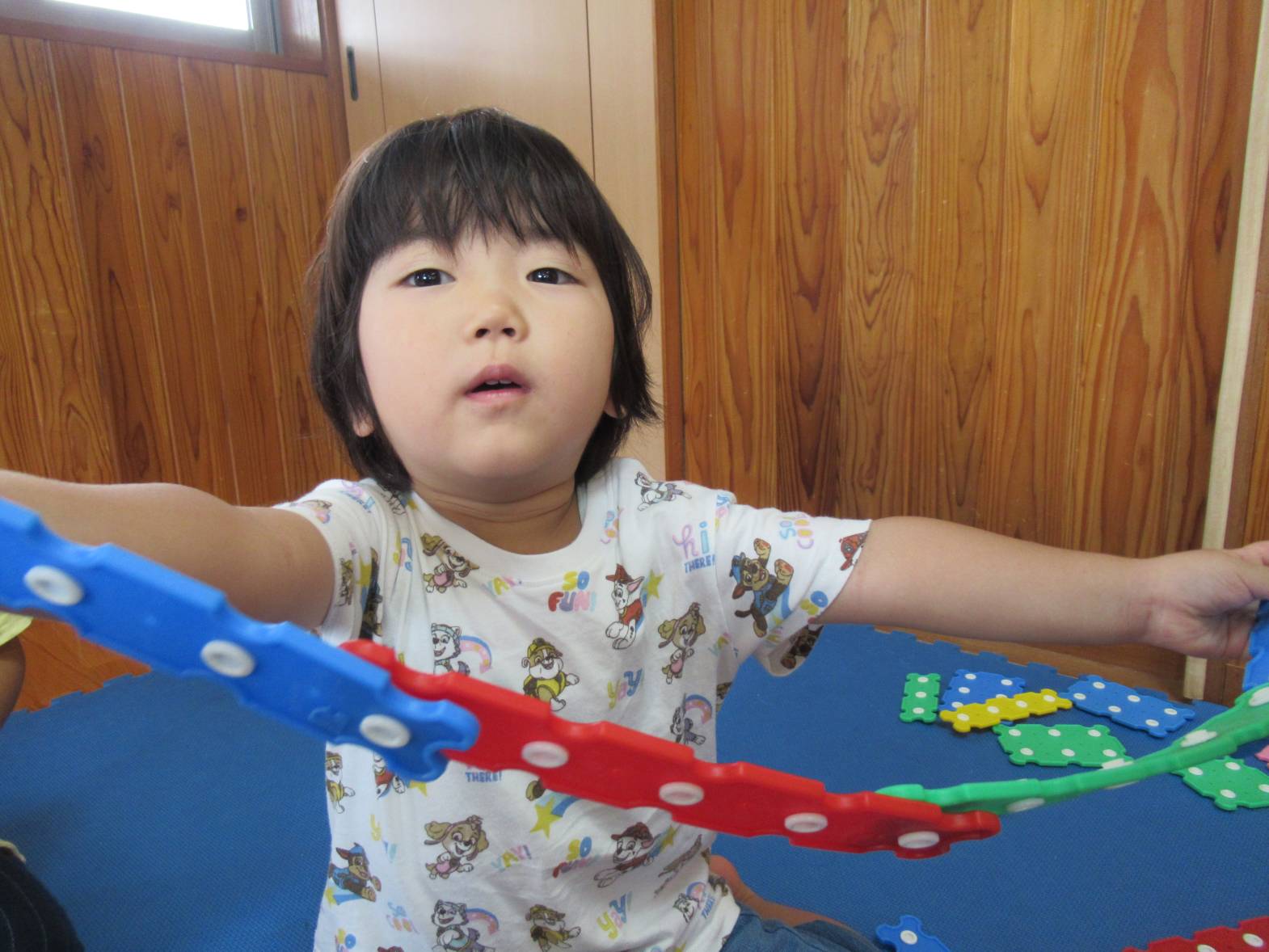 指先の力が少しずつ発達し、ホックブロックで遊ぶと長く繋げることができるようになってきた子どもたち。 「パチってできた!」、「見て!かわいいでしょ!」と腕や首に付け、アクセサリーに見立てたり、ヒーローになりきったりする姿が見られます。 玩具の貸し借りが上手くいかず涙を見せることがありますが、その都度代弁しながら様子を見守っていきたいと思います。