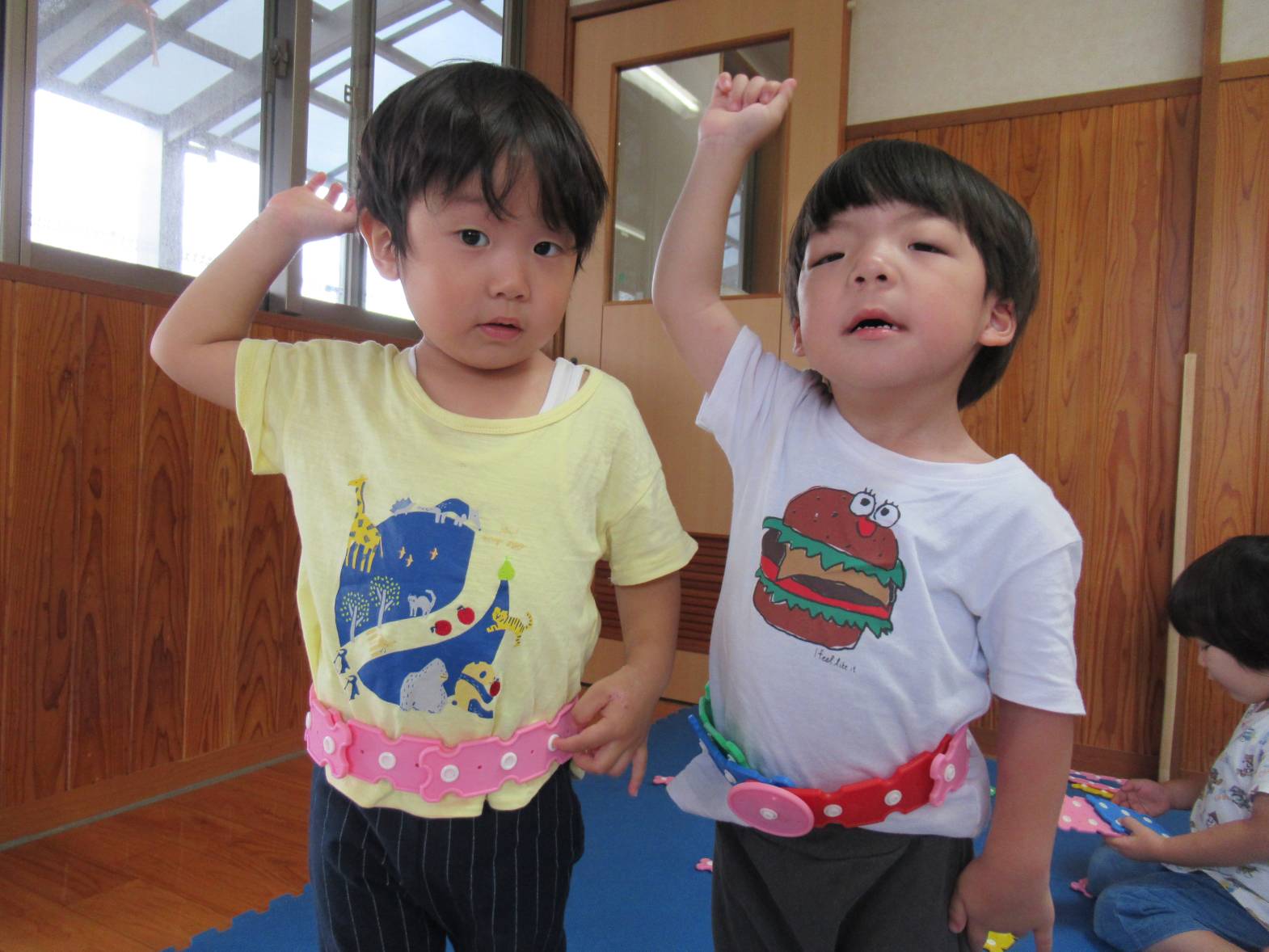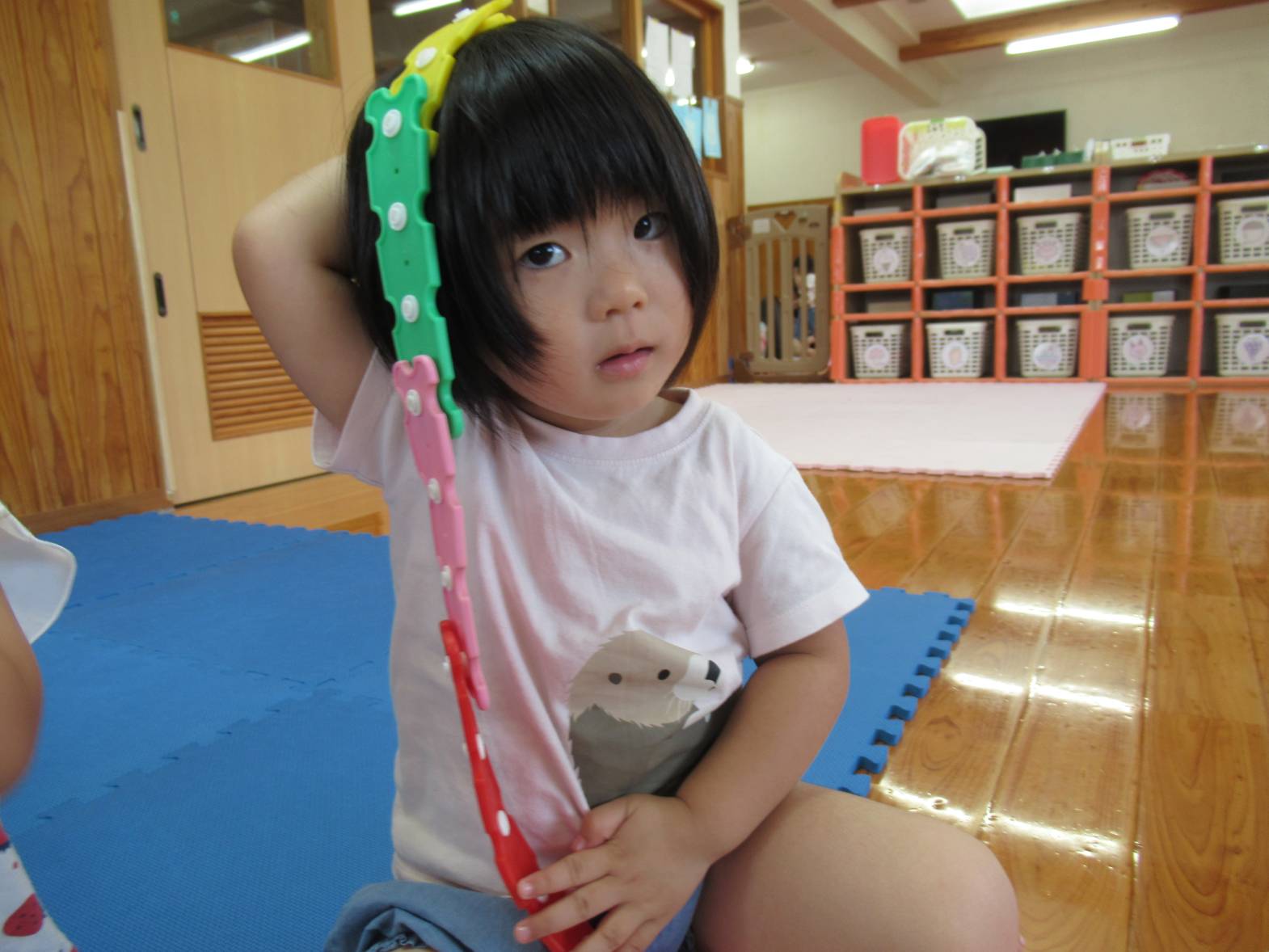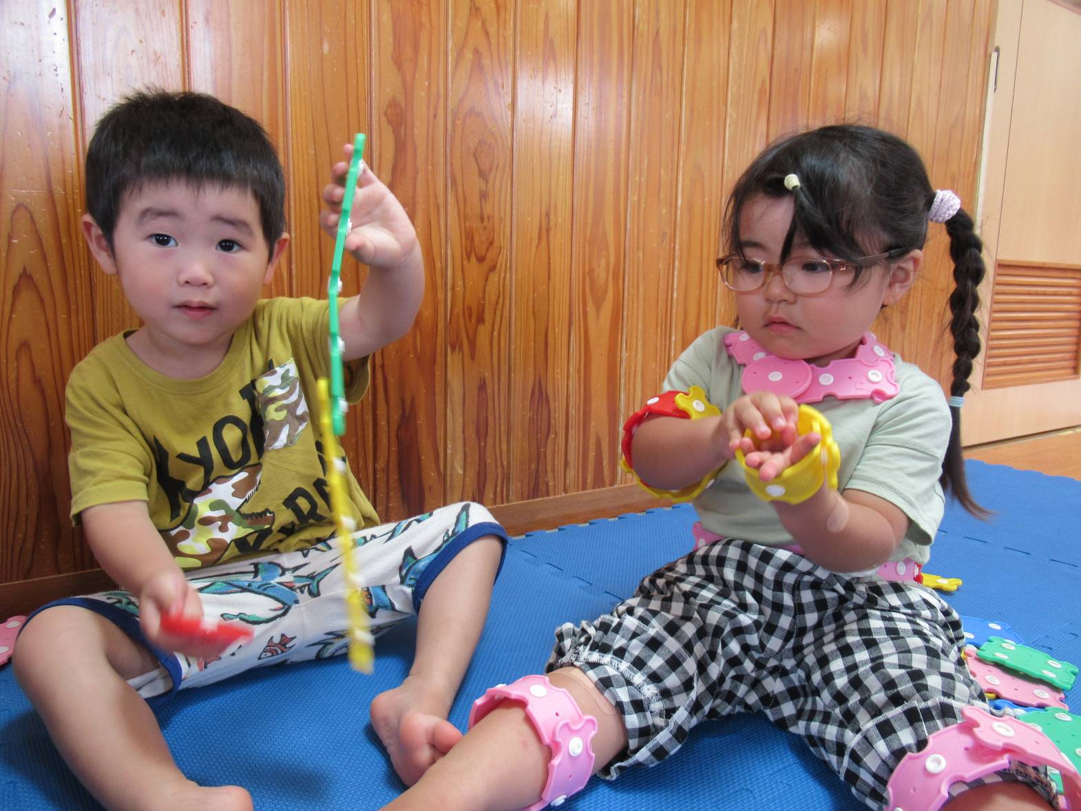 指先の力が少しずつ発達し、ホックブロックで遊ぶと長く繋げることができるようになってきた子どもたち。 「パチってできた!」、「見て!かわいいでしょ!」と腕や首に付け、アクセサリーに見立てたり、ヒーローになりきったりする姿が見られます。 玩具の貸し借りが上手くいかず涙を見せることがありますが、その都度代弁しながら様子を見守っていきたいと思います。