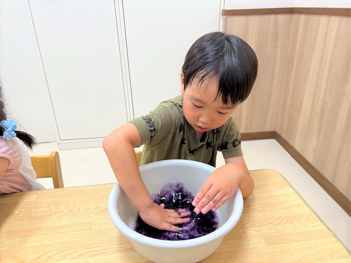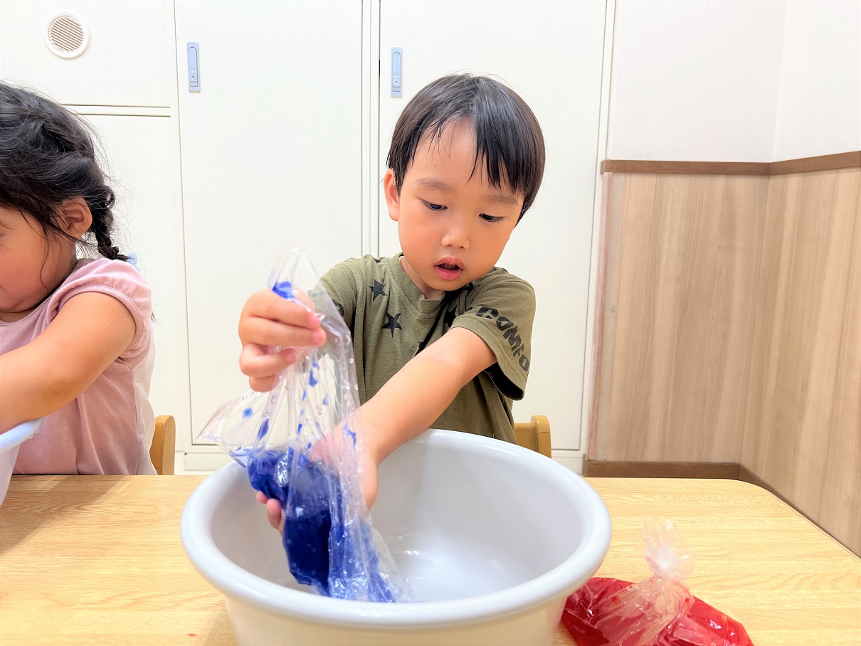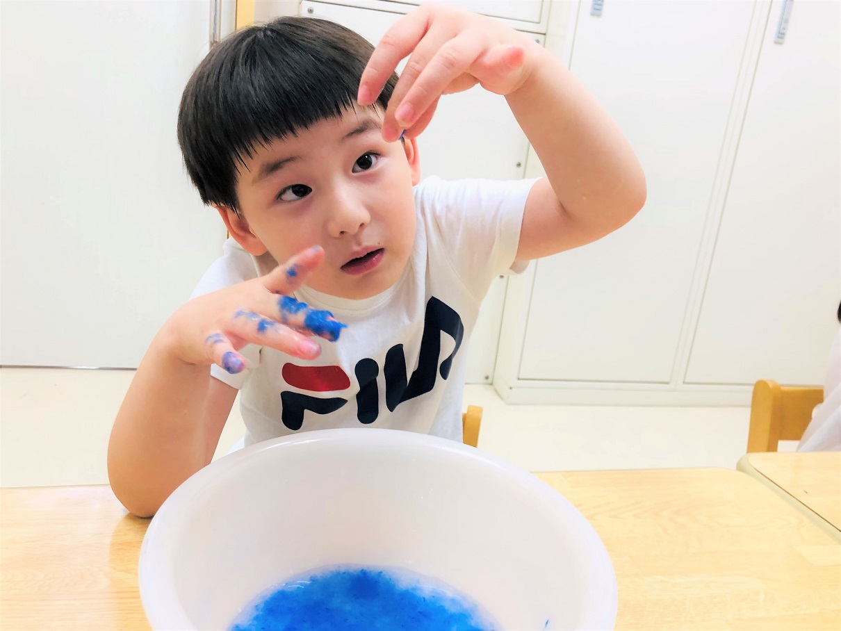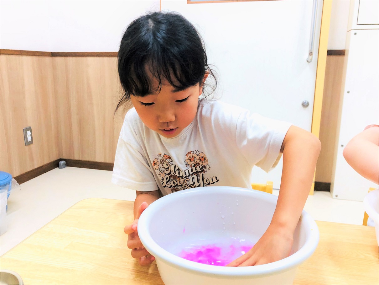 変わった色に、「うわあ!水色になった!」「私の色はこんな色になったよ!」とお友達と話しながら、変化に気付いていく子どもたち。