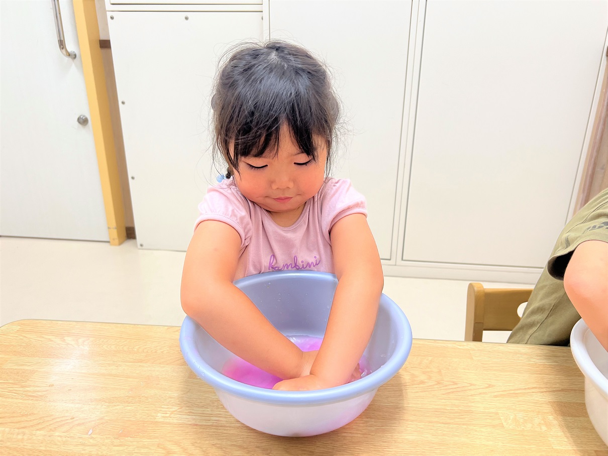気温も高くなり汗ばむ陽気が続いている中、涼しさを感じる色水遊びを行いました!
