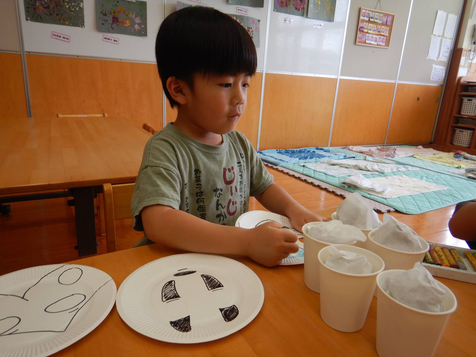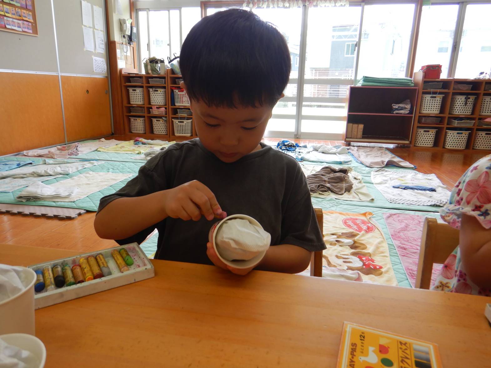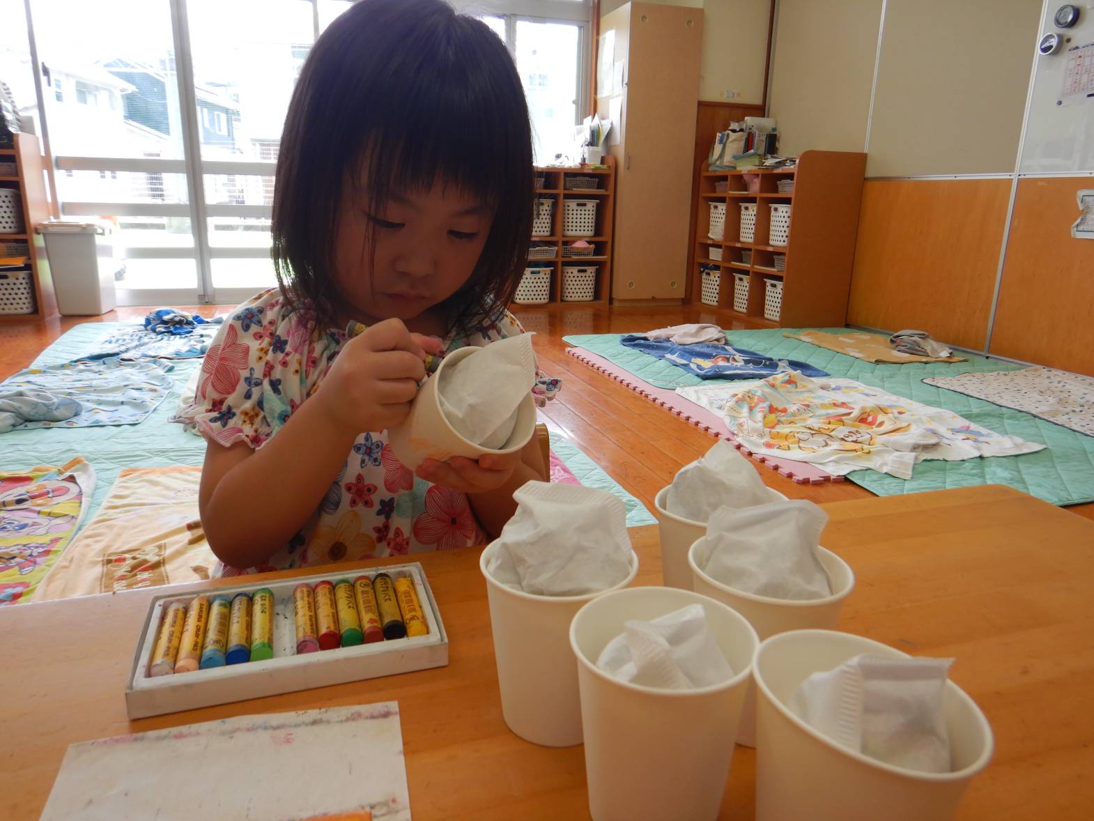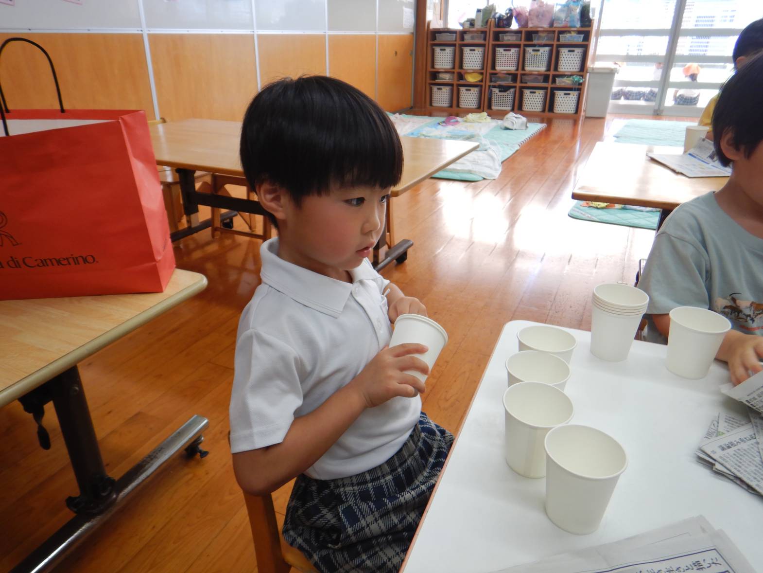 かき氷屋さんでは、新聞紙を丸めて紙コップに詰めたり、紙コップに絵柄をつけたりしていきます。「何味にしようかな」「かわいい絵が描けたよ!」と嬉しそうです。