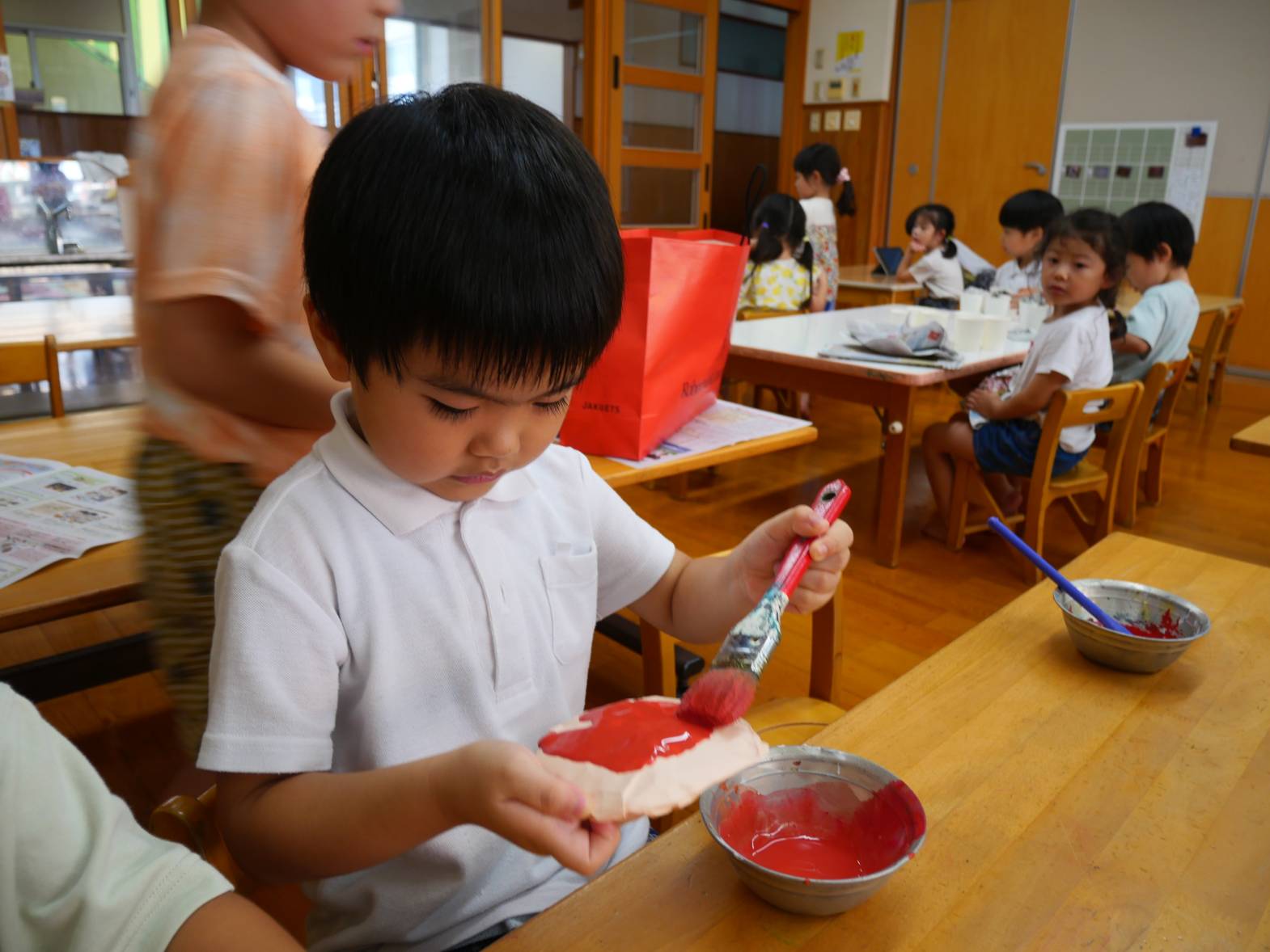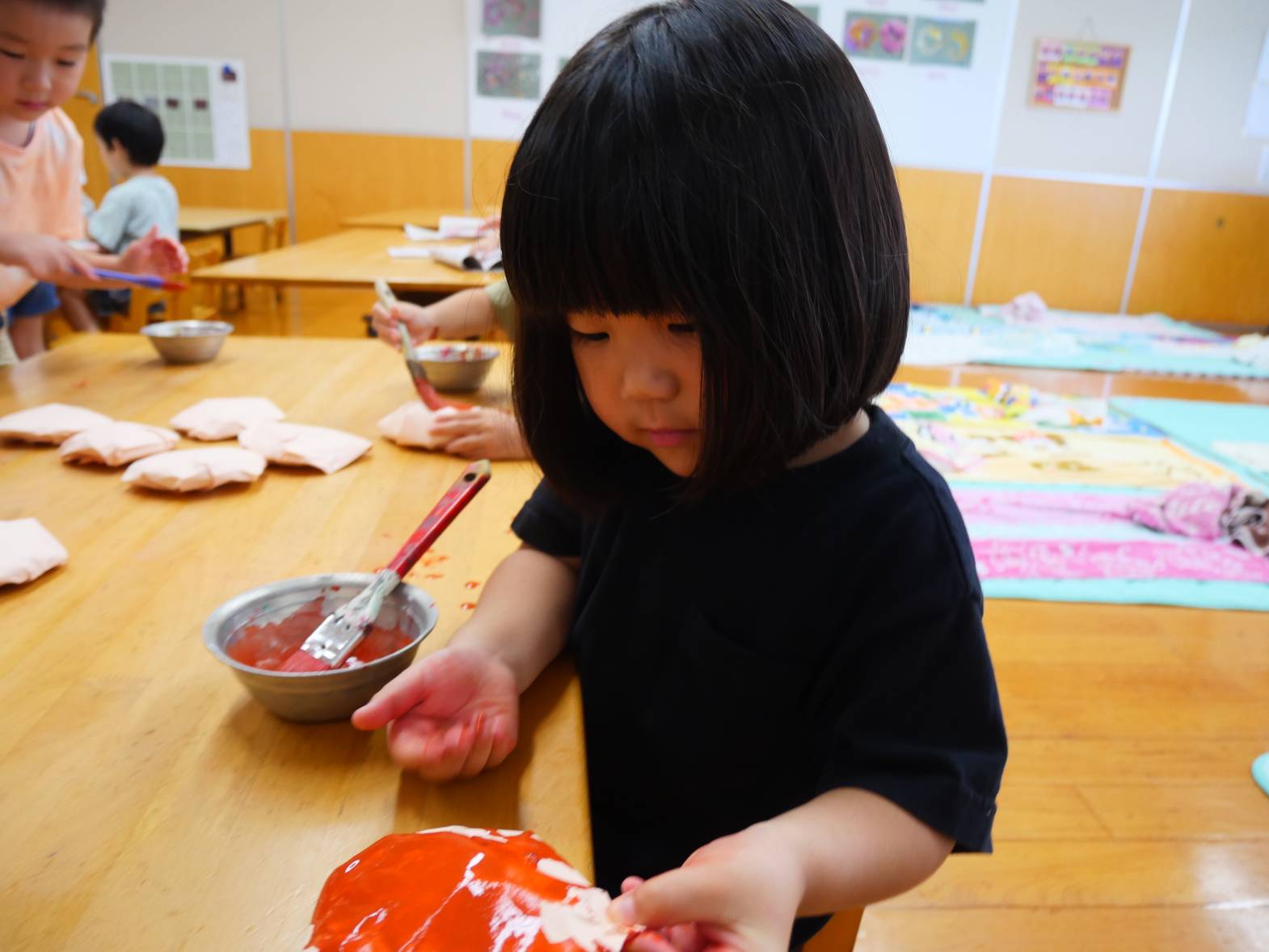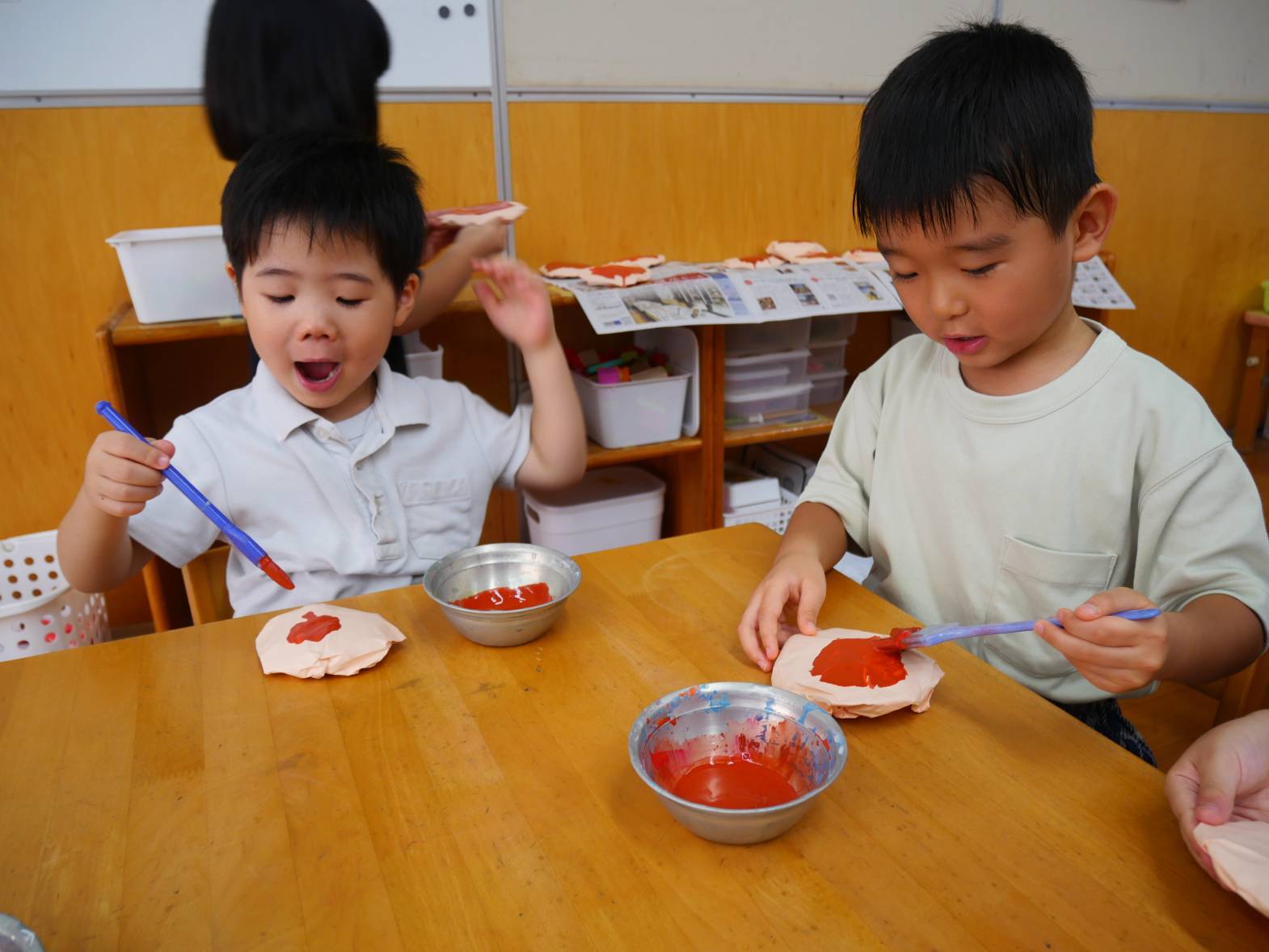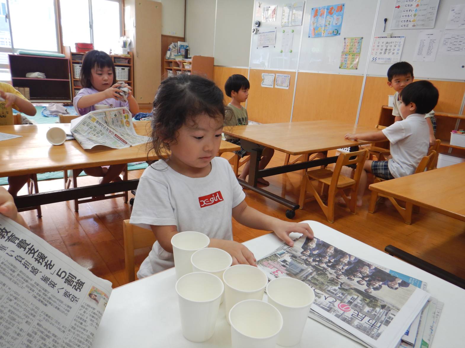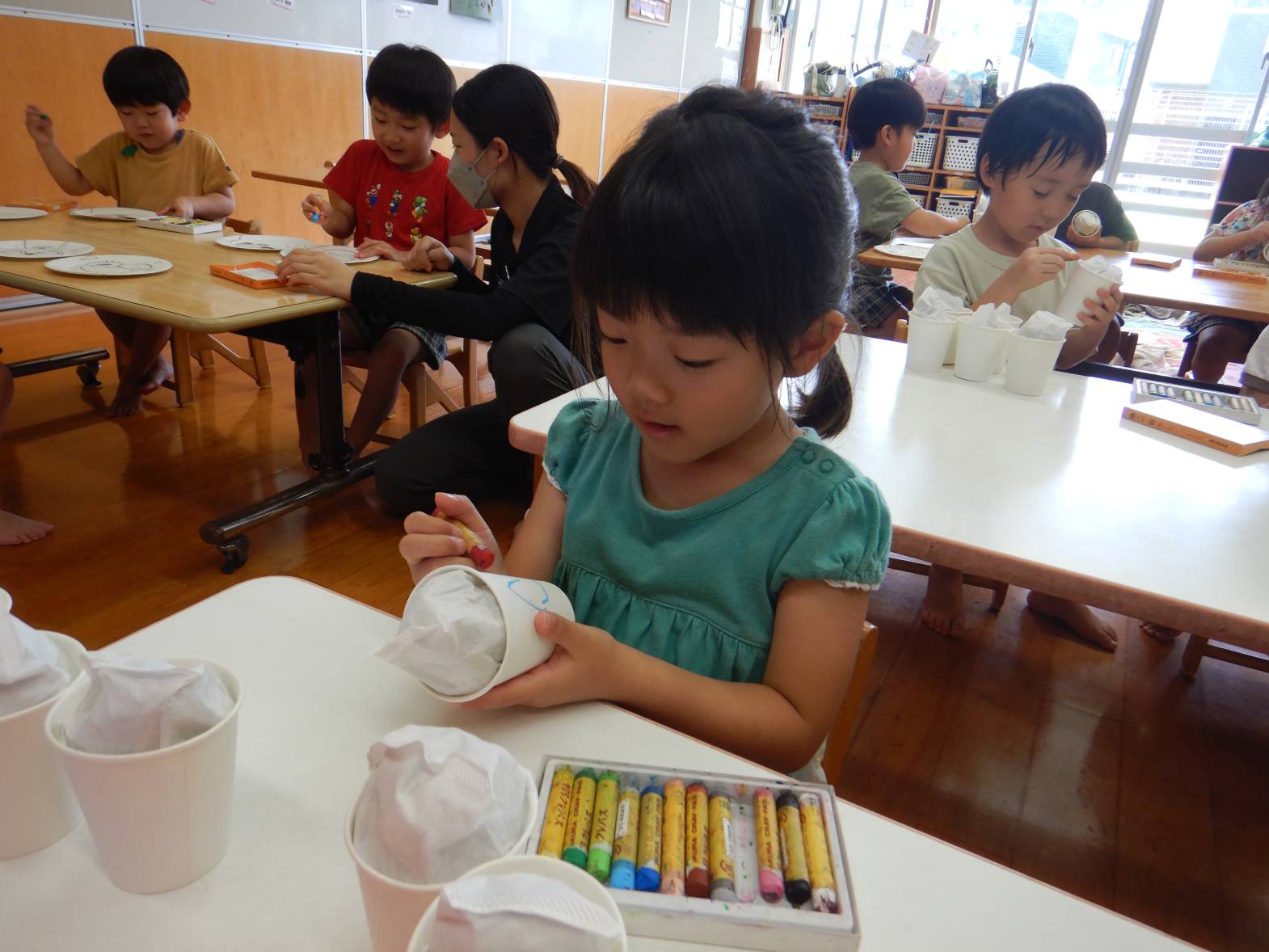 かき氷屋さんでは、新聞紙を丸めて紙コップに詰めたり、紙コップに絵柄をつけたりしていきます。「何味にしようかな」「かわいい絵が描けたよ!」と嬉しそうです。