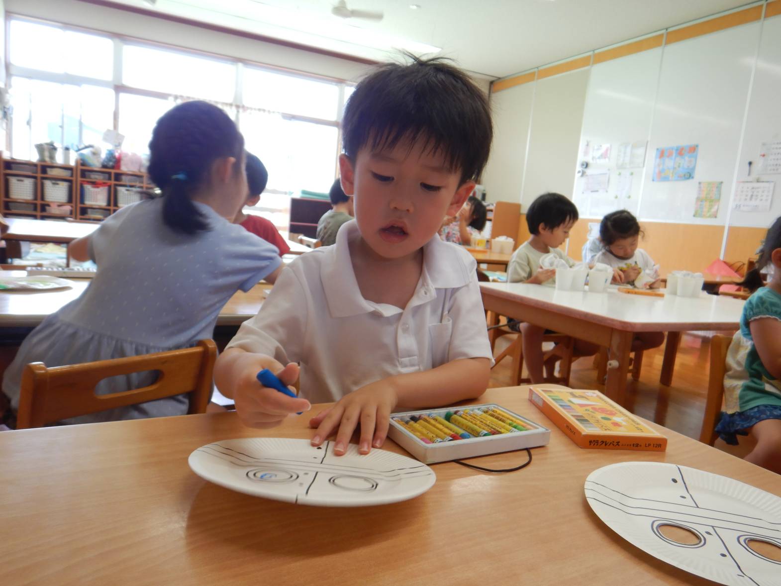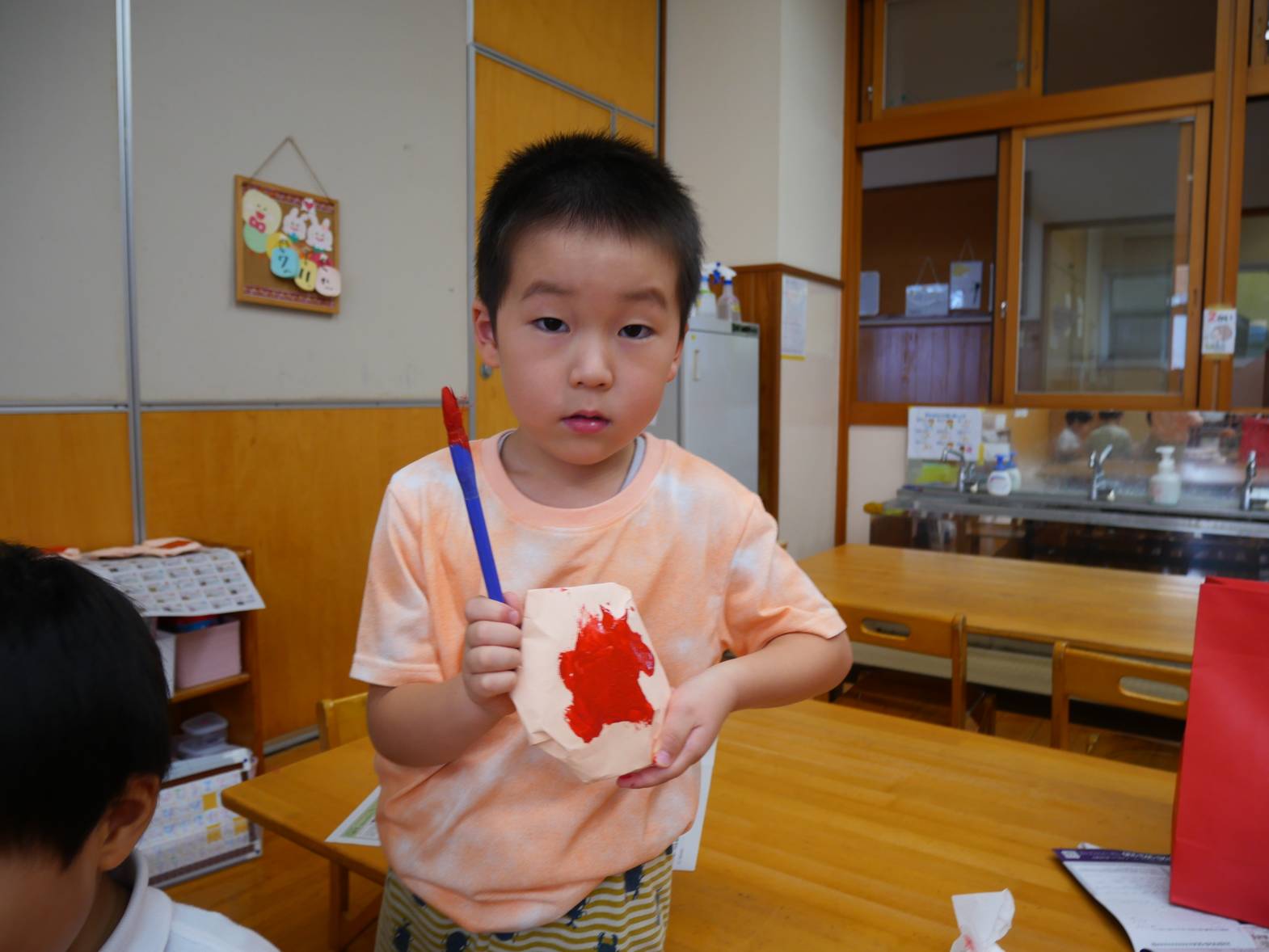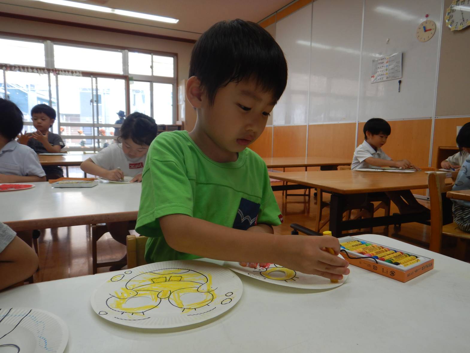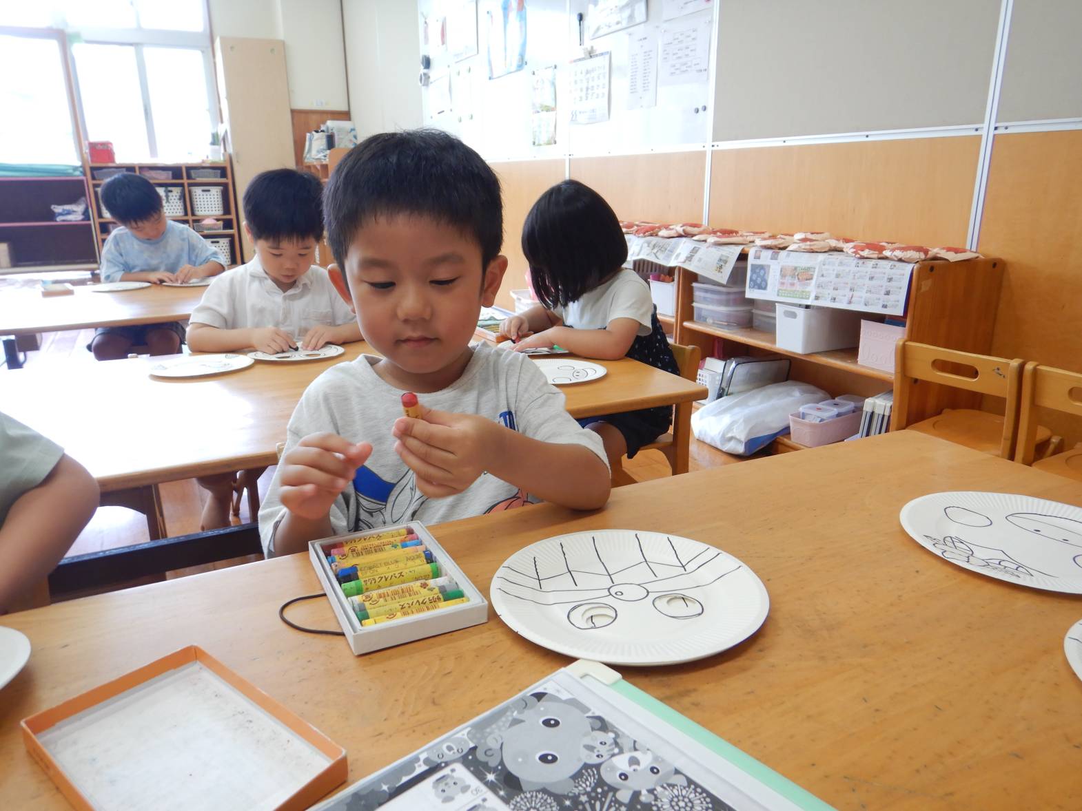 お面屋さんでは、たくさんのキャラクターのお面に色を塗っていきます。「アンパンマンの鼻は赤で…」と丁寧にクレヨンで色を重ねていきます。できたお面を顔に当てて「見て見て!」と得意げな表情を見せてくれました。