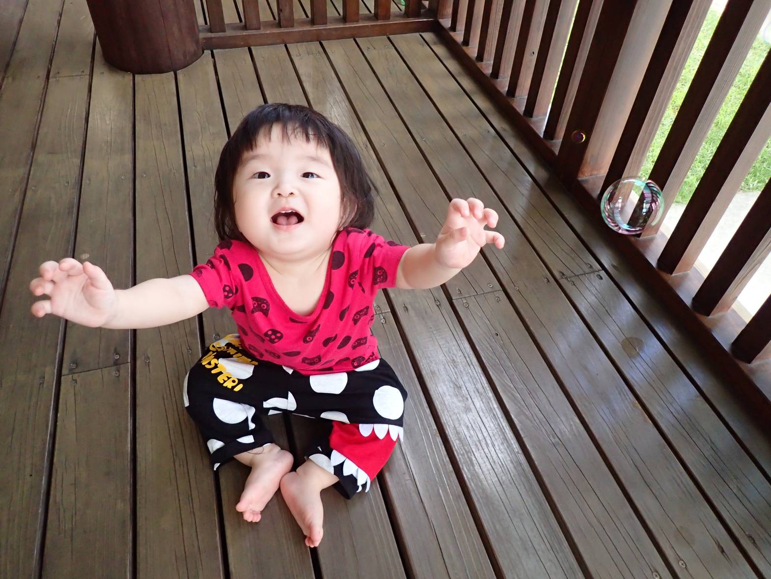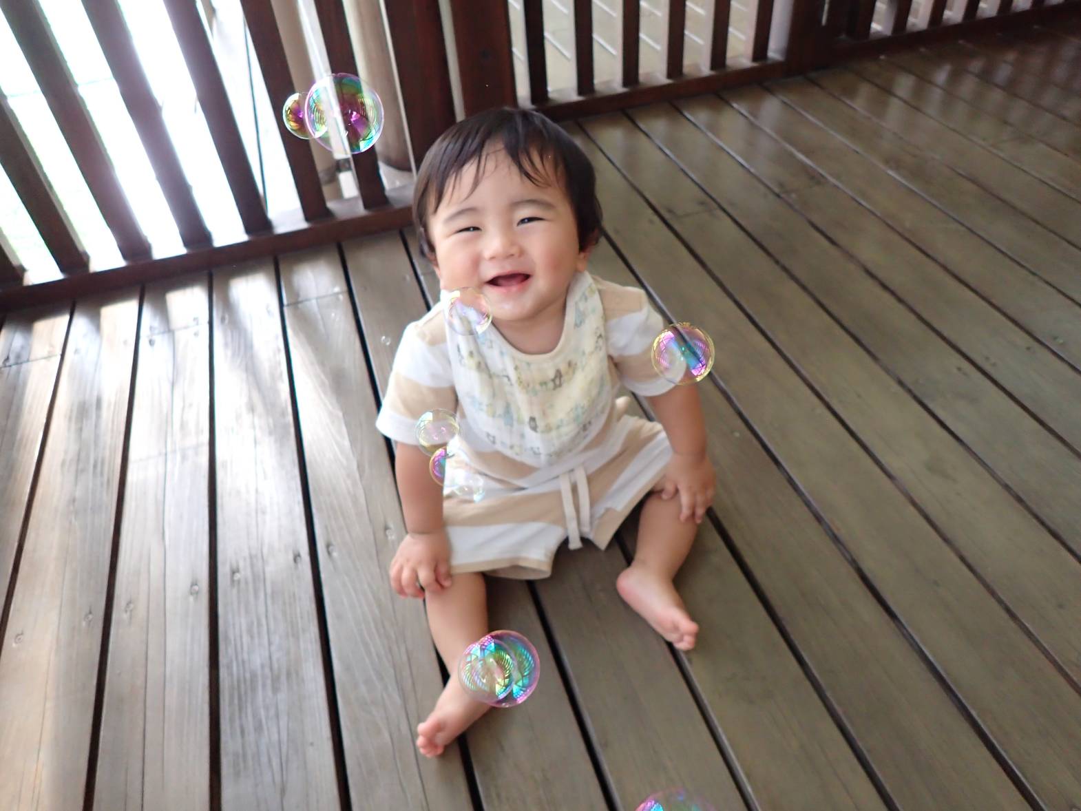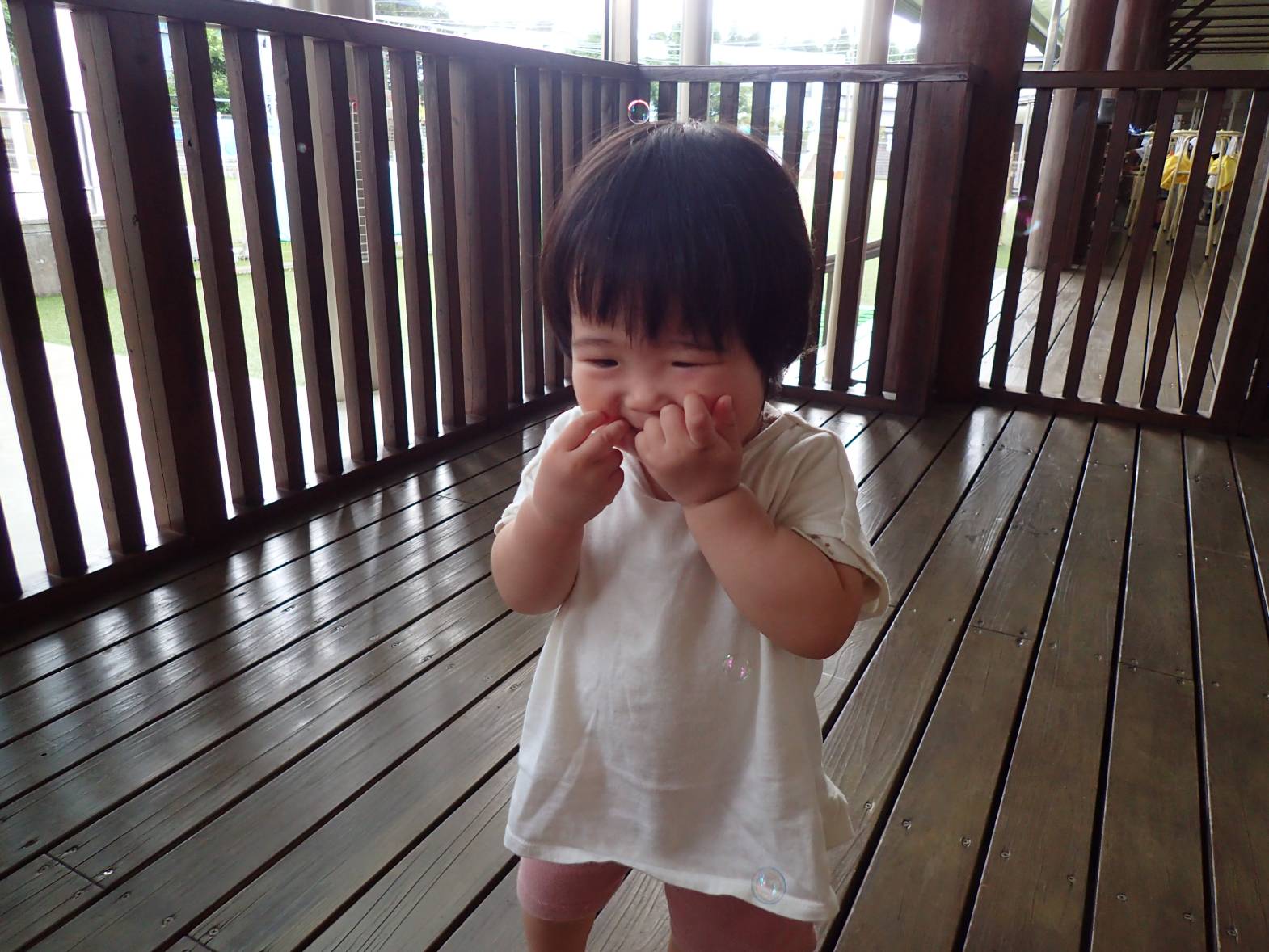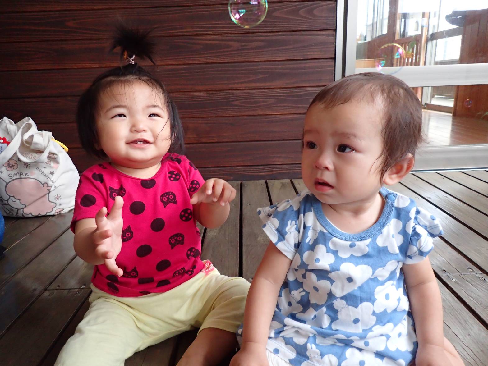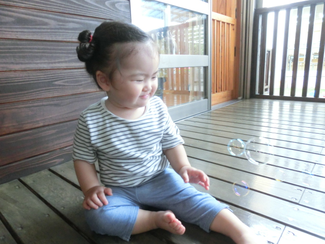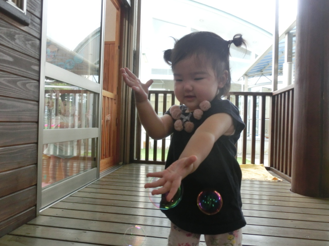 しゃぼん玉への興味が深まってきているひよこ組さん。 最初の頃は、不思議そうに眺めていることが多かったですが、現在では「おー!」と嬉しそうに手を伸ばしたり、後を追ったりする姿も見られます。 顔の近くで弾けると、「ふふっ♪」と少しくすぐったそうです。 フワフワ飛んでいくシャボン玉に笑顔が絶えないひよこ組さんでした!