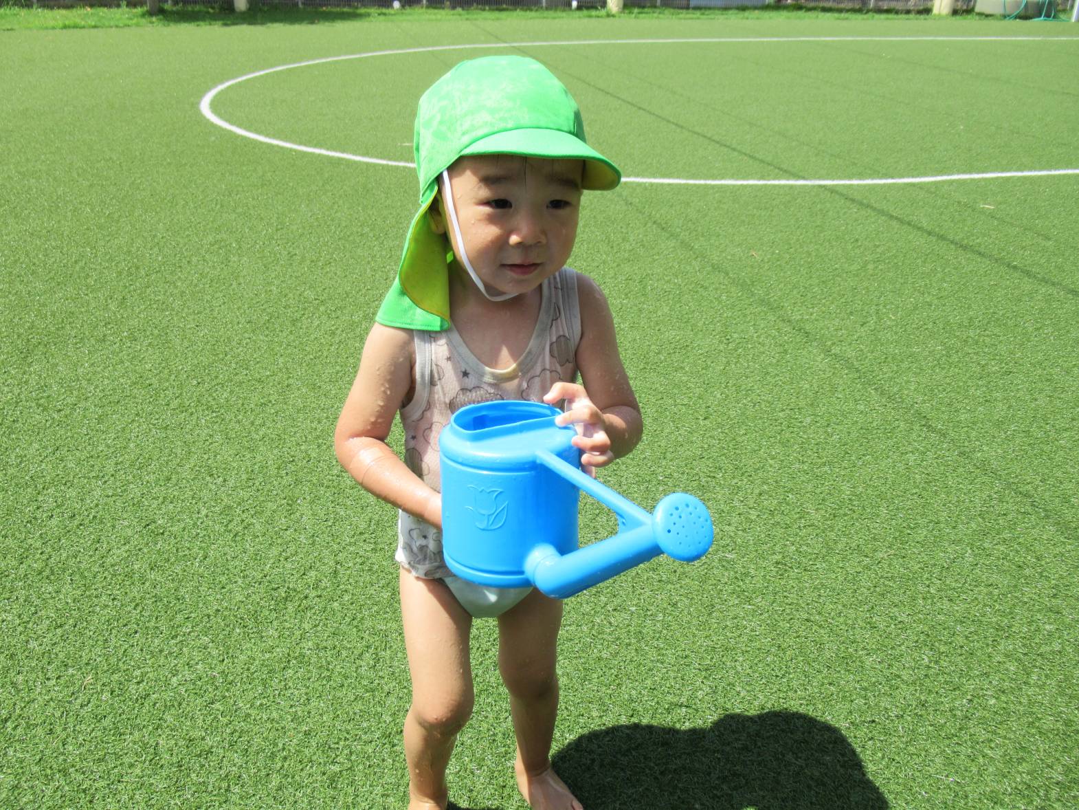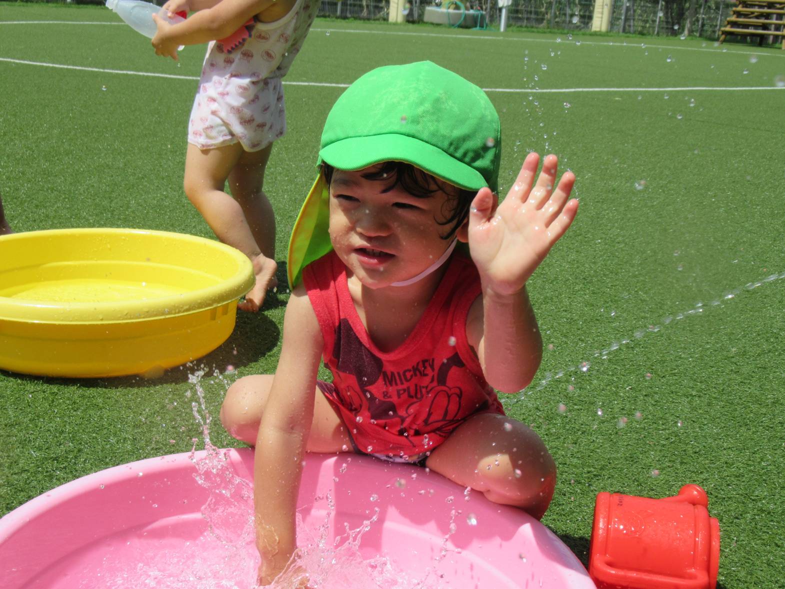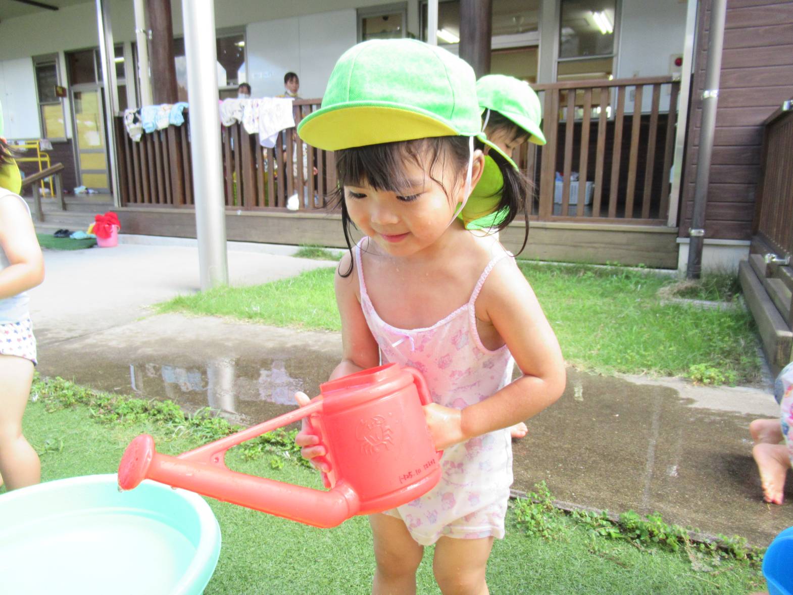 今月に入り、天気の良い日に子どもたちの大好きな水遊びをしています。 体に水がかかると、「キャー!冷たい!」とテンションが上がっている子どもたち。 桶に水を溜めると、ジョウロやマヨネーズの容器に水を入れ、保育者や友だちにかけることを楽しんでいます! 水に触れながら、夏の暑さを吹き飛ばしていけたらと思います。