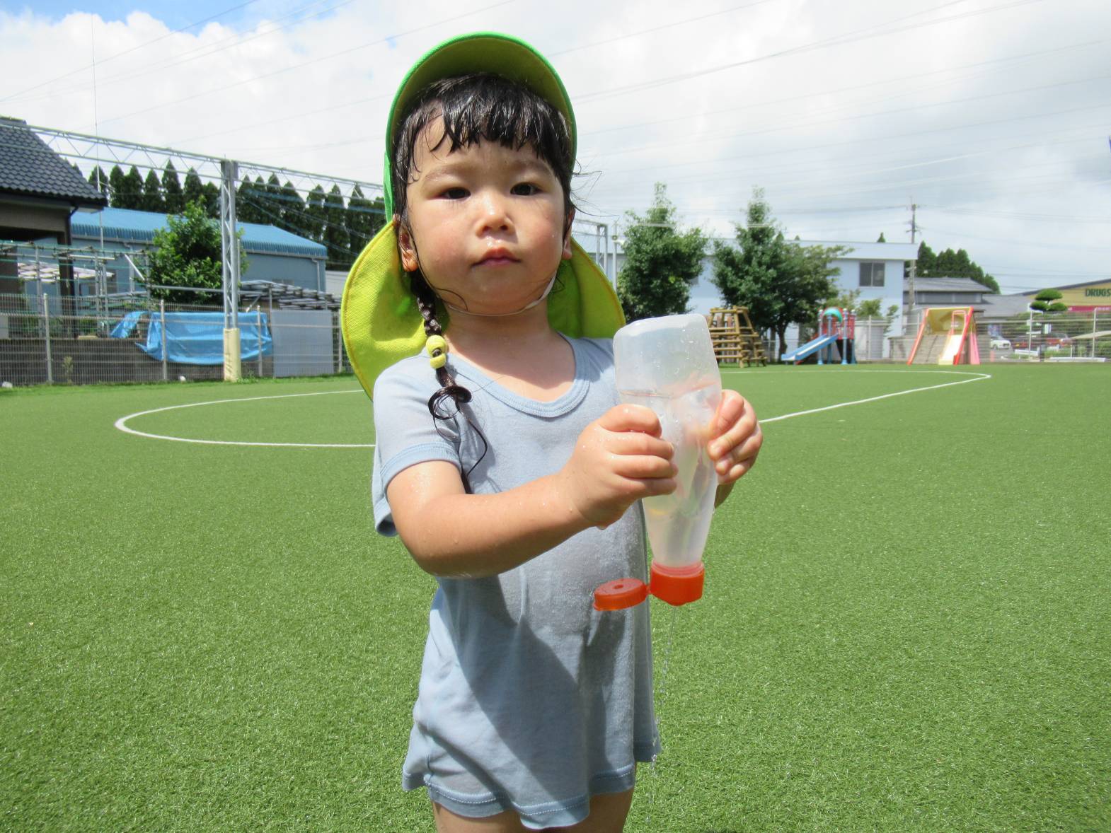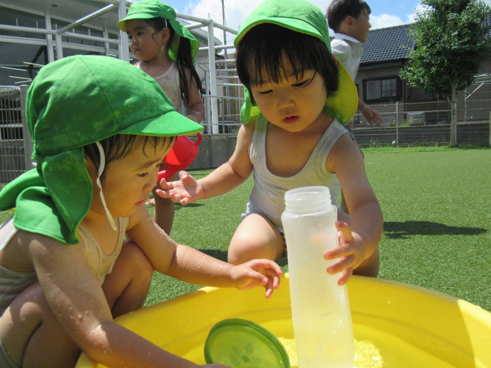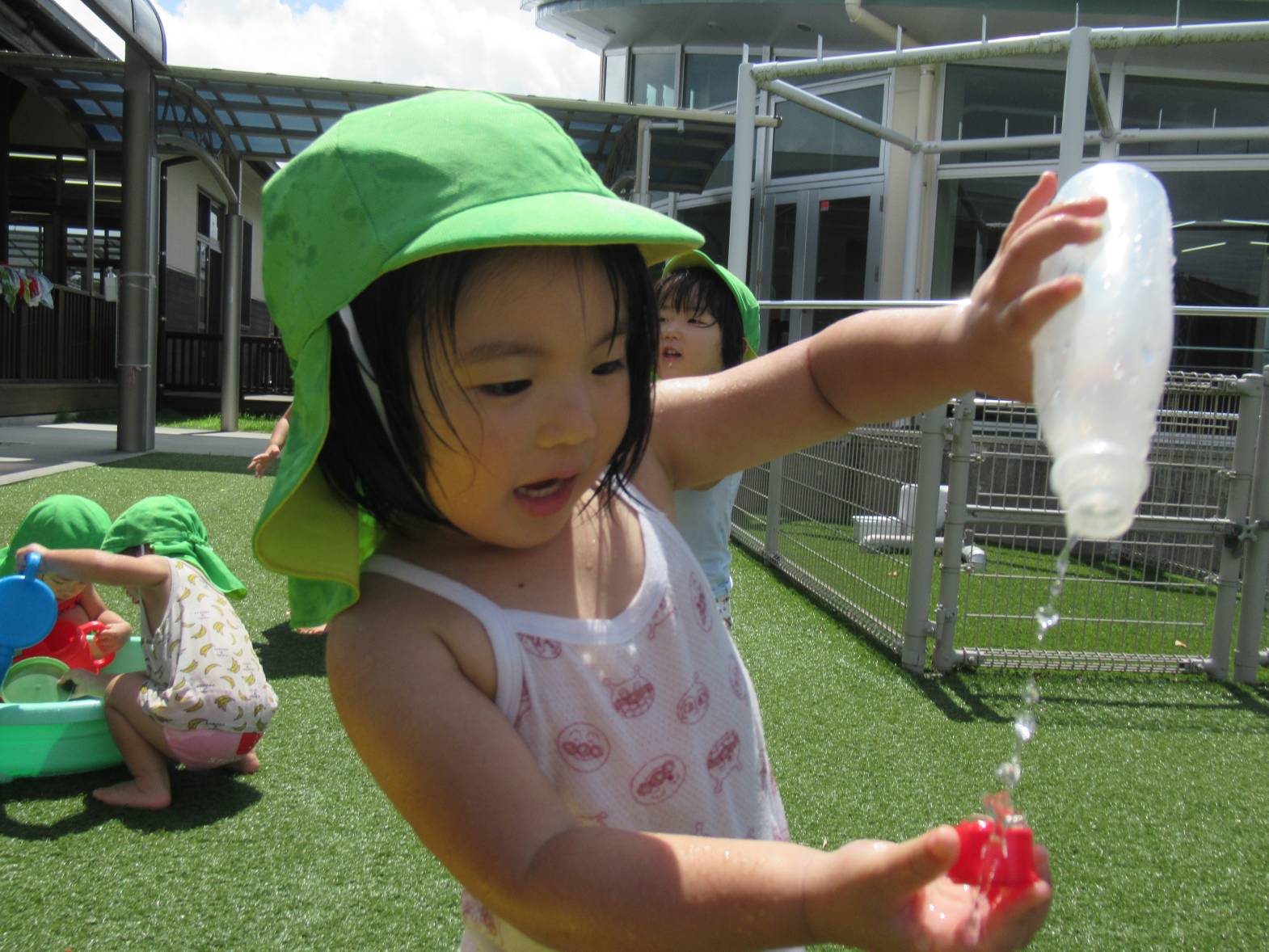 今月に入り、天気の良い日に子どもたちの大好きな水遊びをしています。 体に水がかかると、「キャー!冷たい!」とテンションが上がっている子どもたち。 桶に水を溜めると、ジョウロやマヨネーズの容器に水を入れ、保育者や友だちにかけることを楽しんでいます! 水に触れながら、夏の暑さを吹き飛ばしていけたらと思います。