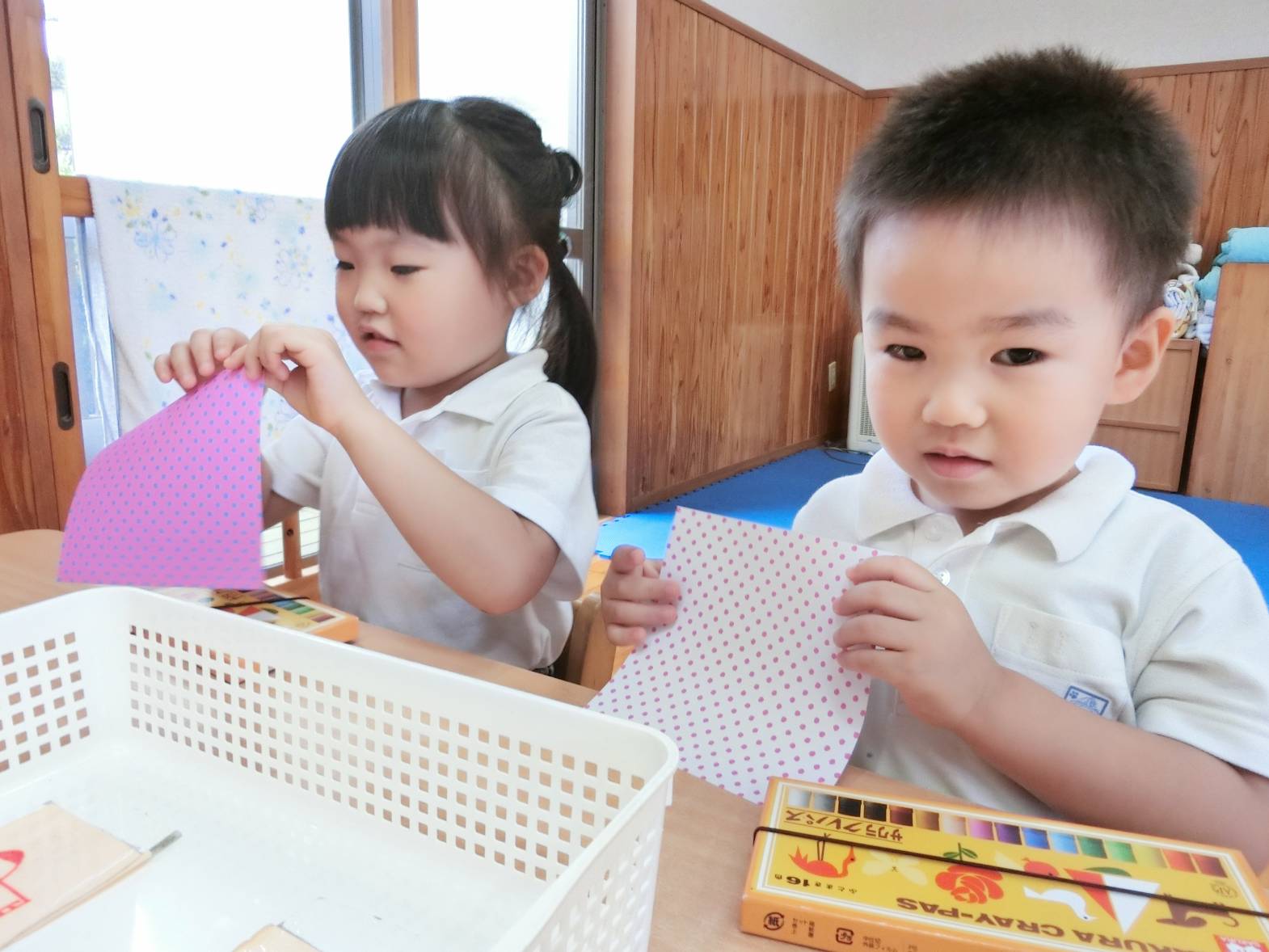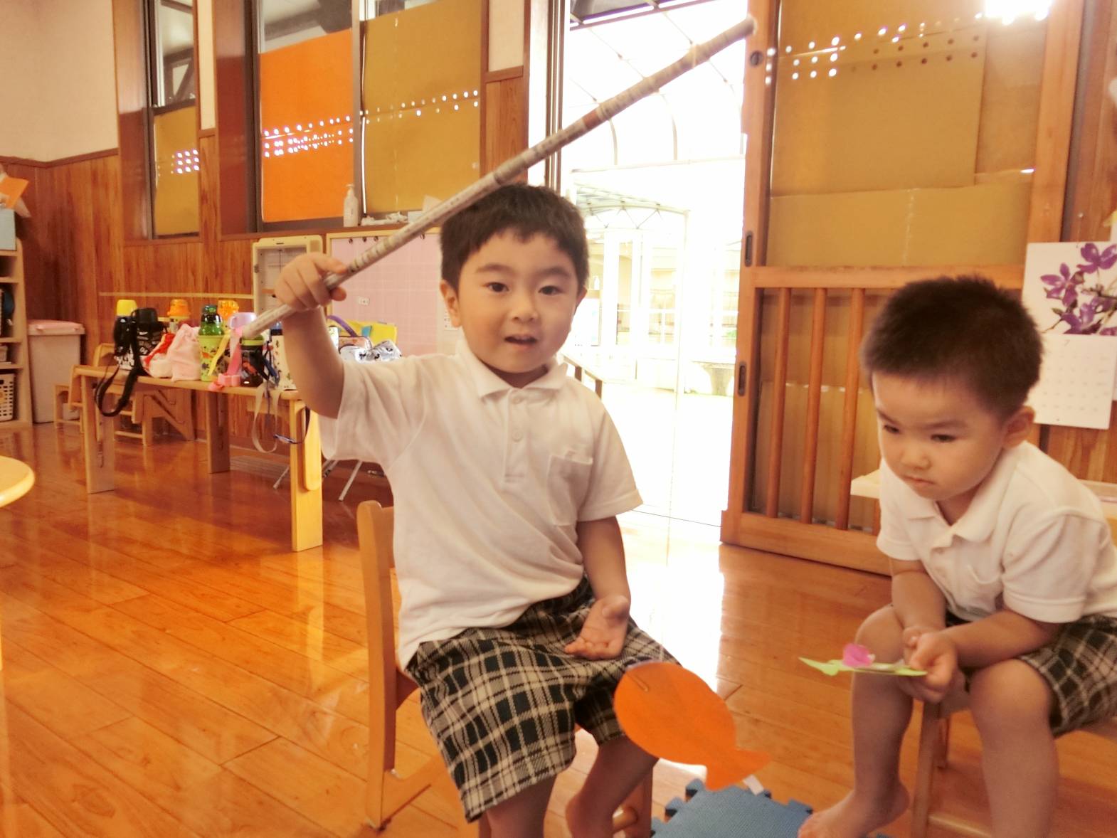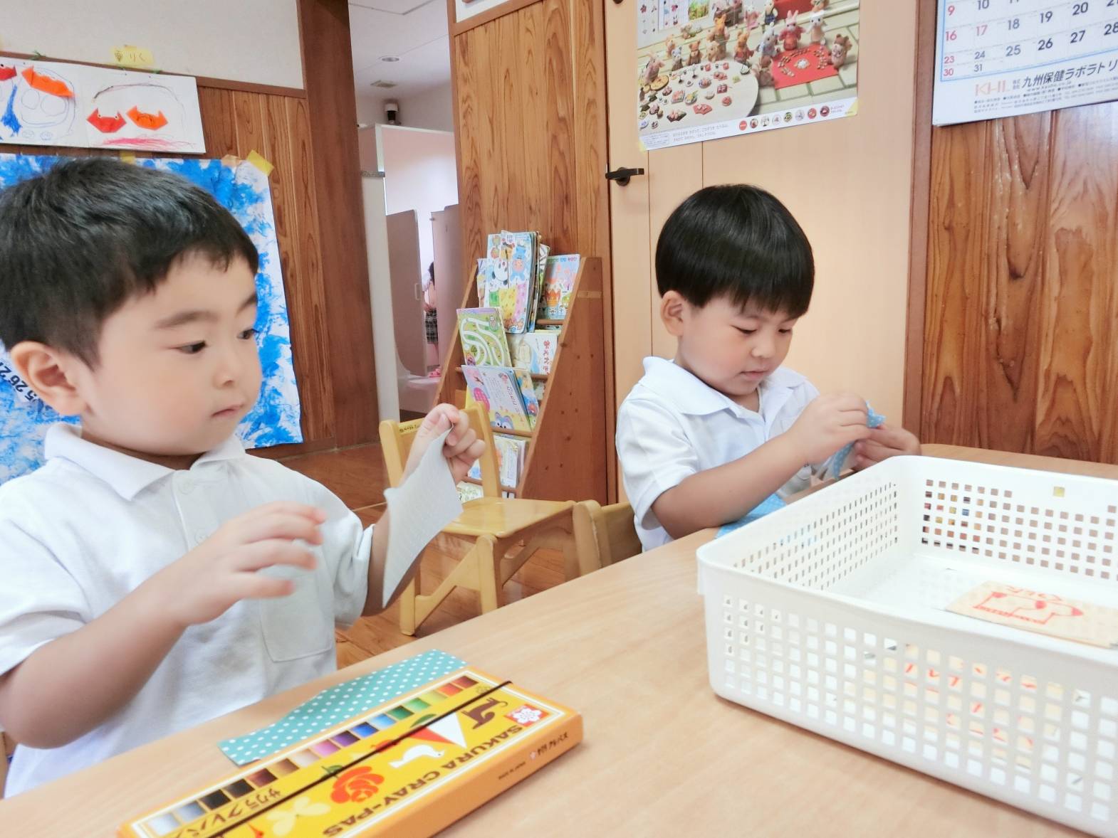 友だちと、「見て僕はこんな魚ができた。」、「今度は、黄色の魚にしたよ。」、「おんなじの作ろう♪」と友だちとの会話も弾みます。