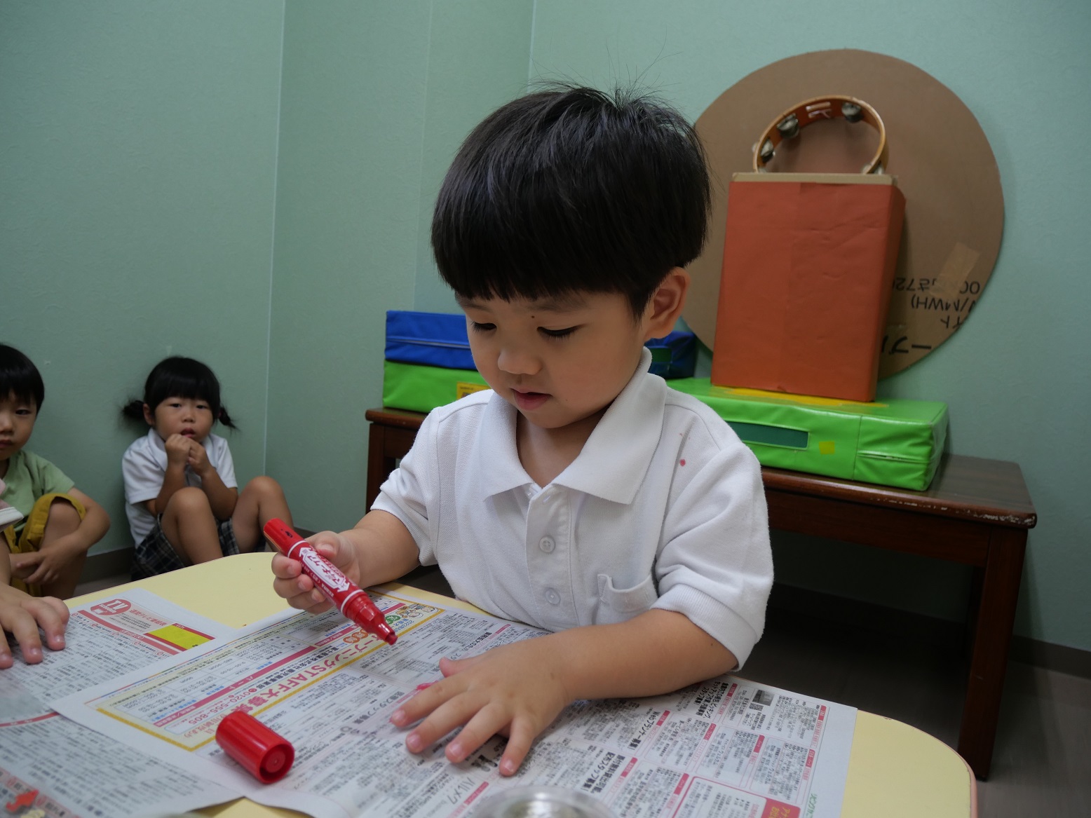 「僕は青でいっぱい描くよ。」「これはスイカだね。どこに貼ろうかな?」と、個性豊かな作品を作り上げていく姿が見られました。
