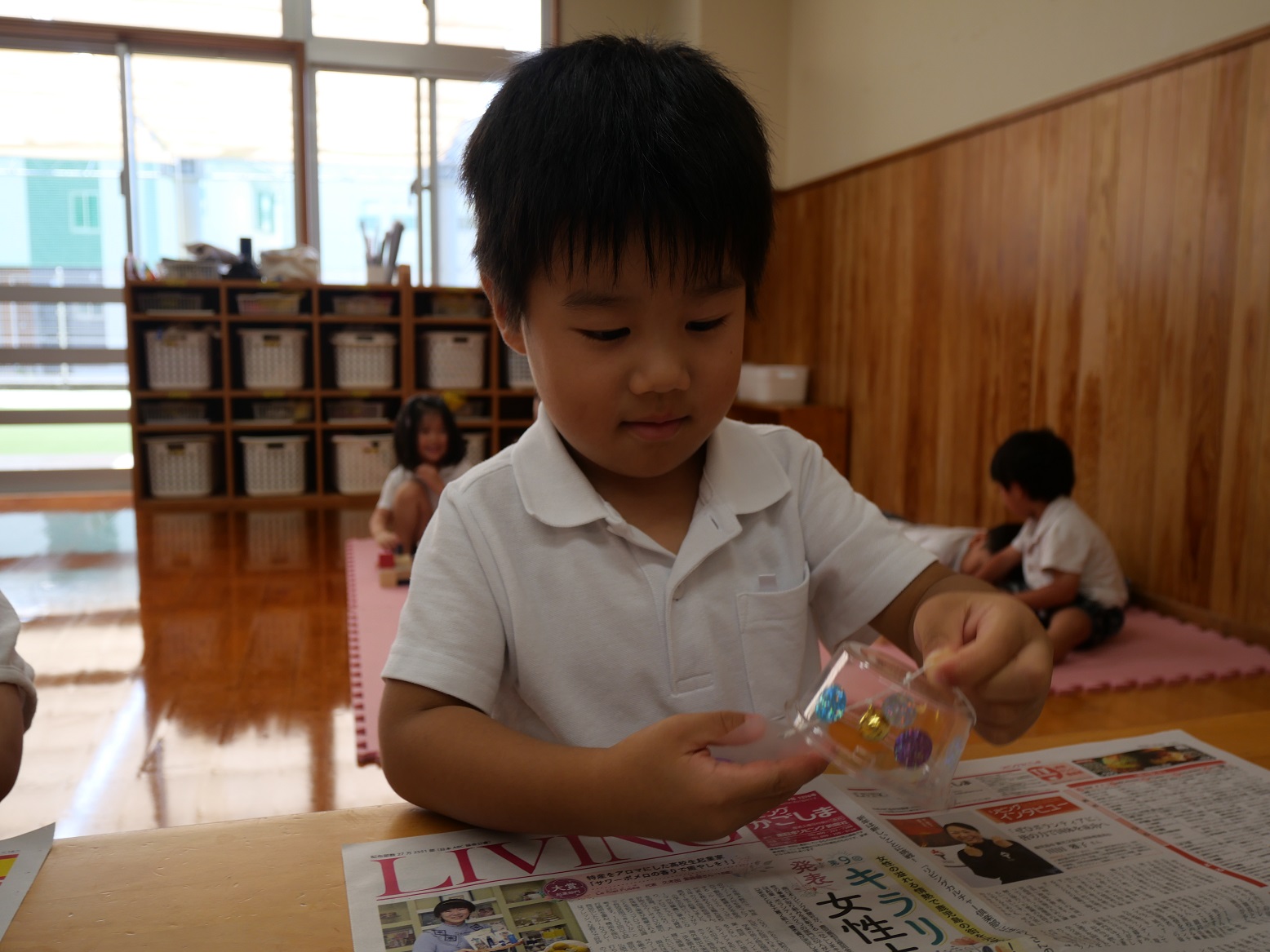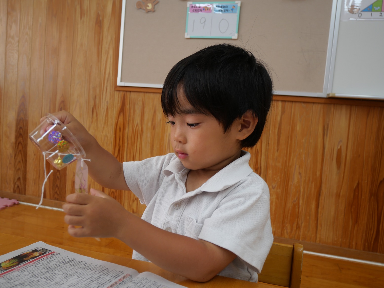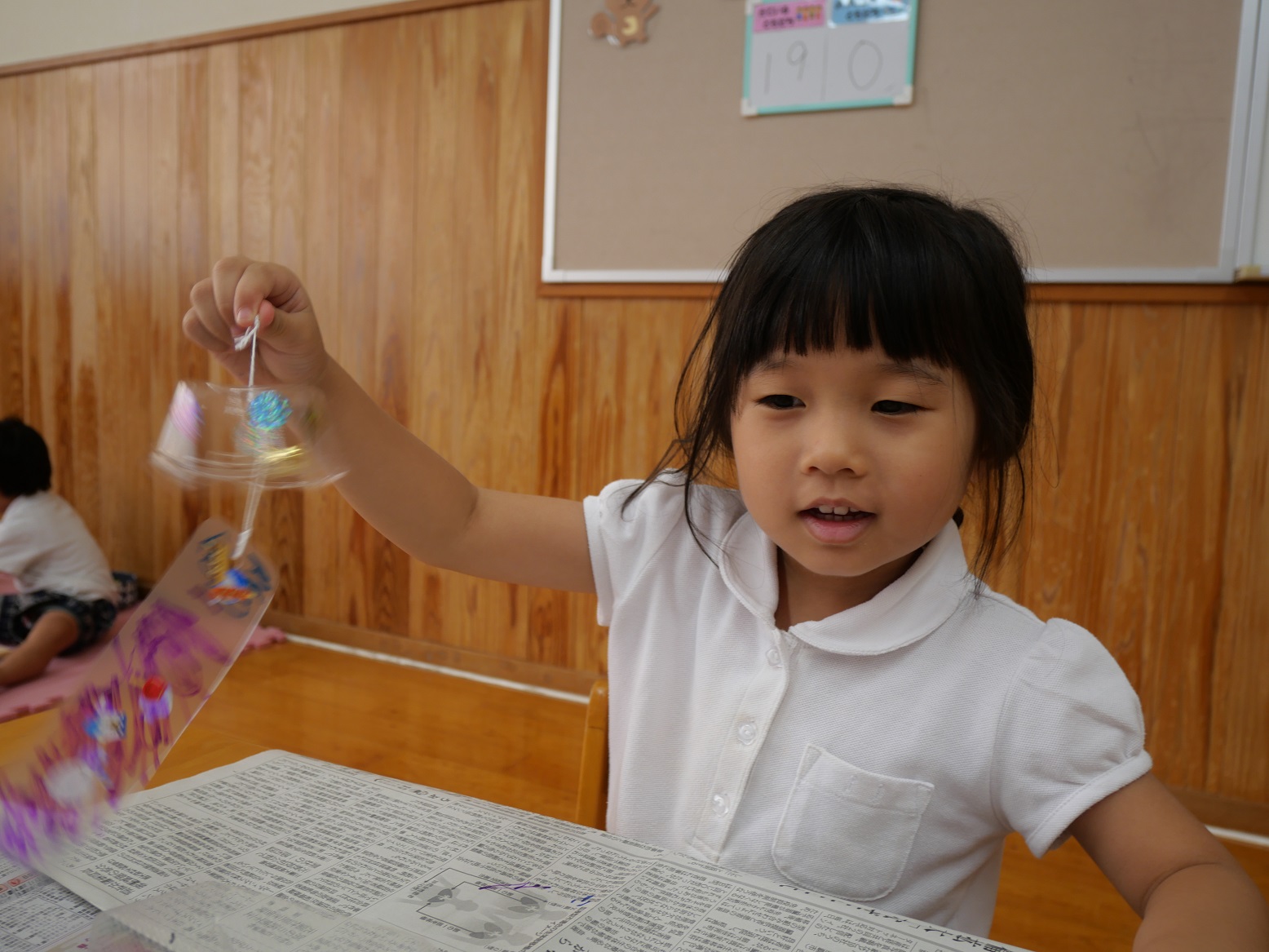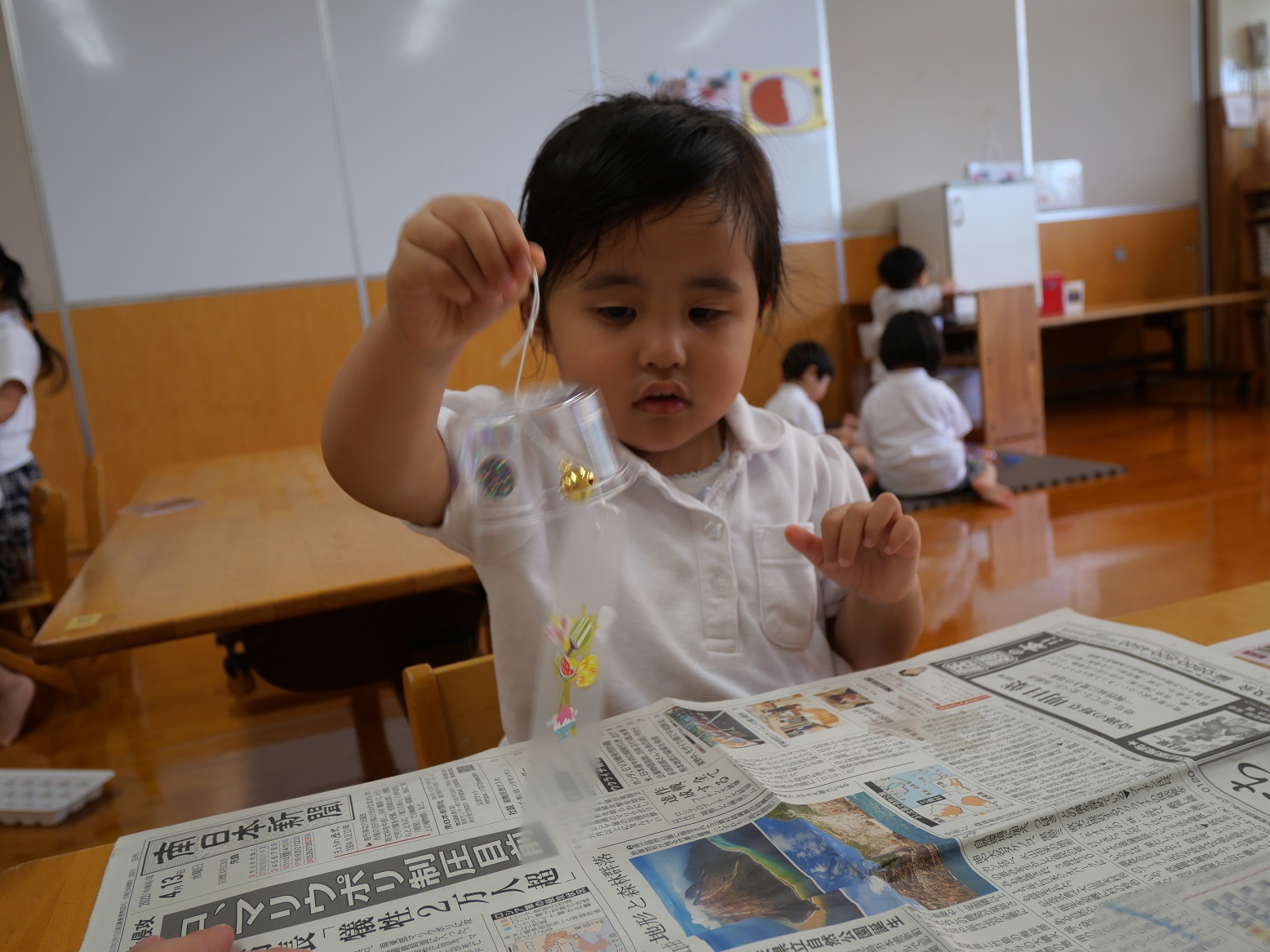 「わあー、聞こえるよ。」「もっともっと鳴らしてみよう!」と、自分の作った風鈴から聞こえる鈴の音に大興奮のりす組さんでした。