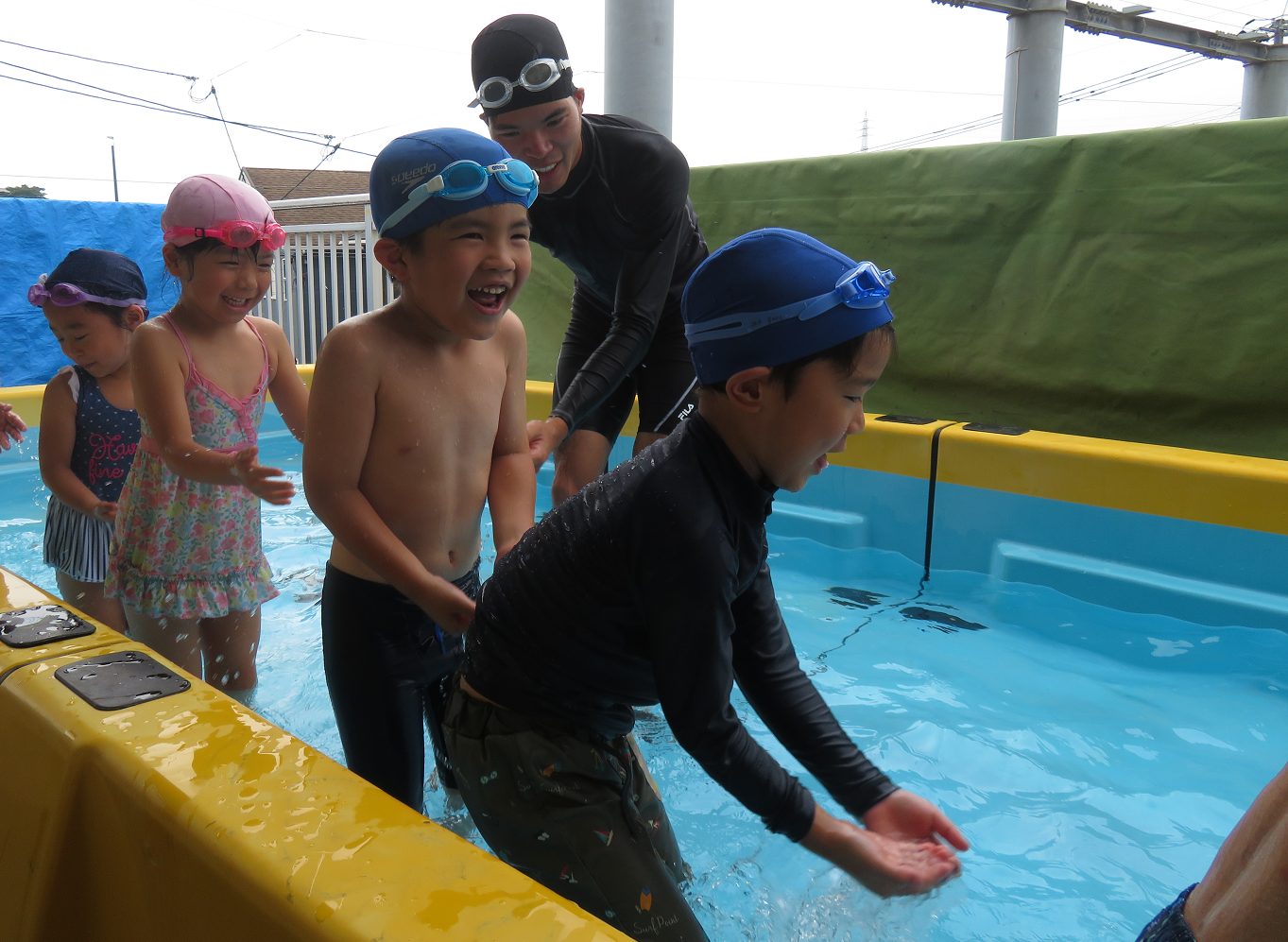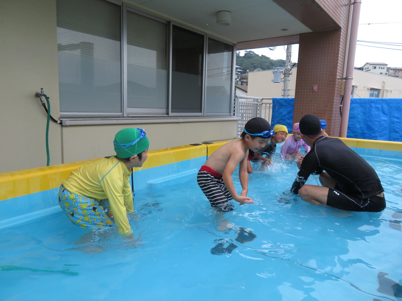 プールに入って始めは手や腕、お腹をごしごし。友だちの背中に水をかけてごしごし。