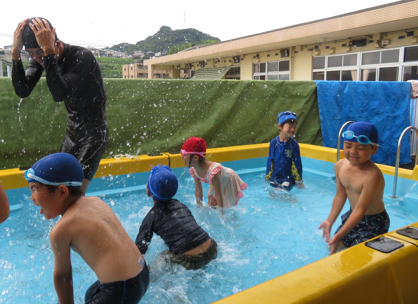 水の掛け合いっこでは、「わー冷たい。」「先生くらえー!」と白熱した掛け合いが見られました。