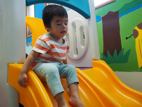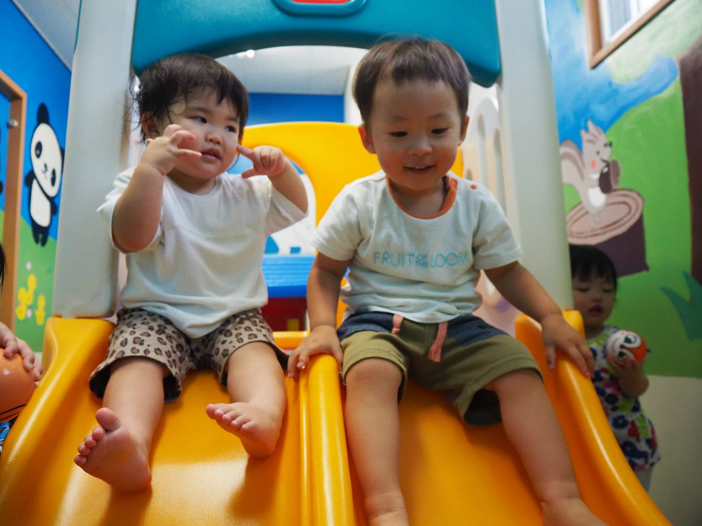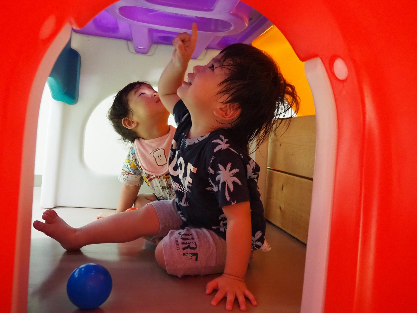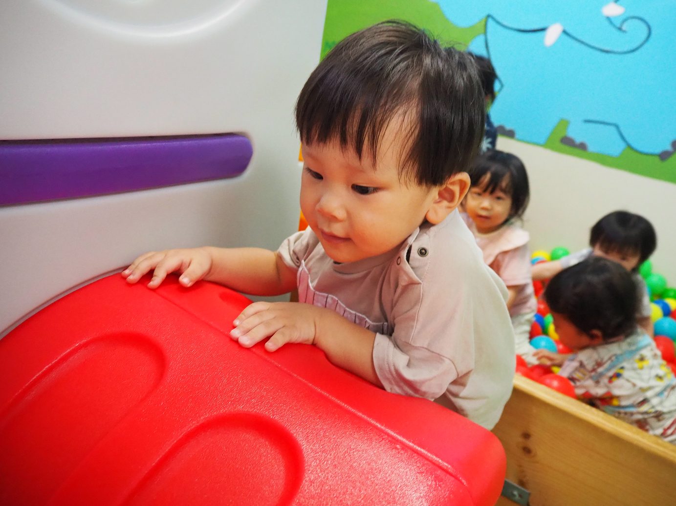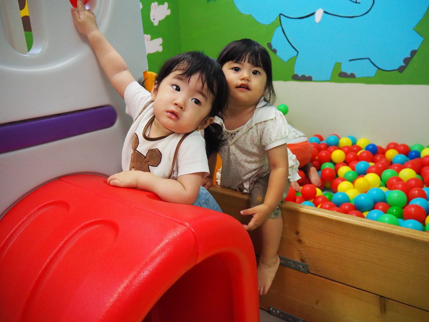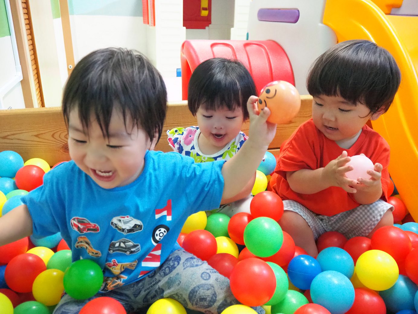 ボールの部屋で遊ぶことが大好きな子どもたち。ボールプールの中で泳いだり音を楽しんだりする姿が見られます。 色にも興味を持ち、「あか!」、「あおー!ポーン」と投げたり、赤のボールをりんごに見立てて壁に描いている絵に向かってご飯をあげるように上手に投げたりと楽しむこあら組さん。 腕や手の力もついてきて遠くまで飛ばすことができるようになってきました。 暑さに負けないほど元気いっぱい体を動かし、楽しむ子どもたちでした。