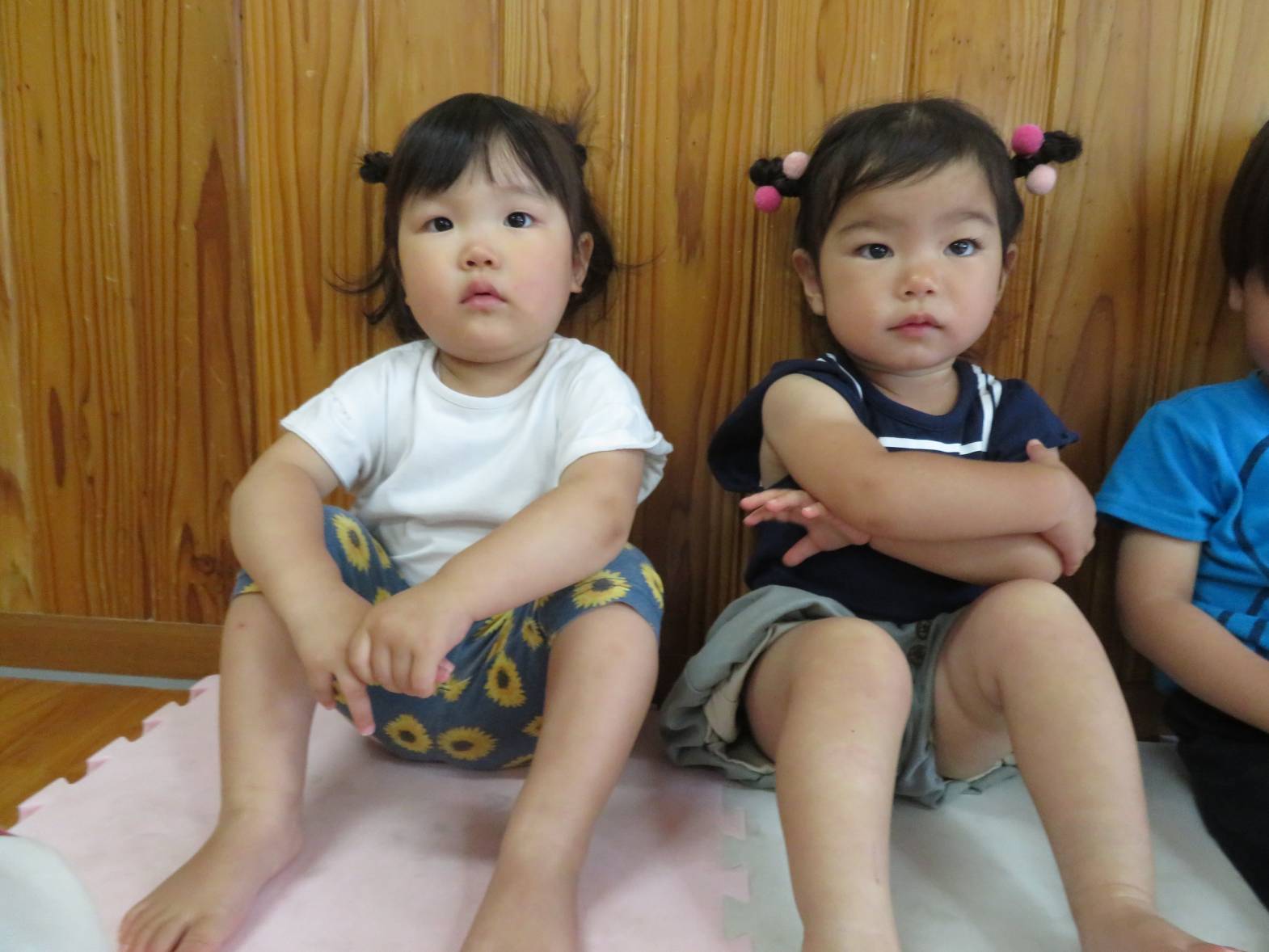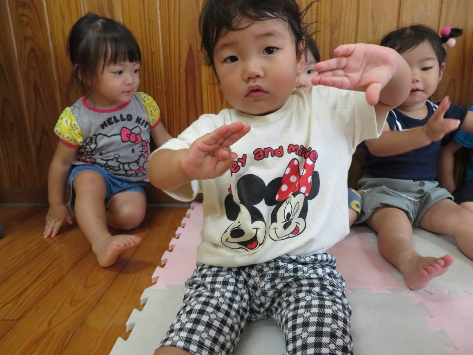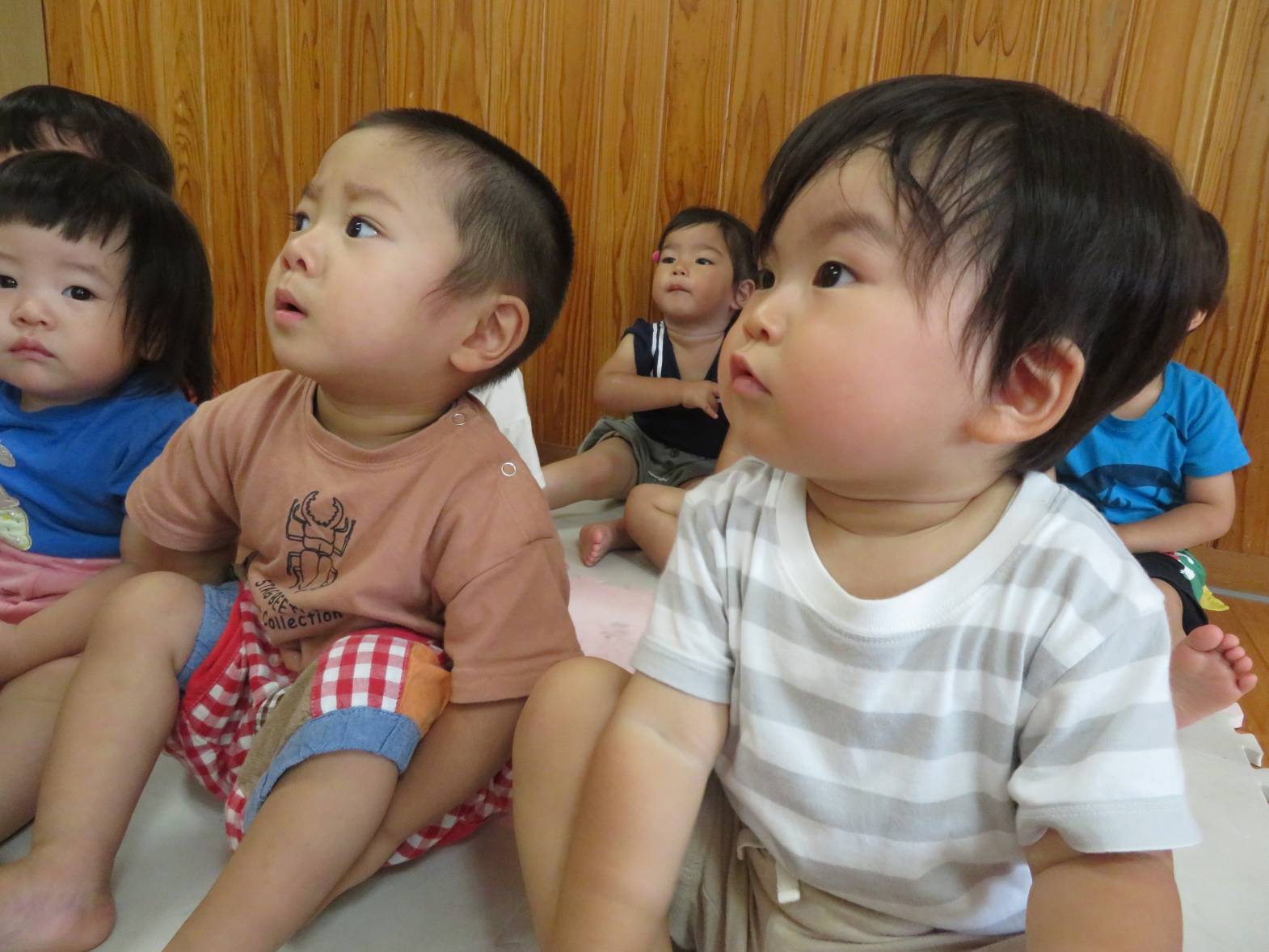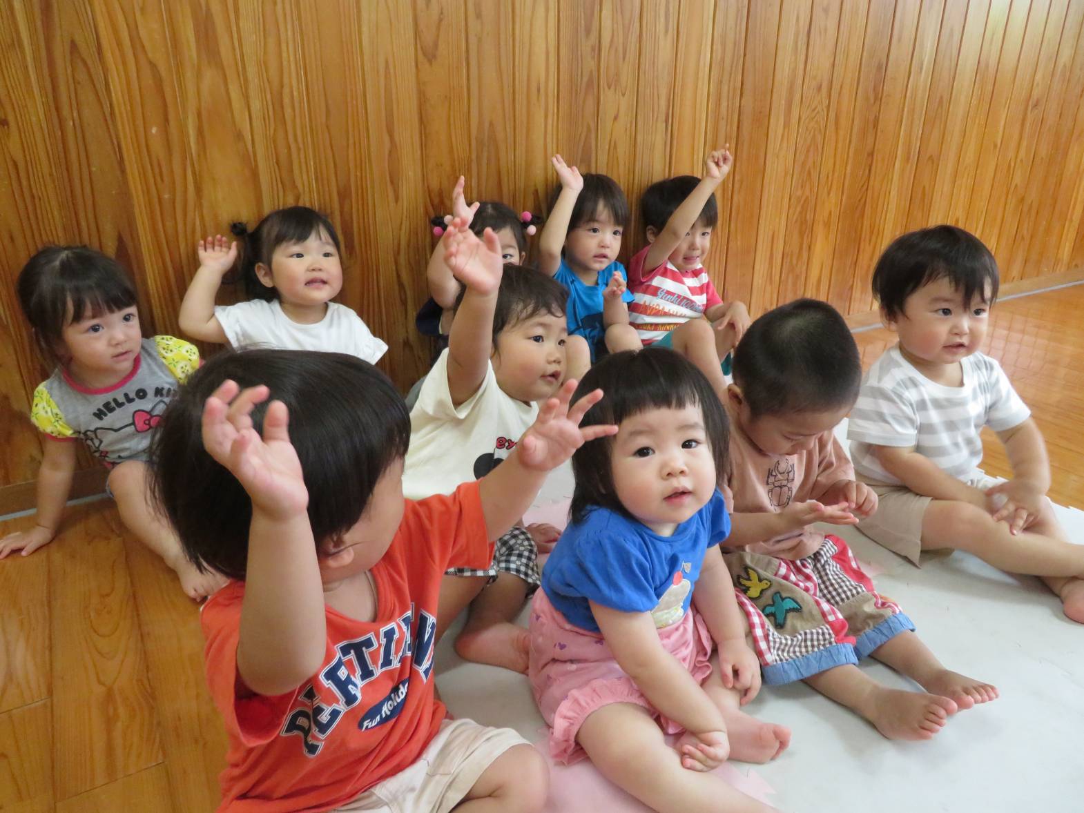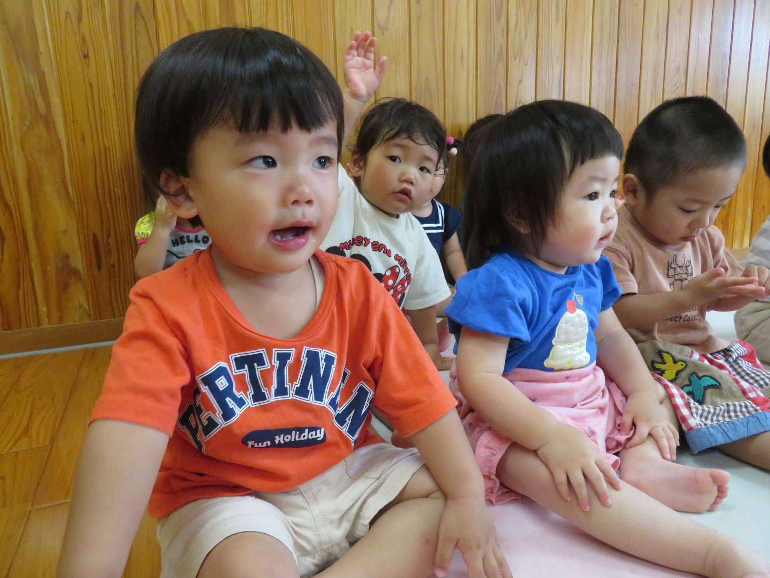 朝夕の集まりでは、保育者が「手はおひざ!」と言うと、「ぴっ!」と、手を膝に置いて、かっこいい姿勢を見せてくれるこあら組さん! 絵本や指遊びでは、保育者の真似をして指遊びを楽しんだり、集中して見たりする姿が見られます。 また、「こあらぐみさ~ん!」と呼ぶと、「は~い!」と元気よく返事をする子どもたちです。 日々の集まりを通して、いろいろな言葉を知ったり、できることが増えたりと、少しずつ成長しているこあら組さんでした☆