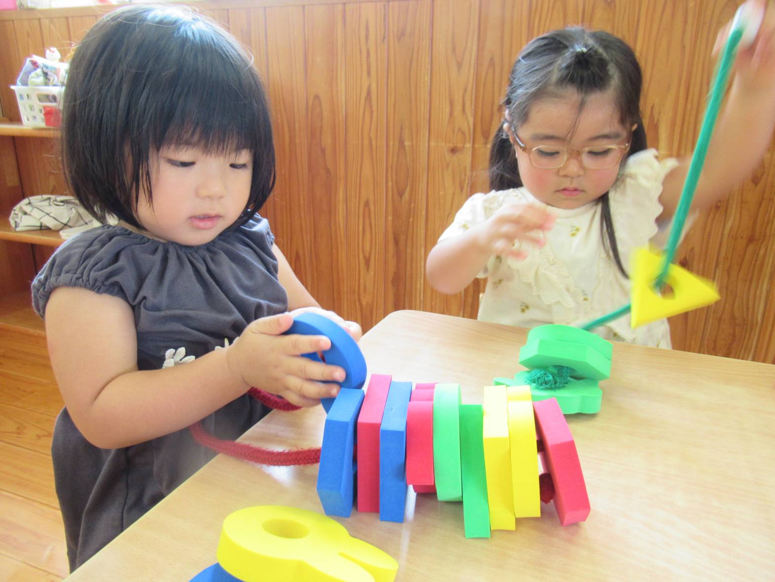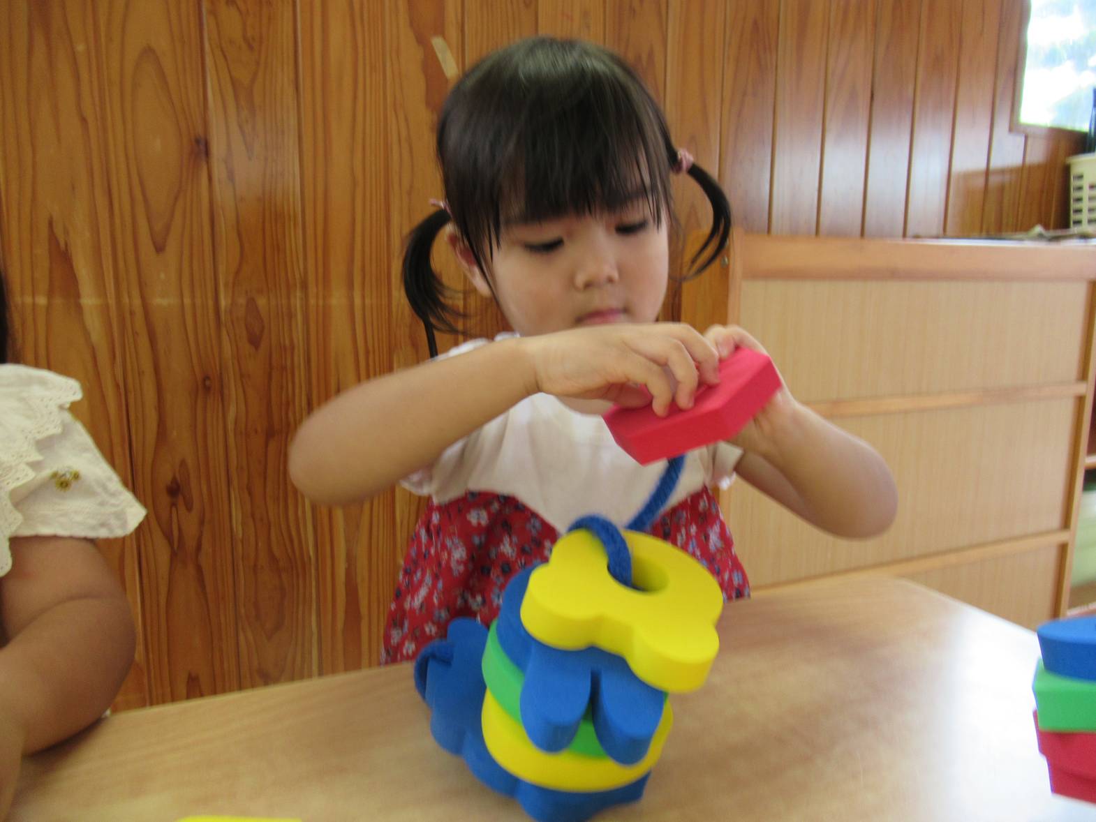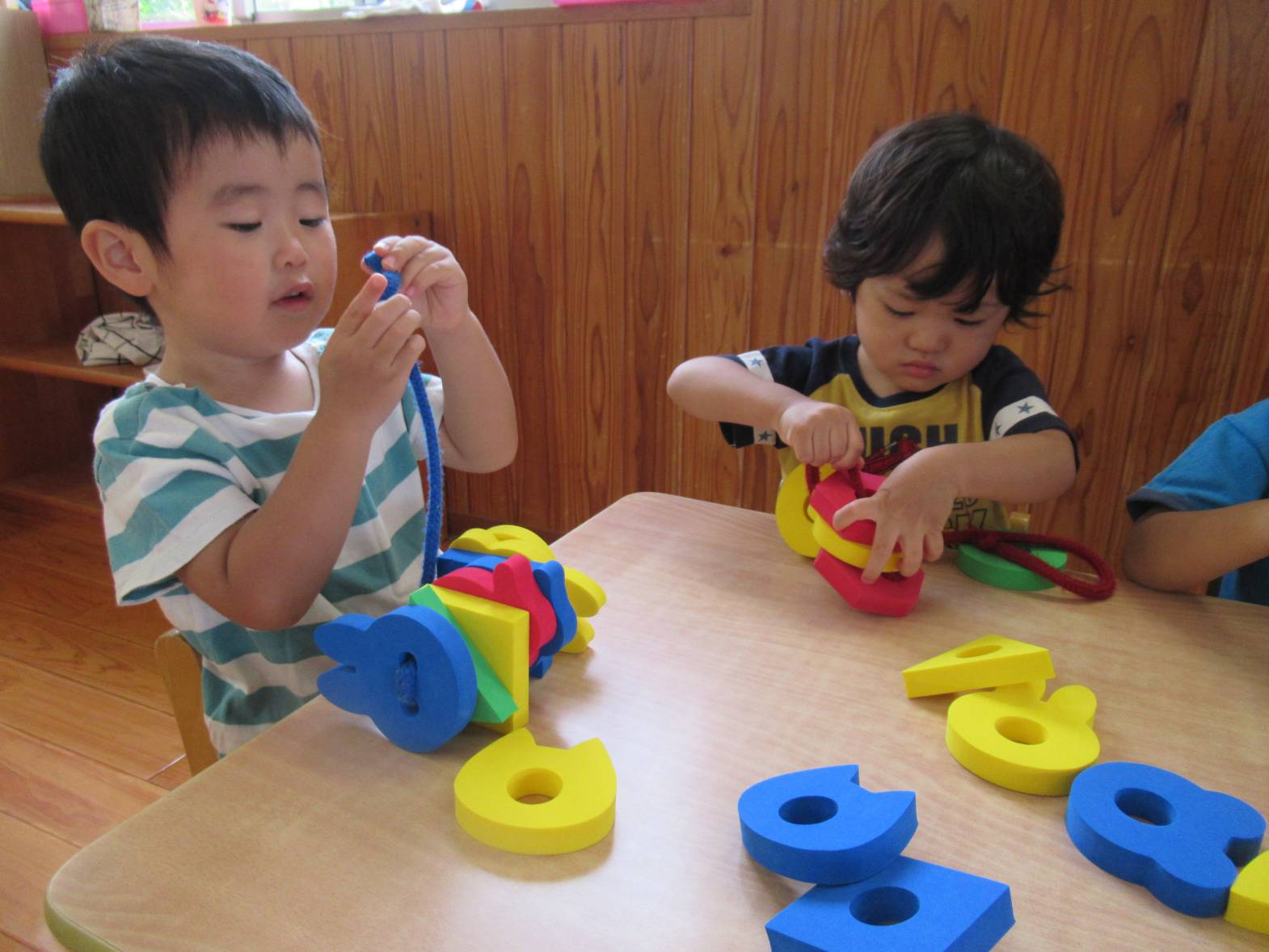 机上遊びでは、ひも通しを定期的に取り組んでいます。 「見て!たくさんできたよ!」と色々な形の穴の開いたパーツにひもを通していく子どもたち。 色々な形のパーツがあるため、組み合わせたり、積み重ねたりと一つの玩具から様々な遊び方を楽しんでいます。 また、「赤集める!」、「うさぎの形だね!」と色や形にも興味を示している様子が見られます。遊びを通して、色や形の知識も身に付けていけたらと思います。